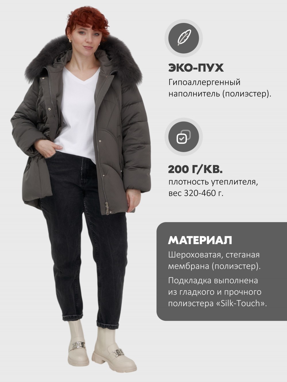 - Особенности модели: быстросохнущая, ветрозащита, водоотталкивающий материал, гипоаллергенный материал, дышащий материал, съемная опушка