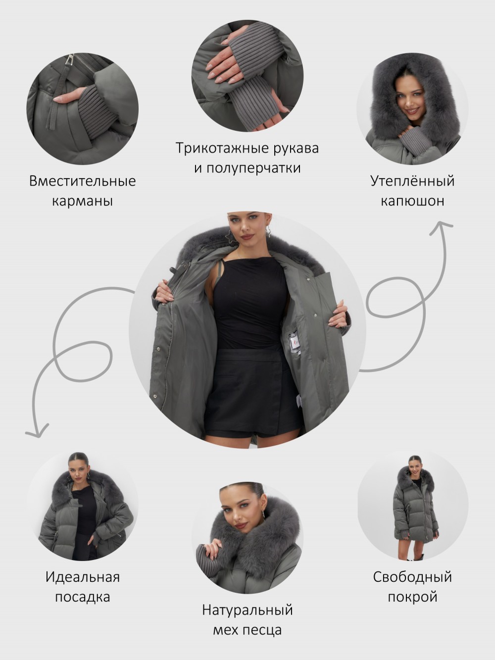 - Декоративные элементы: Вырез для пальца, Манжеты, Заклепки, Мех