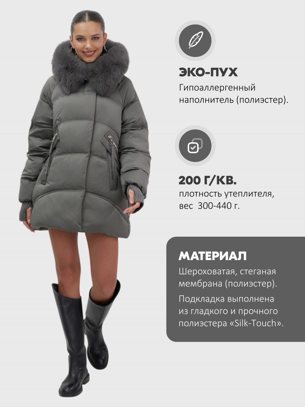 - Особенности модели: быстросохнущая, ветрозащита, водоотталкивающий материал, гипоаллергенный материал, дышащий материал, съемная опушка