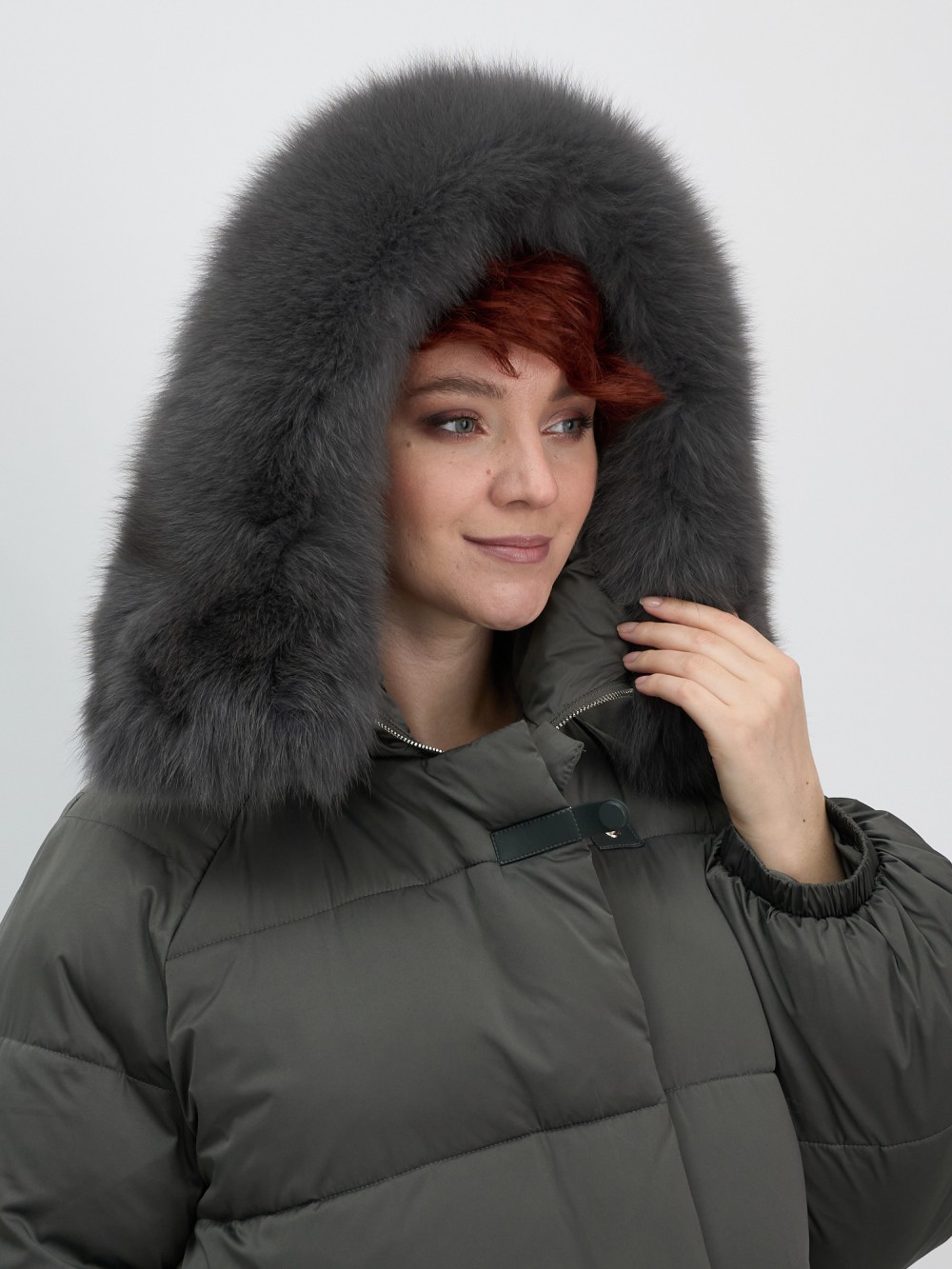 Куртка зимняя женская с мехом и капюшоном тренд темно-зеленого цвета 7639TZ