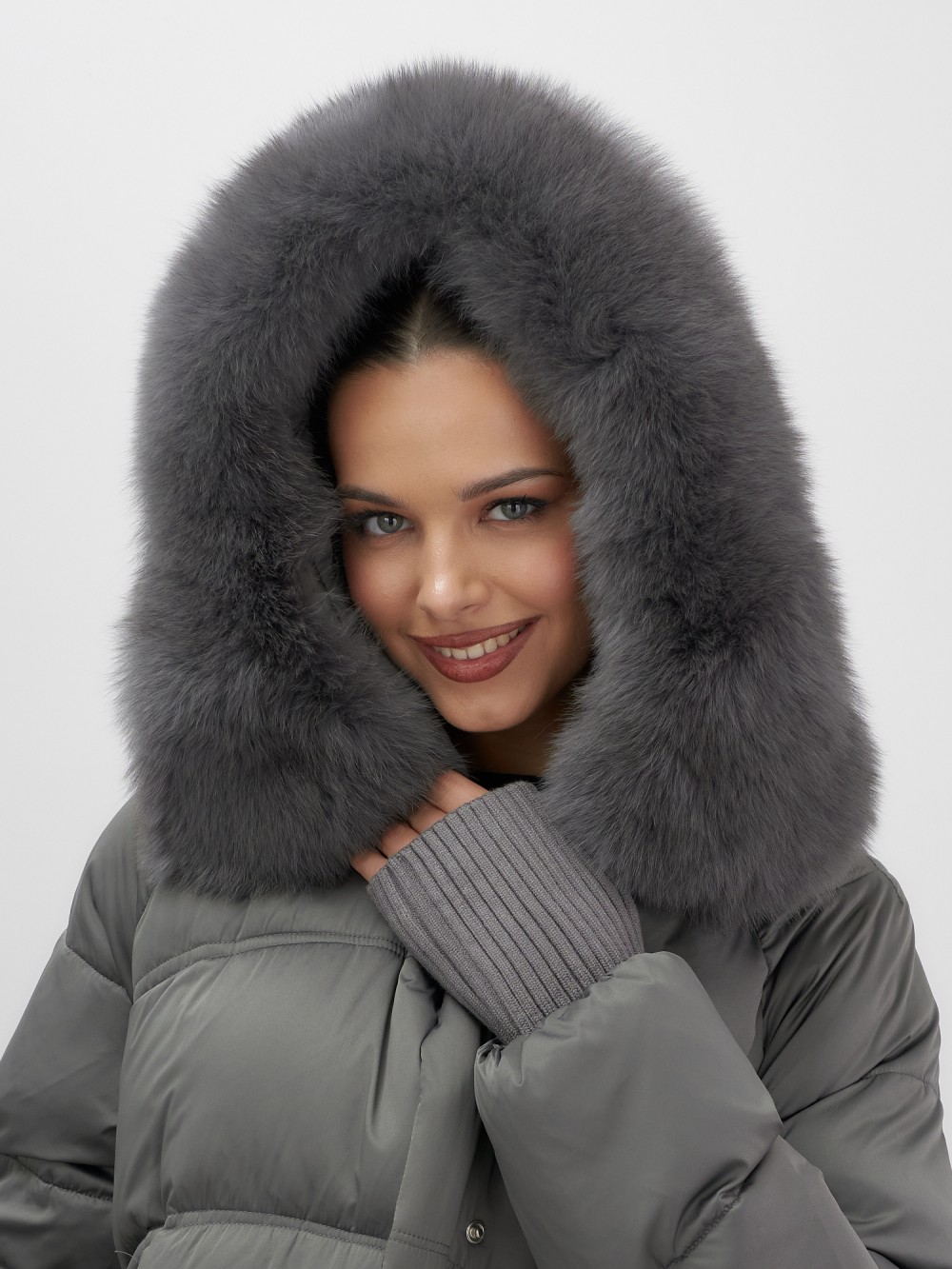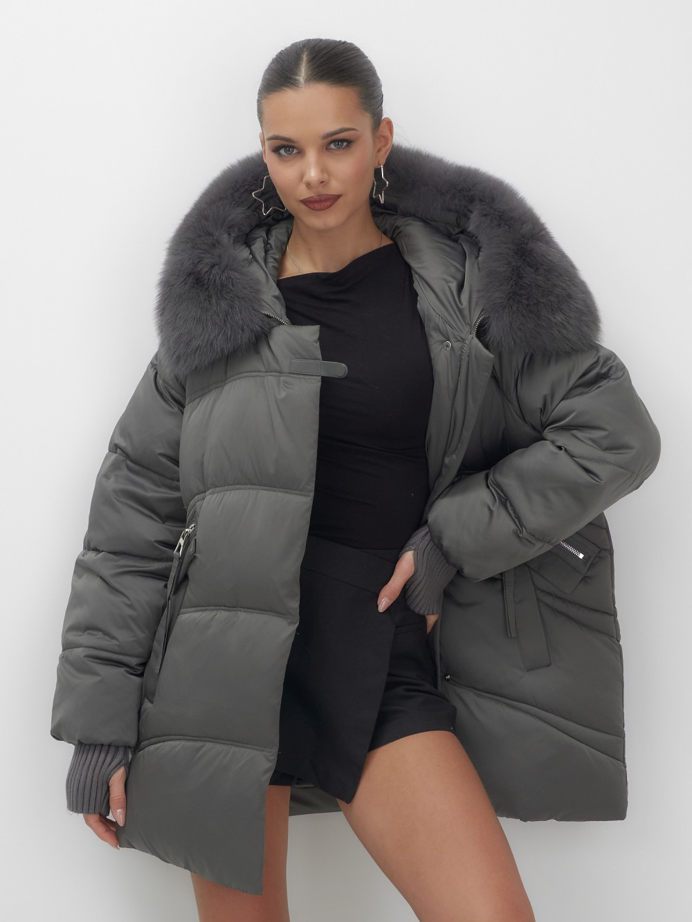 Куртка зимняя женская с мехом и капюшоном тренд темно-зеленого цвета 7737TZ