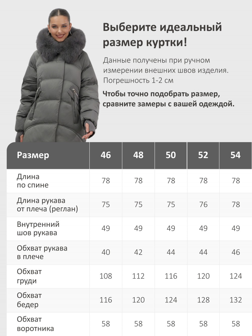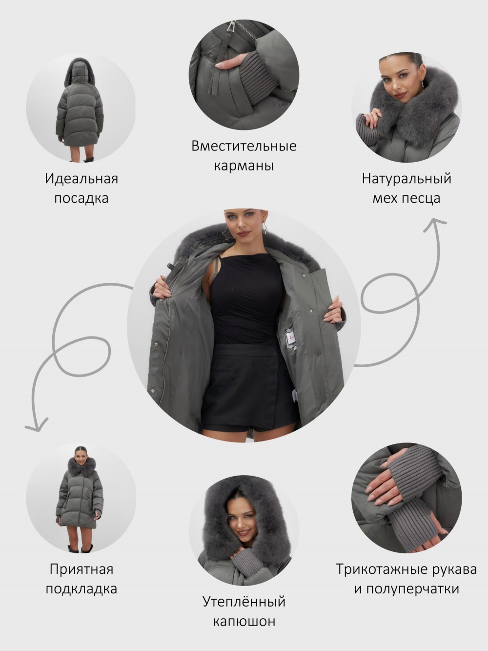 Пять трендовых оттенков сезона осень-зима 2025 – глубокий черный, благородный коричневый, нежный светло-коричневый, изысканный темно-зеленый и элегантный бежевый – идеально сочетаются с роскошным мехом песца. Удлиненный силуэт до колена и свободный крой создают идеальные пропорции для размеров 46-54.