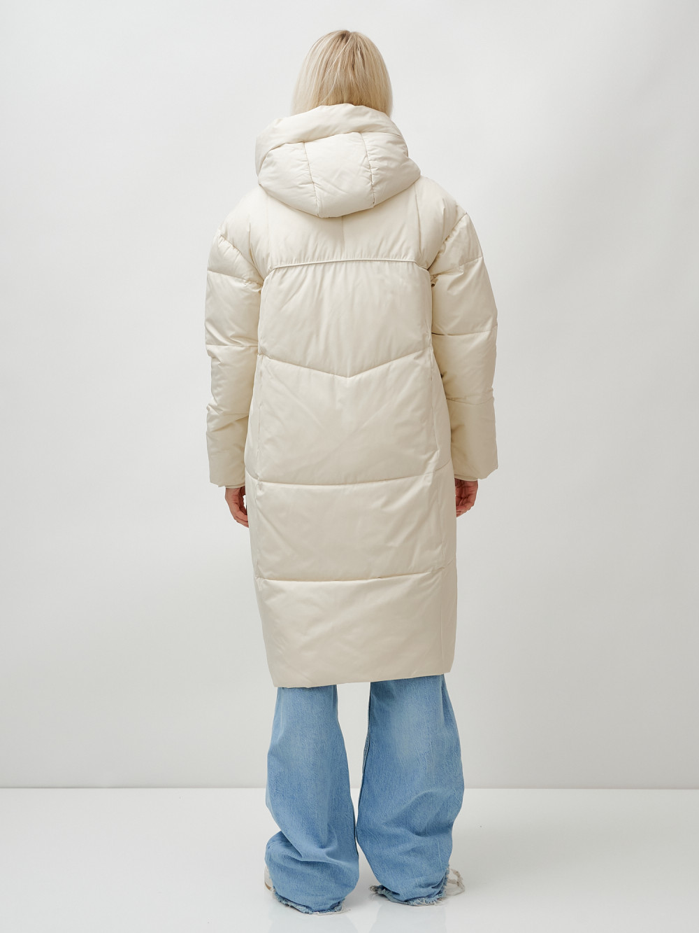 Пальто летучая мышь женское с капюшоном зимнее бежевого цвета 9616B