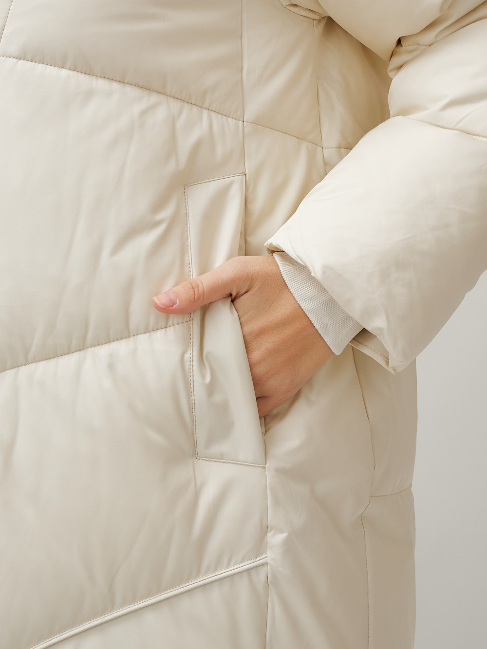 — Несъемный капюшон: Этот элемент обеспечивает надежную защиту от непогоды. Он гармонично вписывается в общий дизайн пальто и создает уютное укрытие в холодные дни.