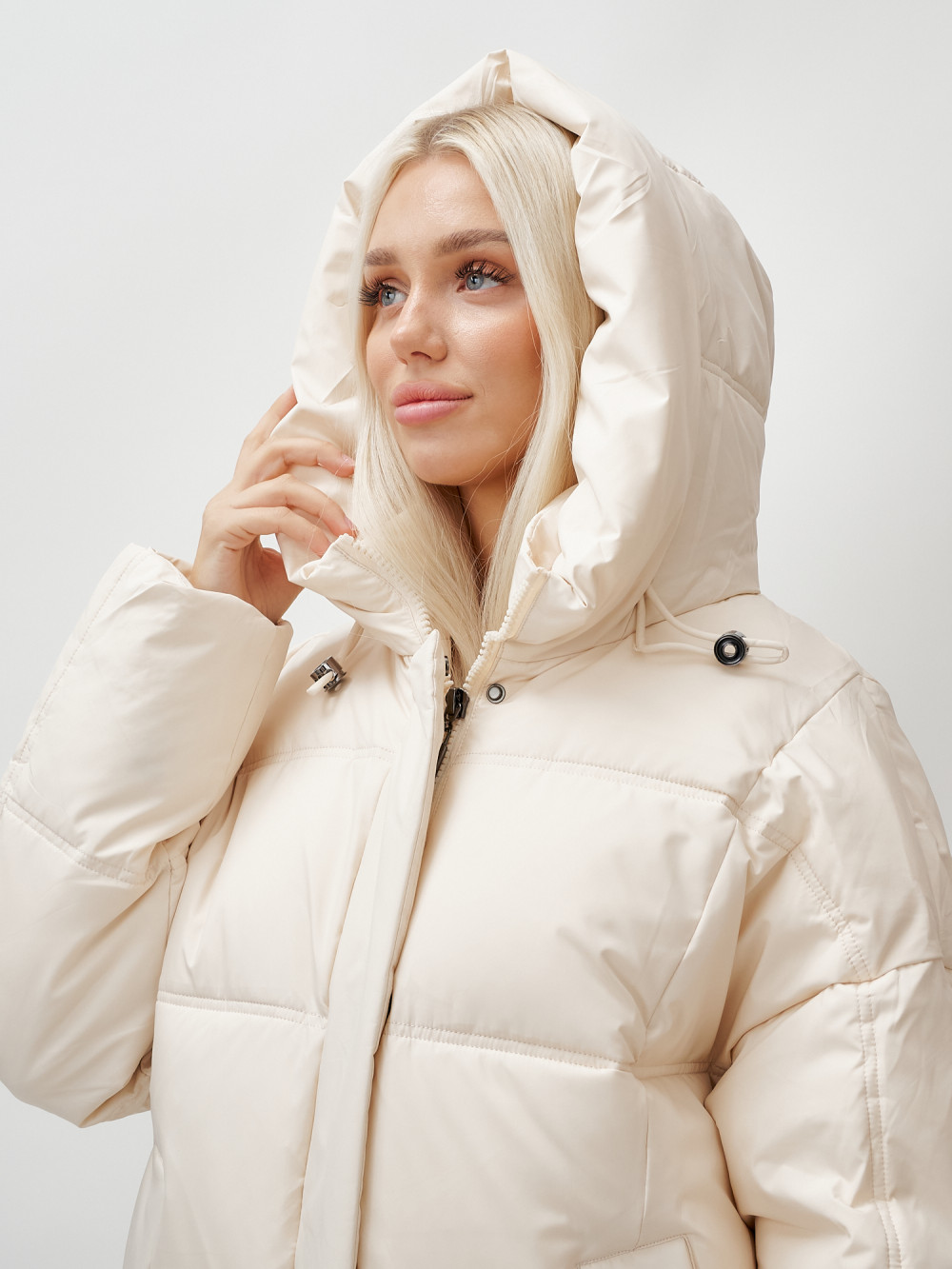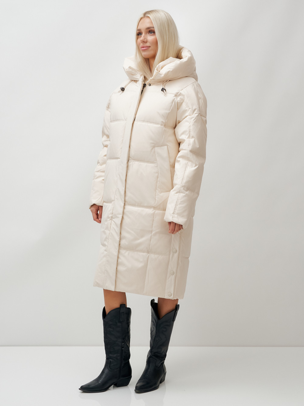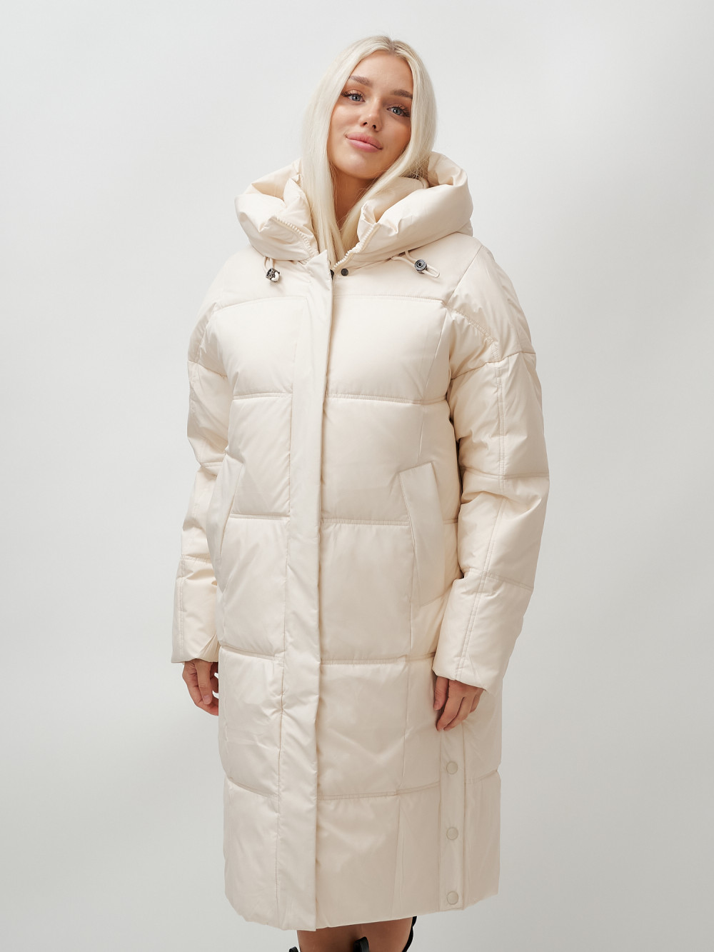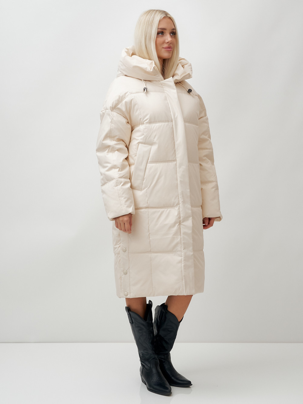 Пальто летучая мышь женское с капюшоном зимнее бежевого цвета 9619B — MTFORCE