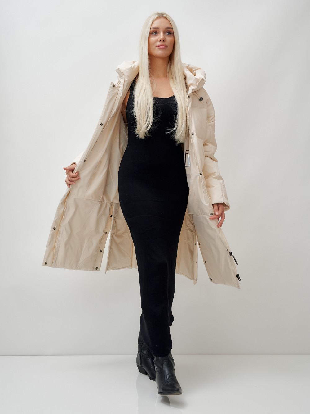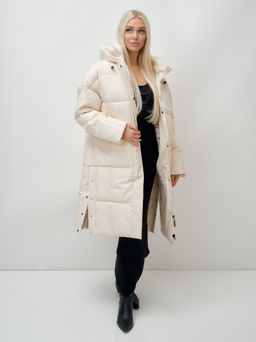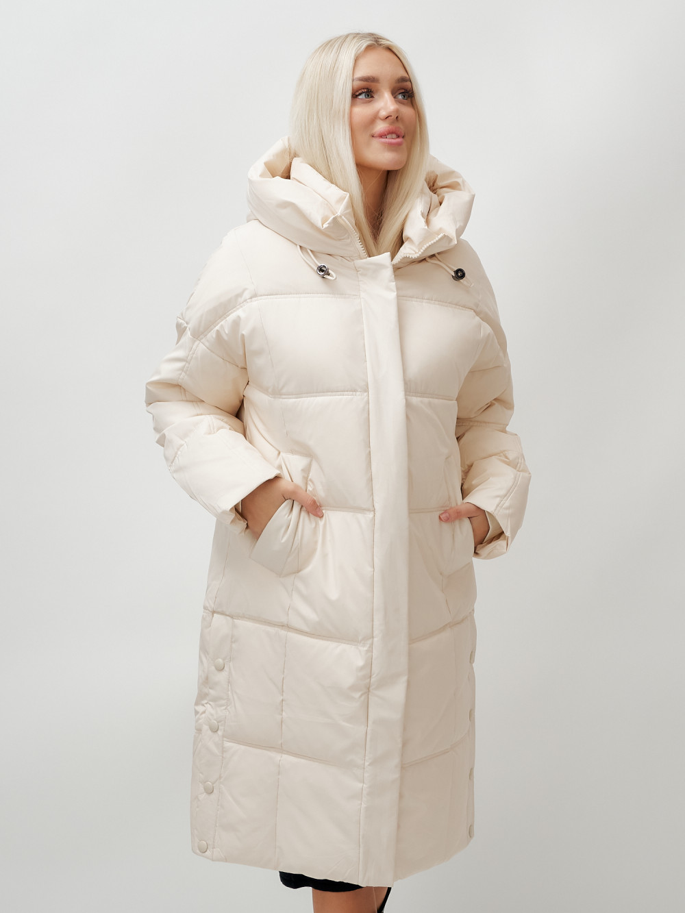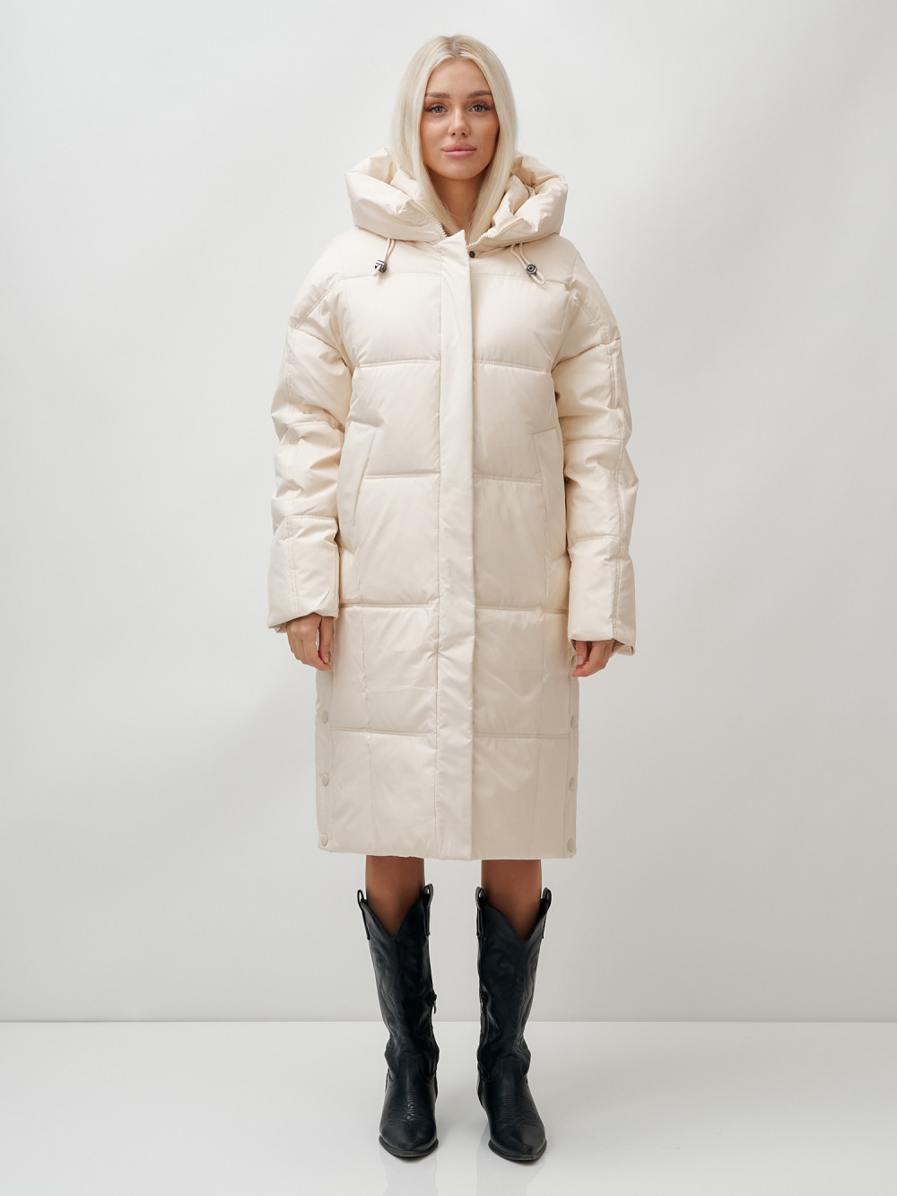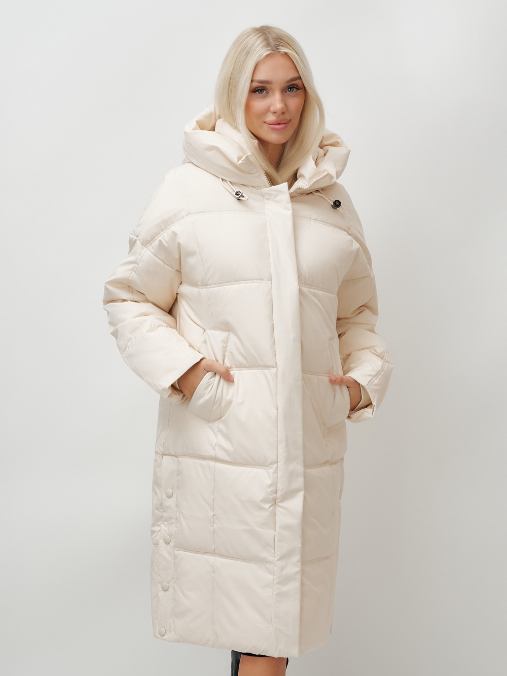 Пальто летучая мышь женское с капюшоном зимнее бежевого цвета 9619B — MTFORCE