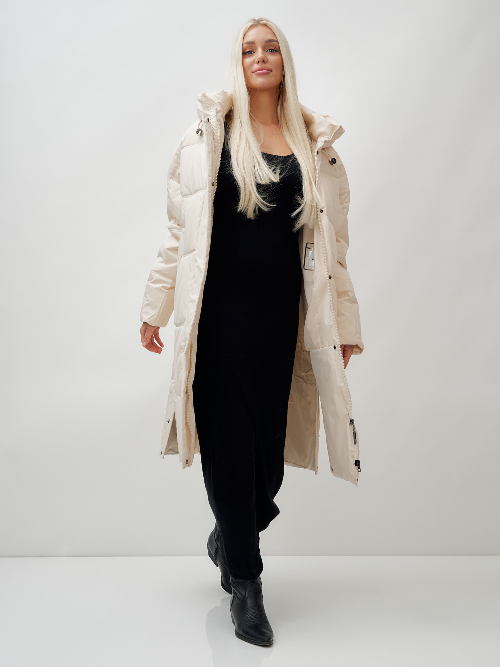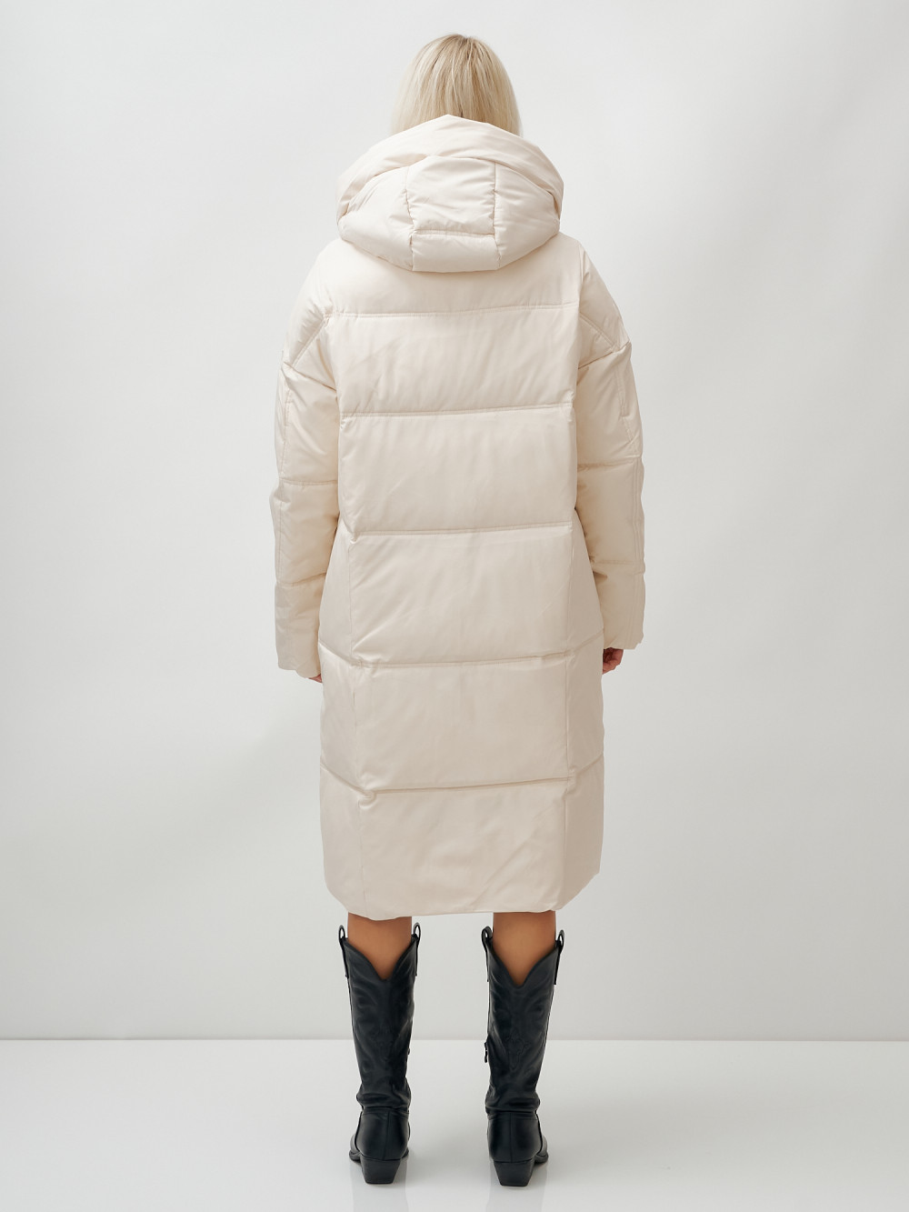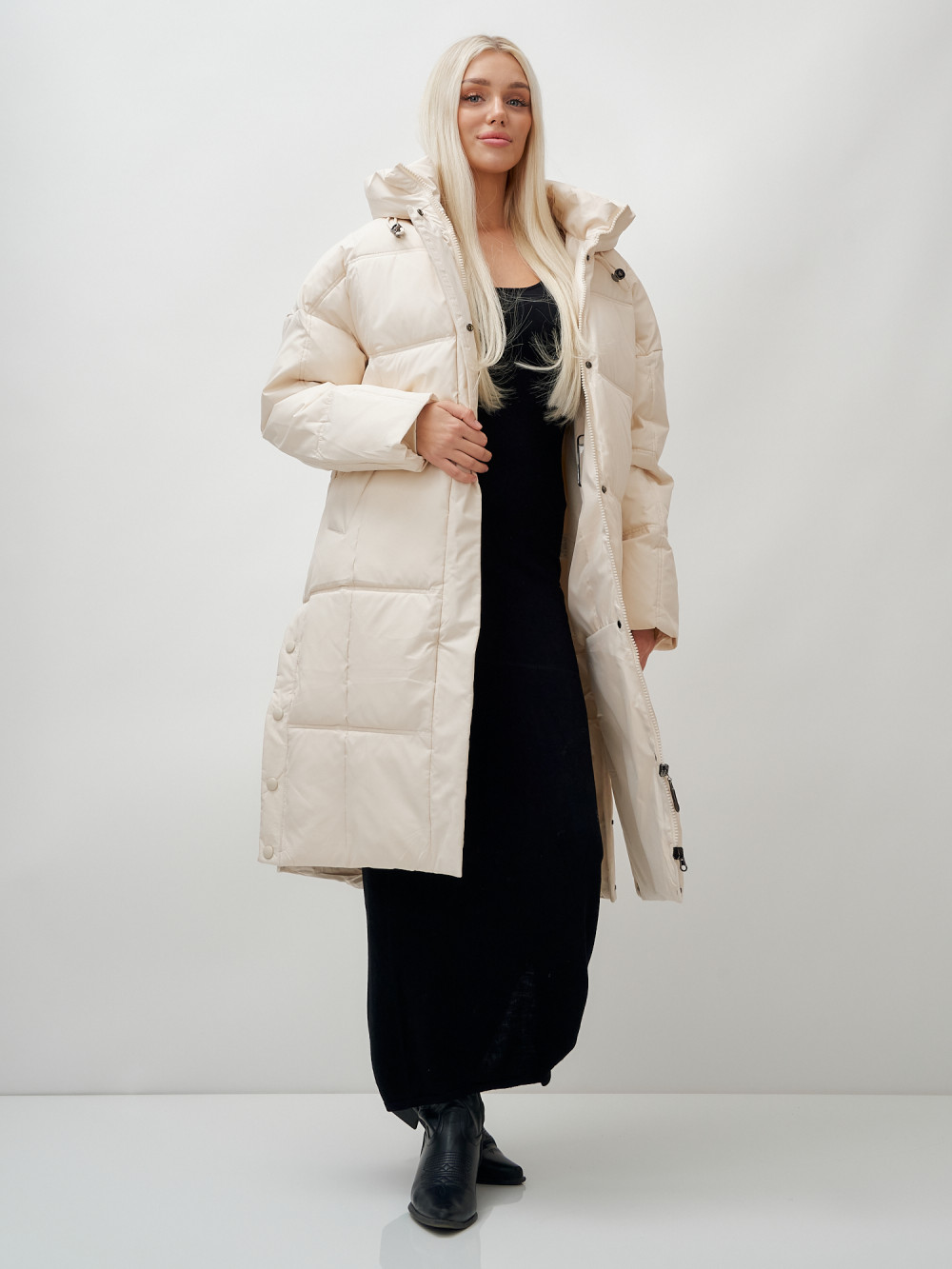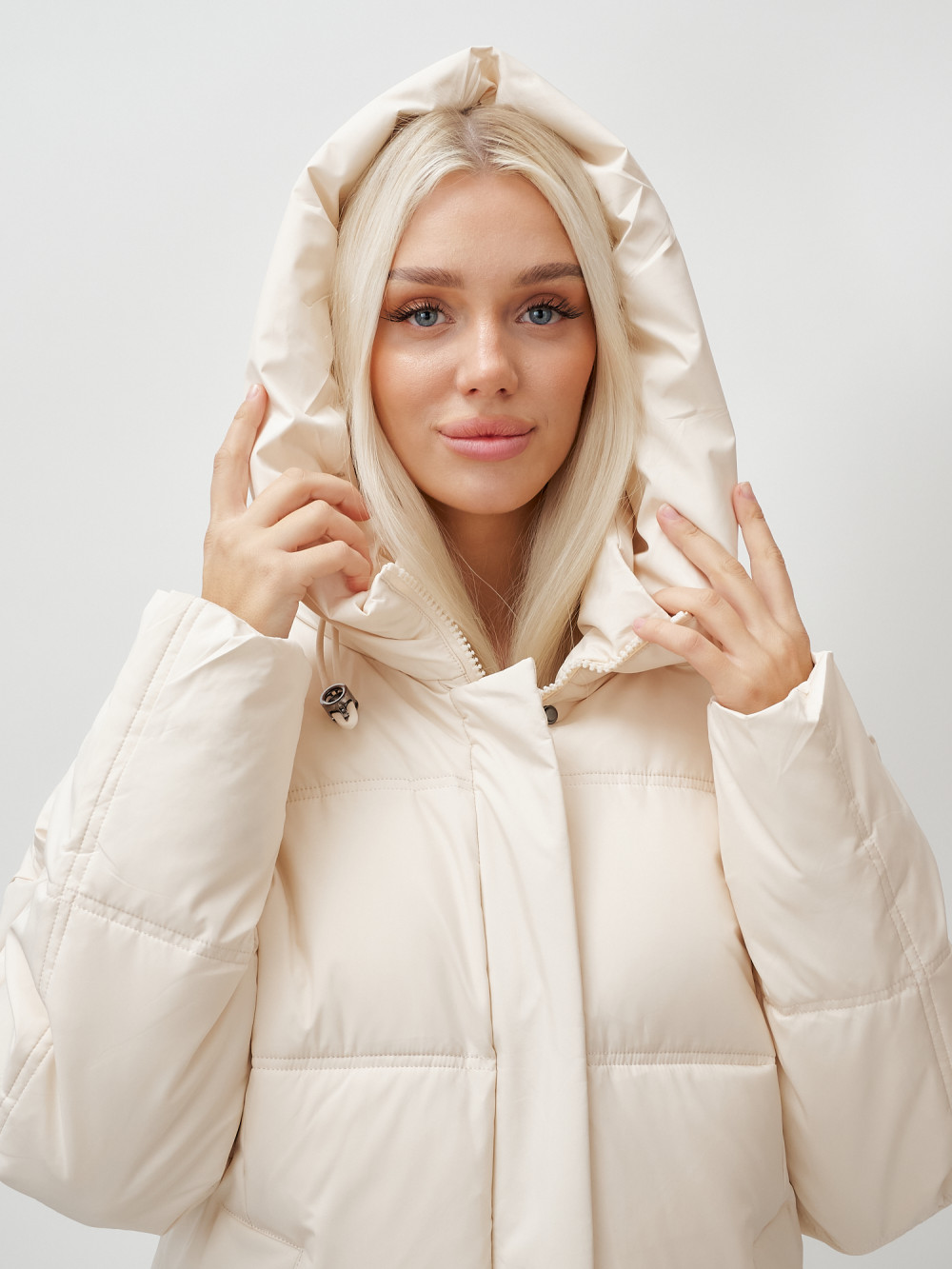 Пальто летучая мышь женское с капюшоном зимнее бежевого цвета 9619B — MTFORCE