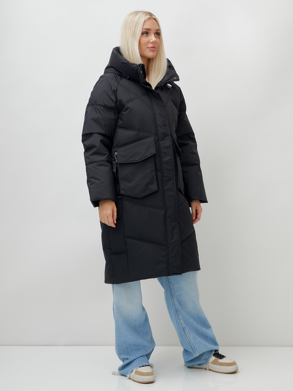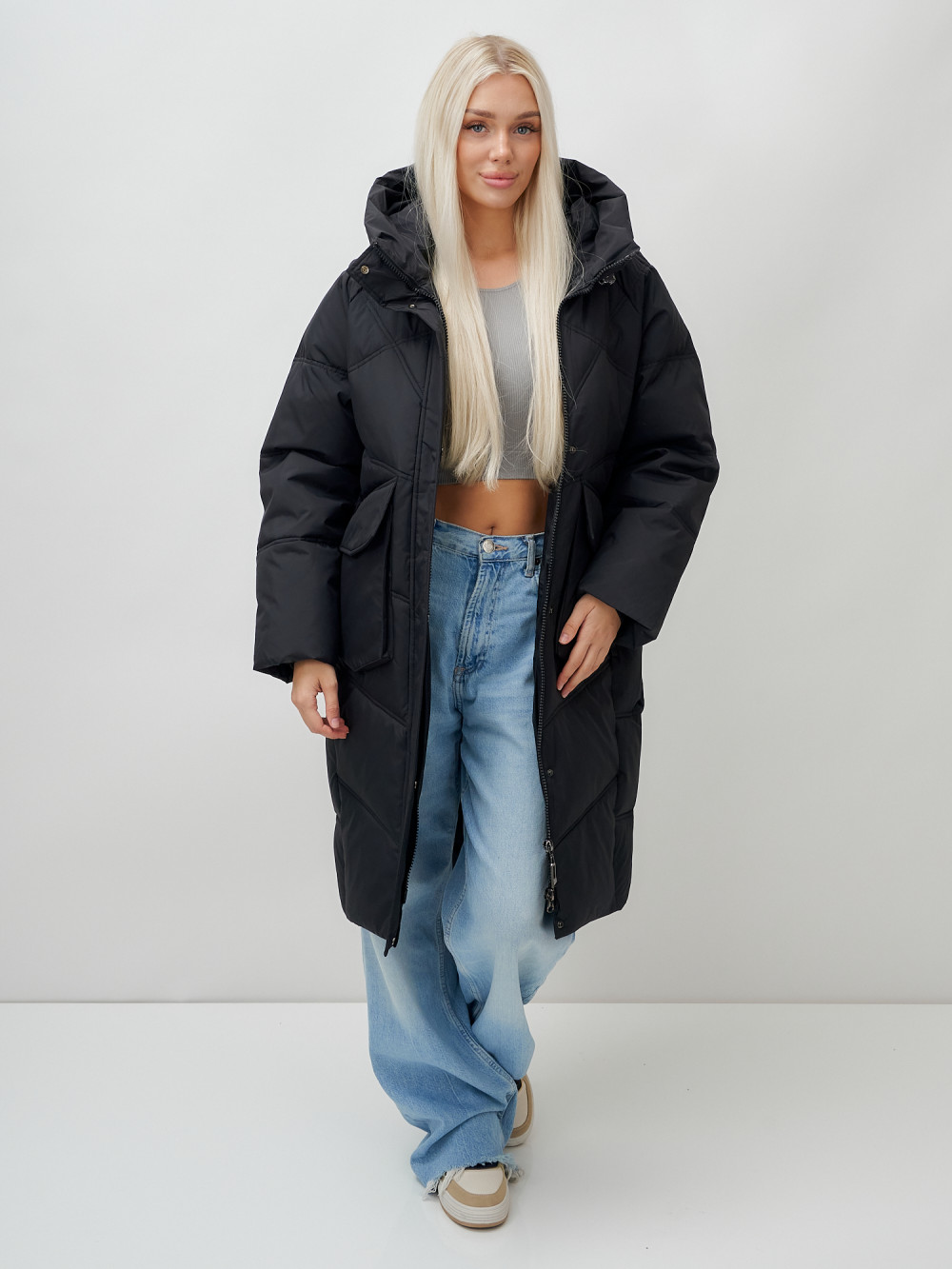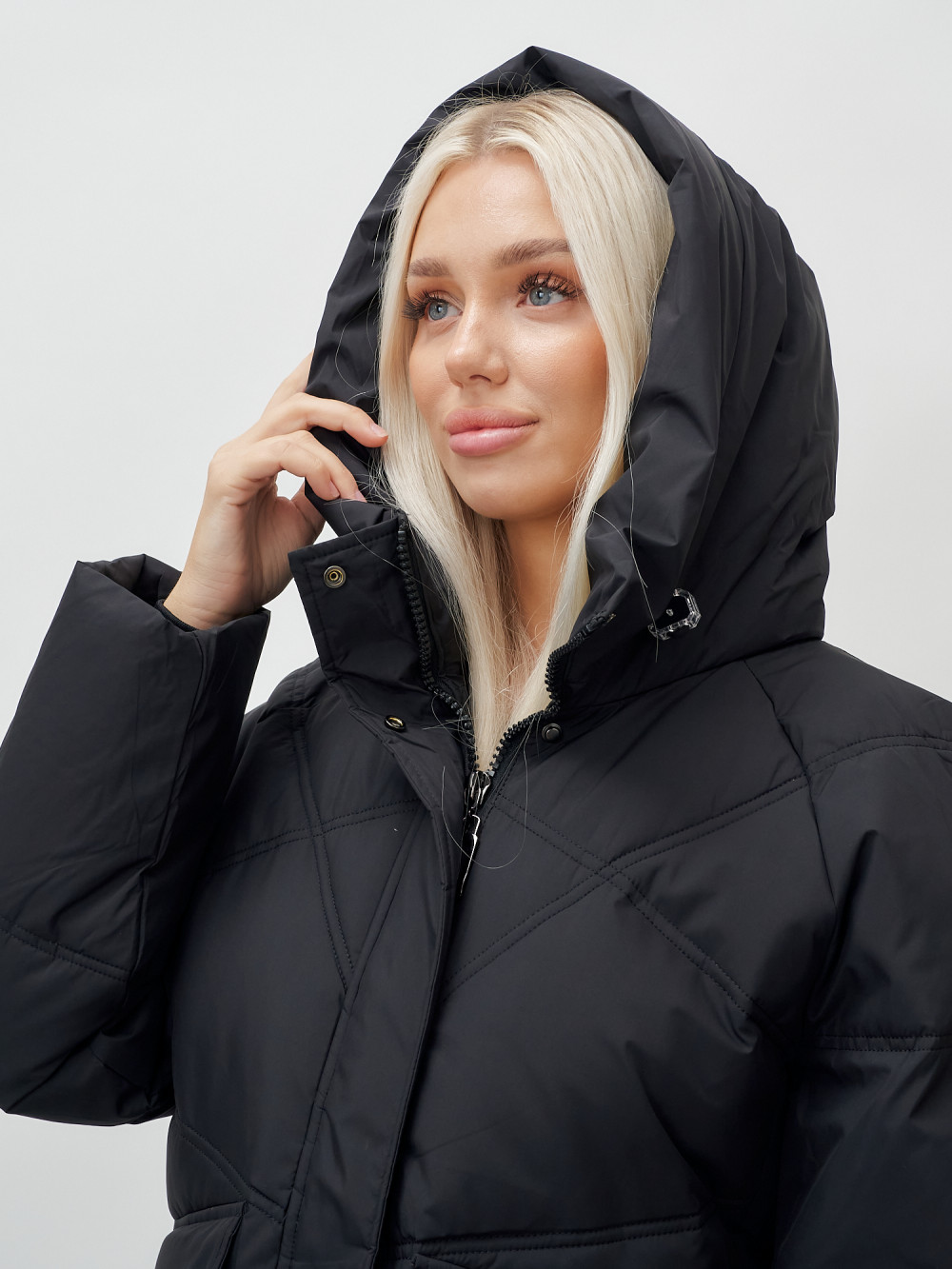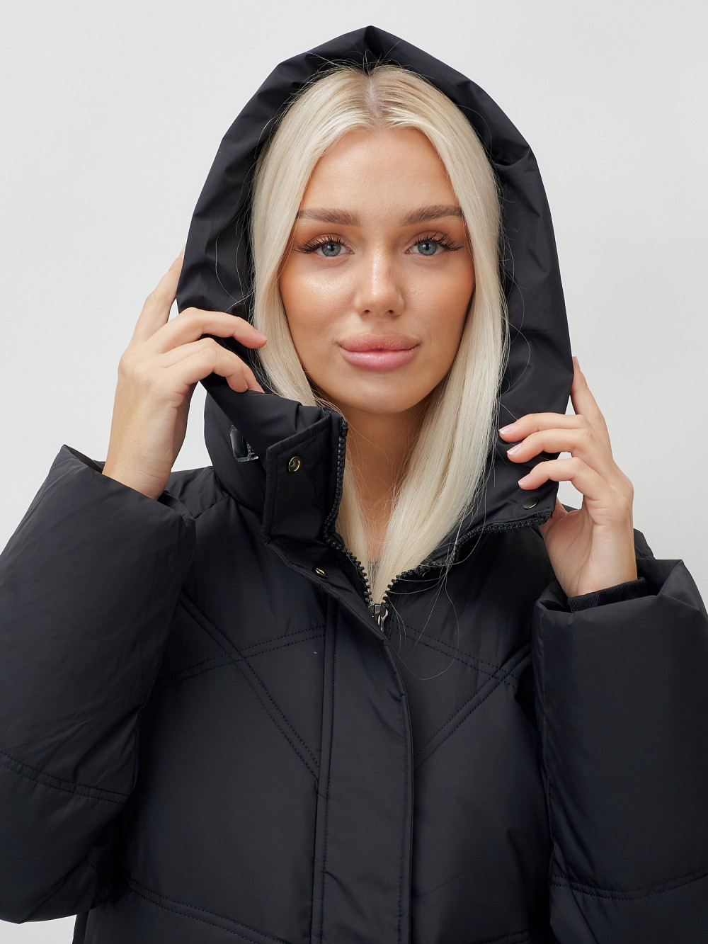 Пальто летучая мышь женское с капюшоном зимнее черного цвета 9618Ch — MTFORCE