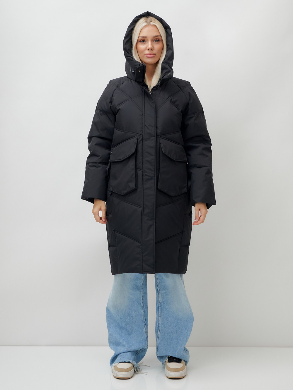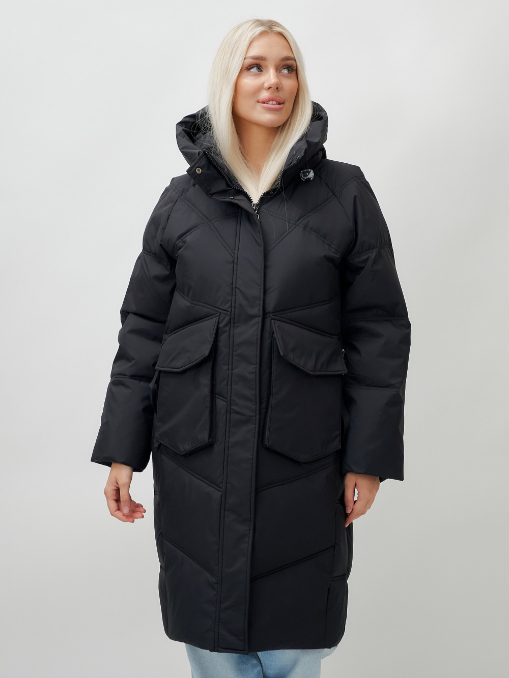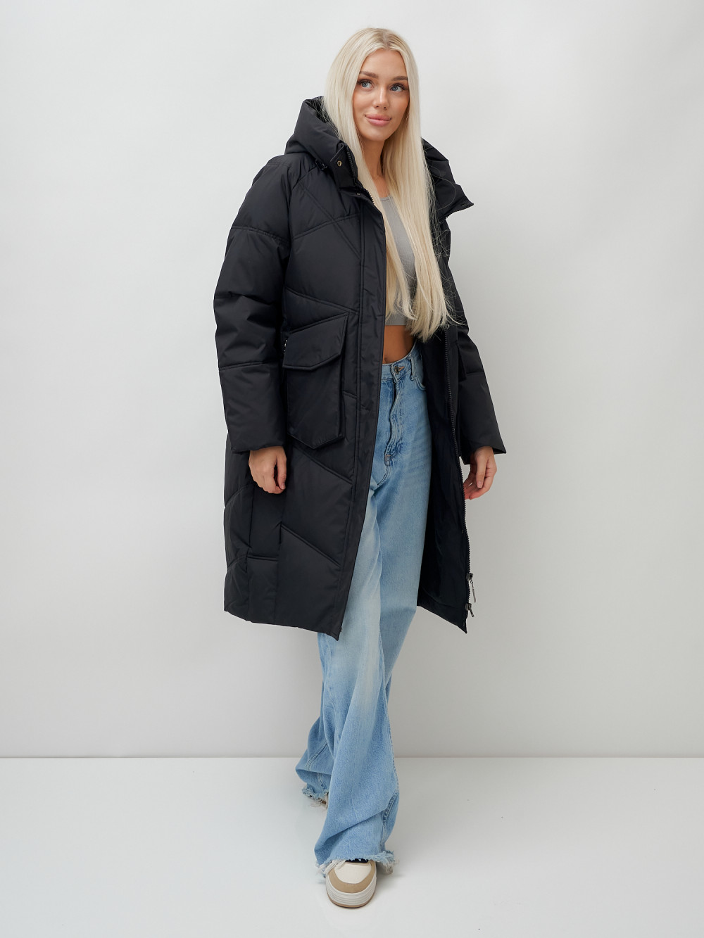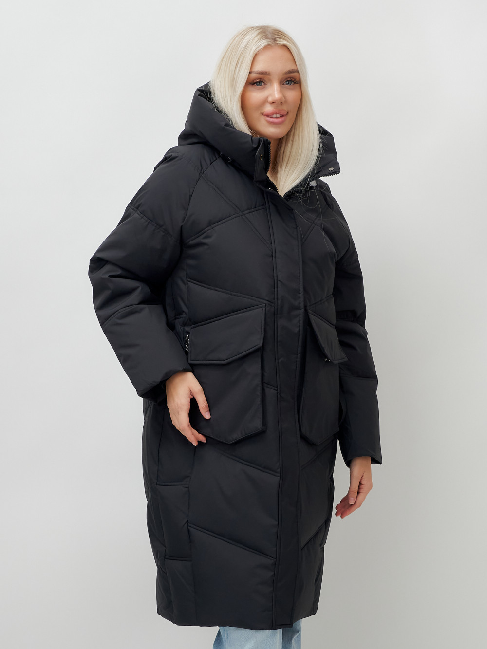 Пальто летучая мышь женское с капюшоном зимнее черного цвета 9618Ch — MTFORCE