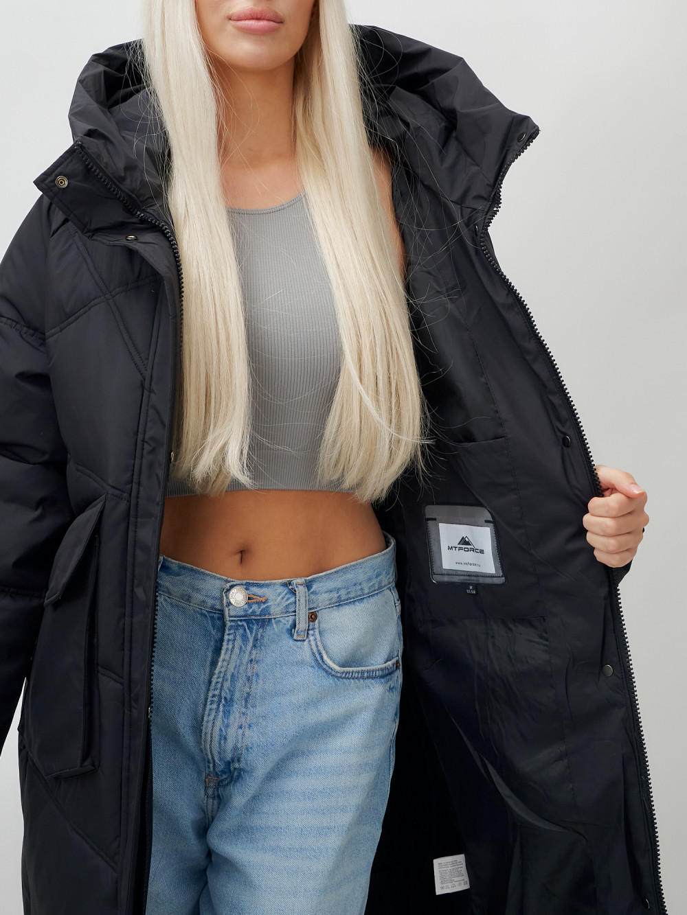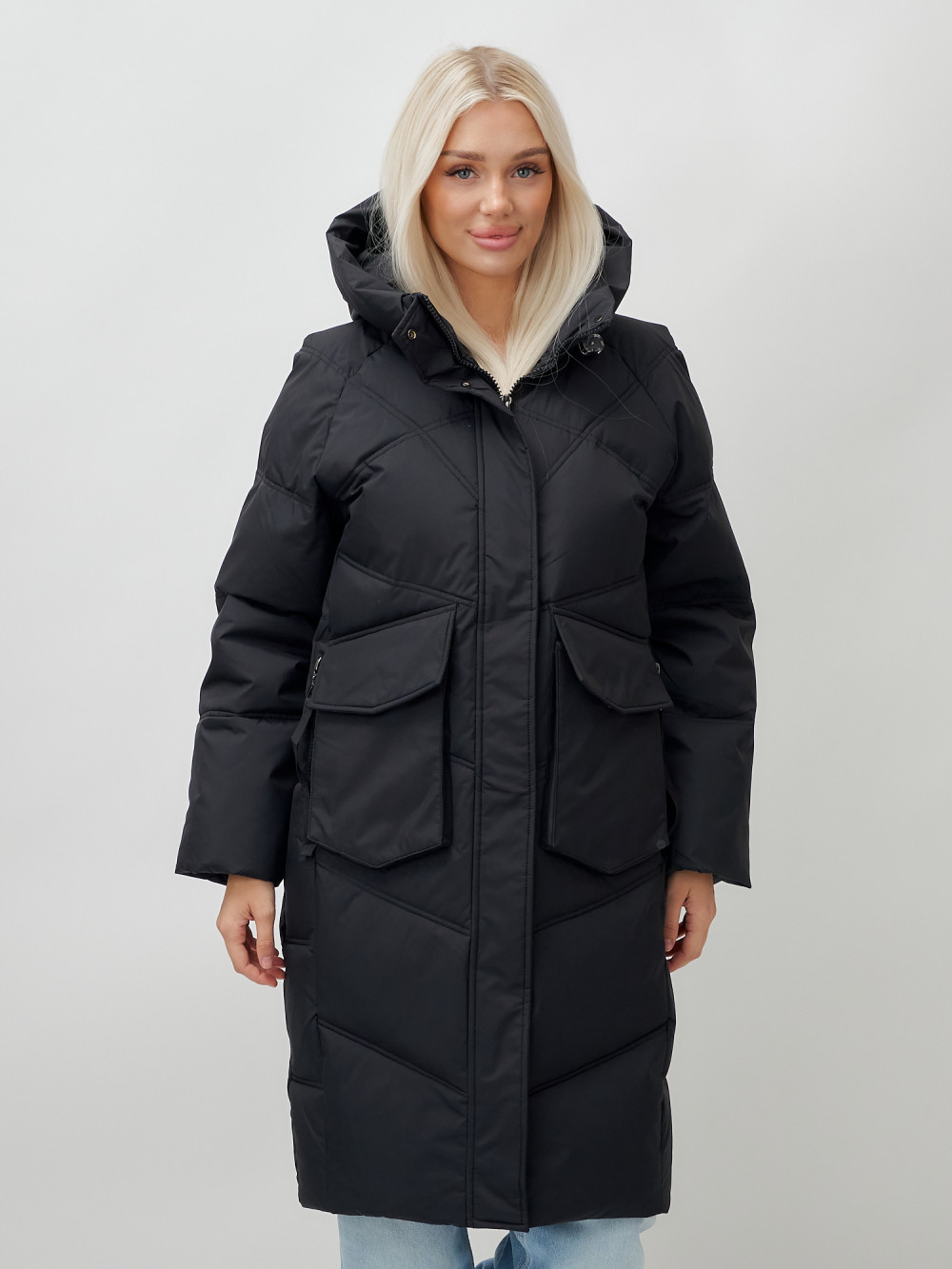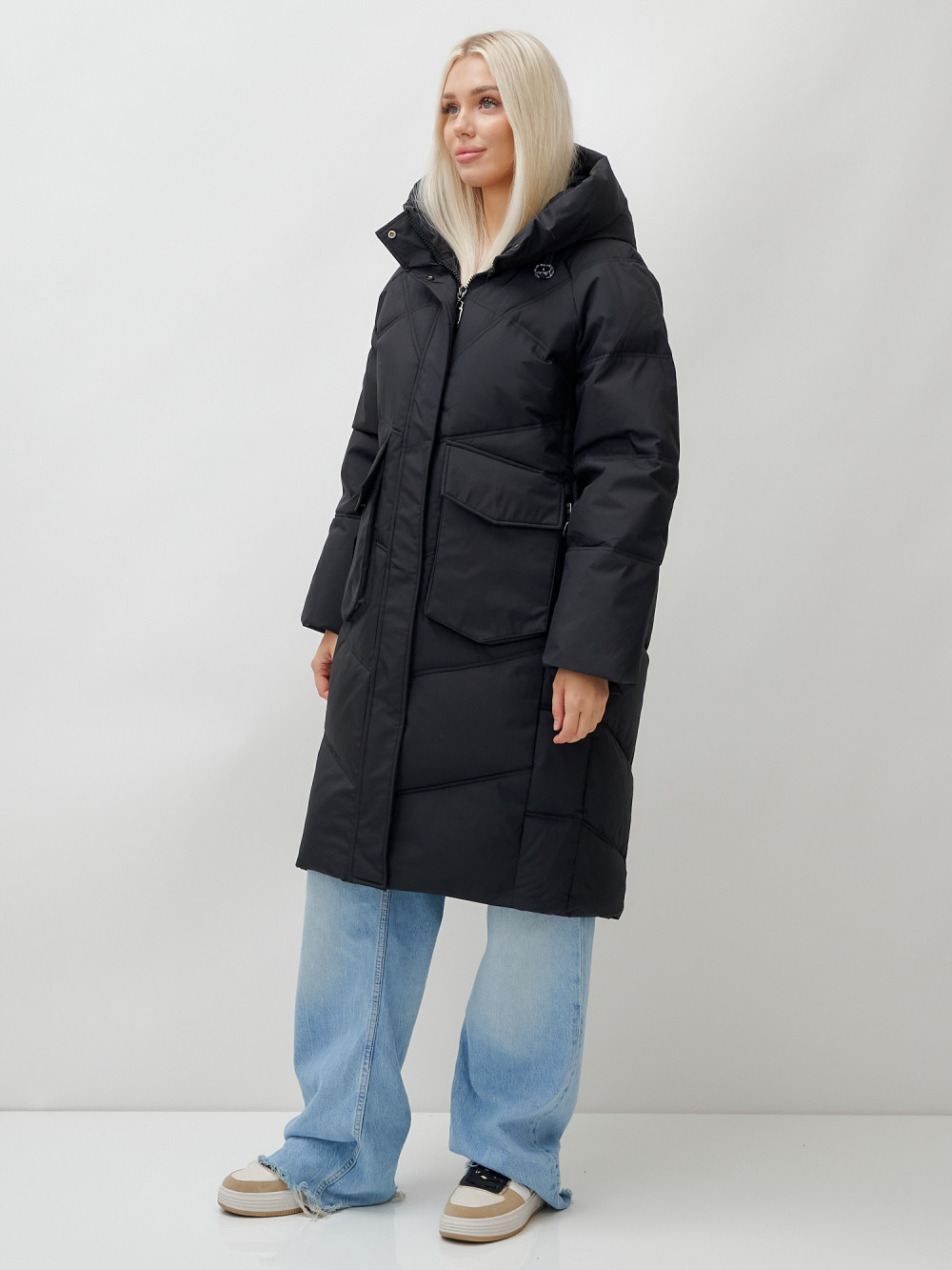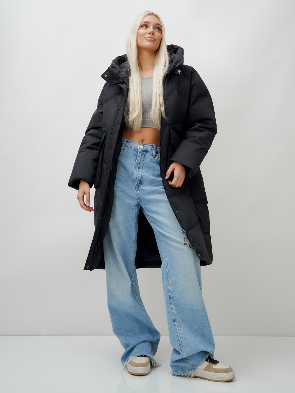 Пальто летучая мышь женское с капюшоном зимнее черного цвета 9618Ch — MTFORCE
