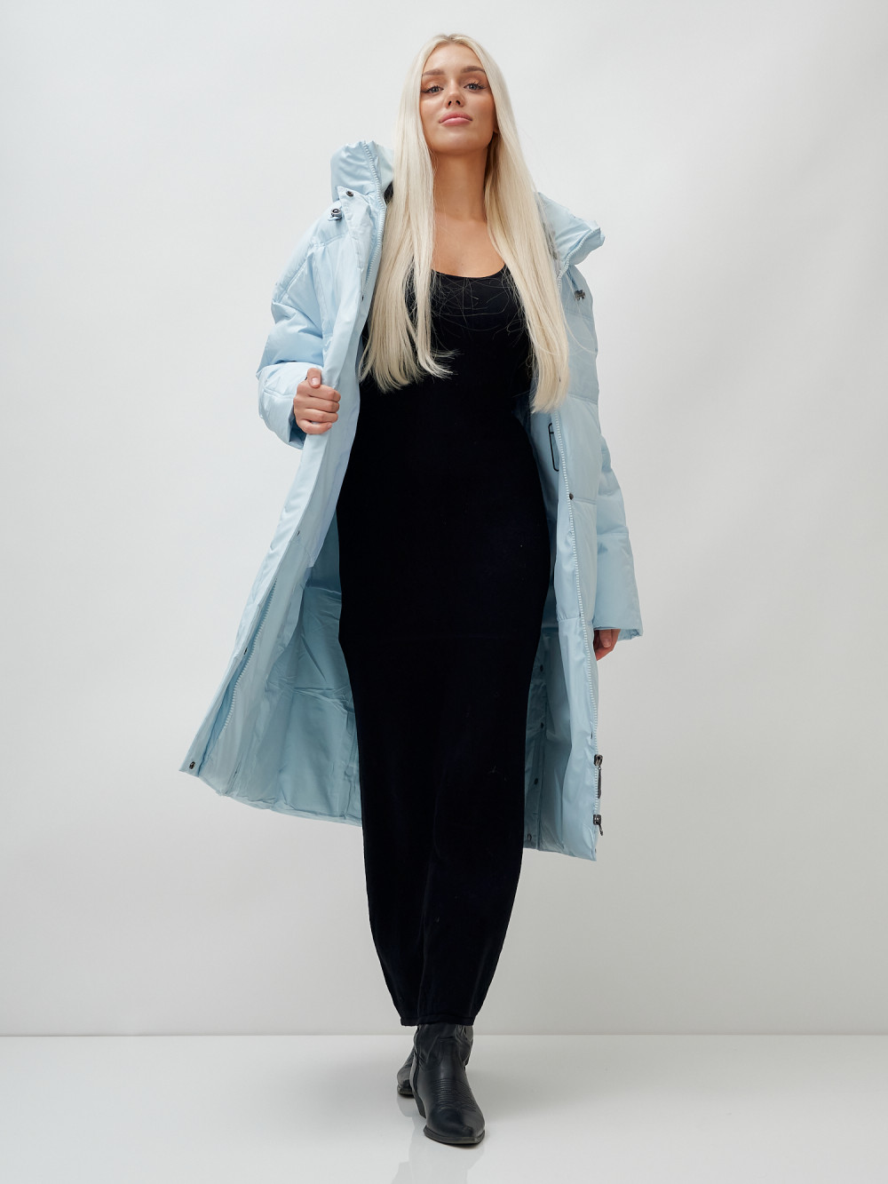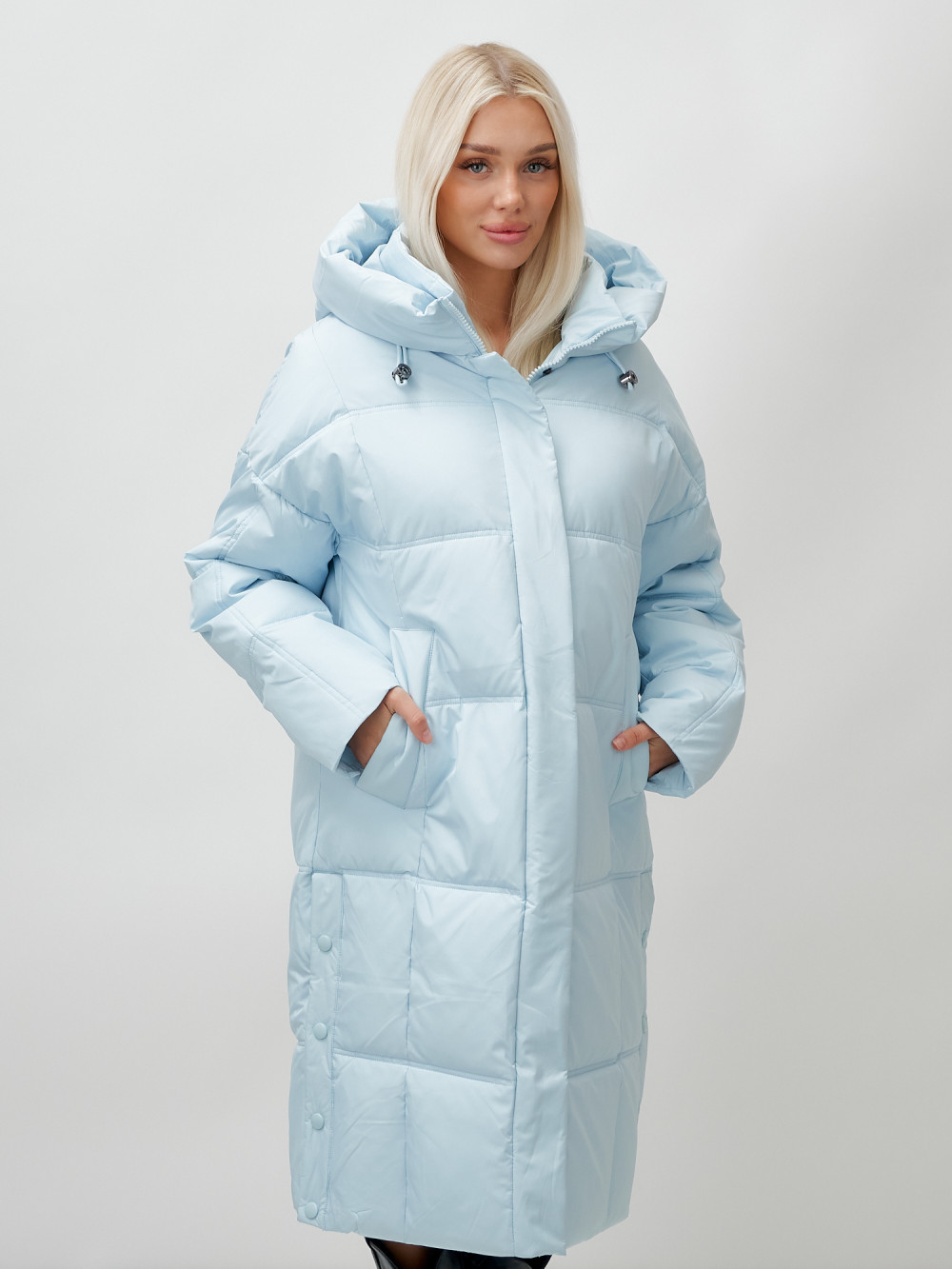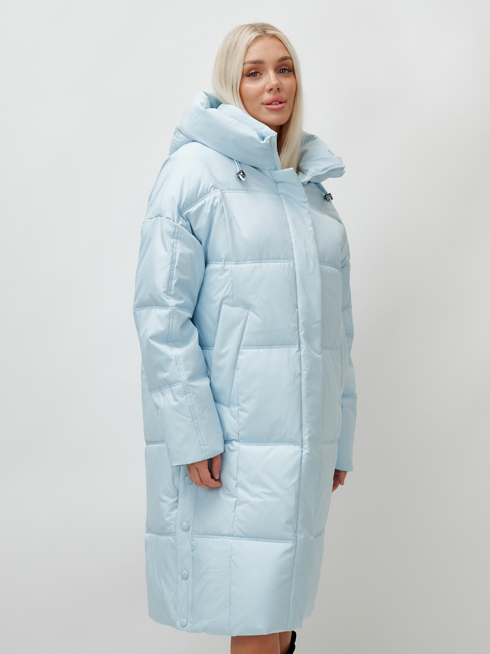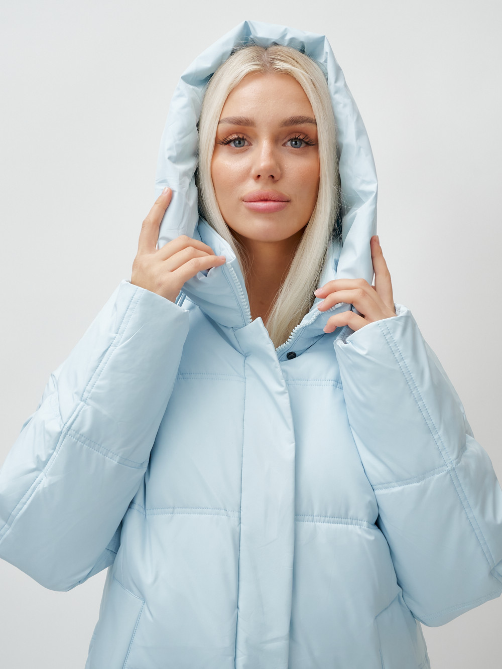 Пальто летучая мышь женское с капюшоном зимнее голубого цвета 9619Gl — MTFORCE