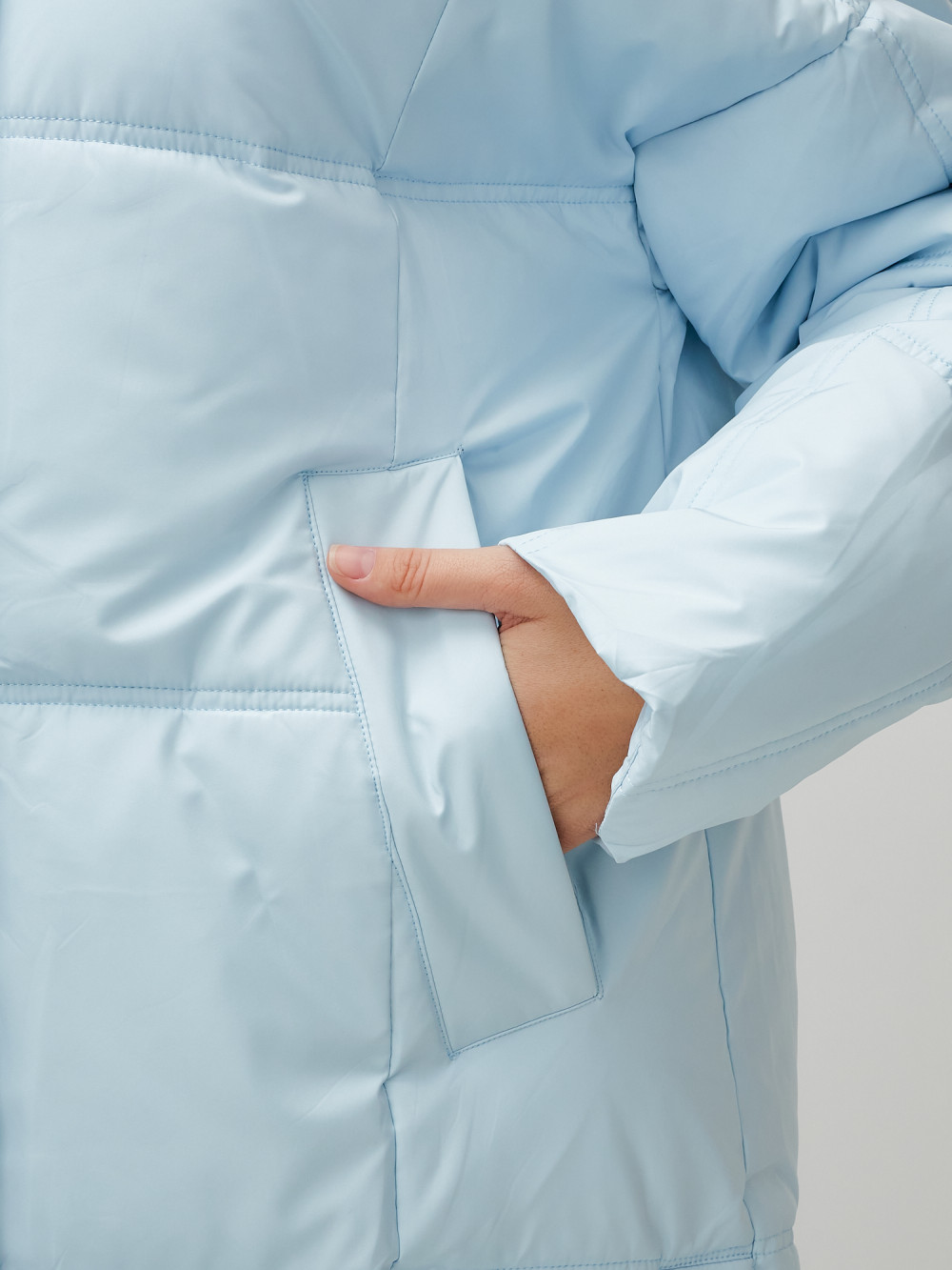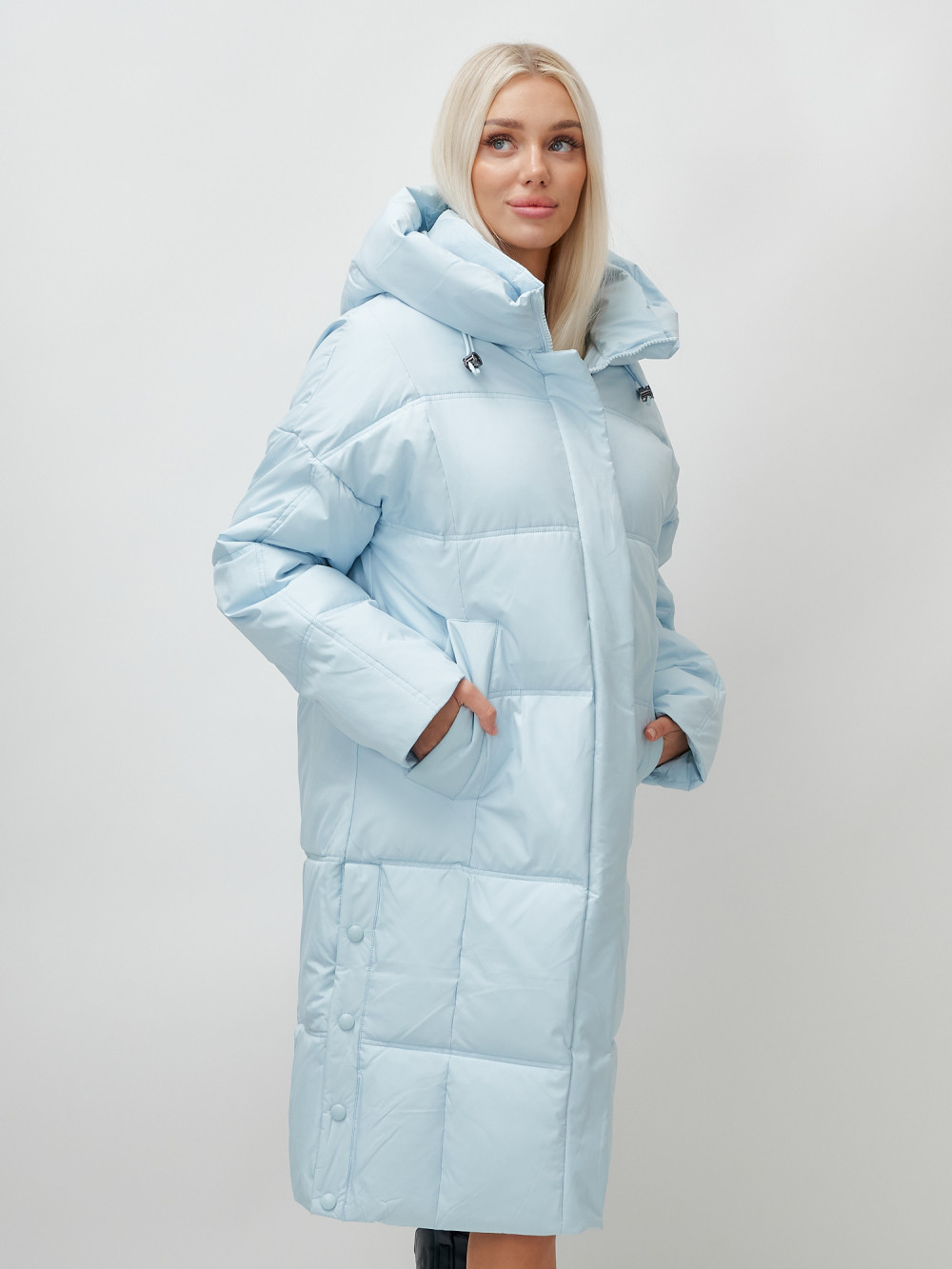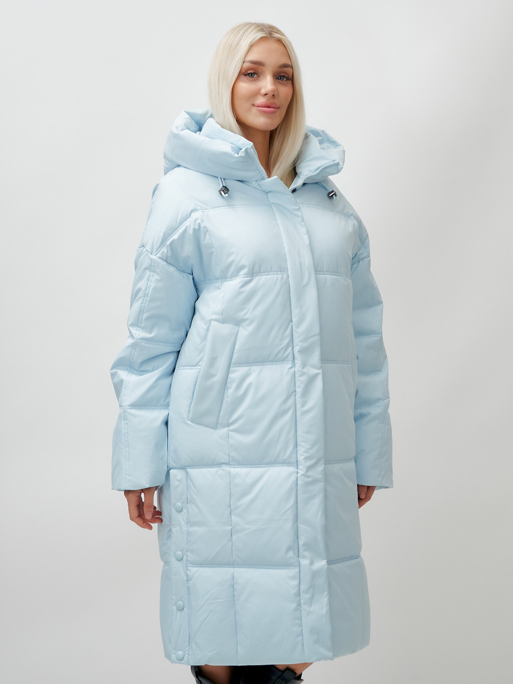 Пальто летучая мышь женское с капюшоном зимнее голубого цвета 9619Gl