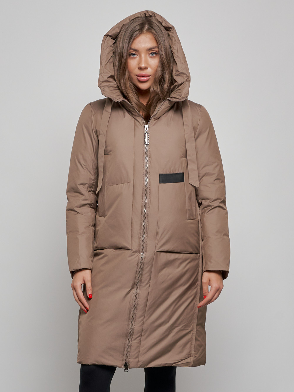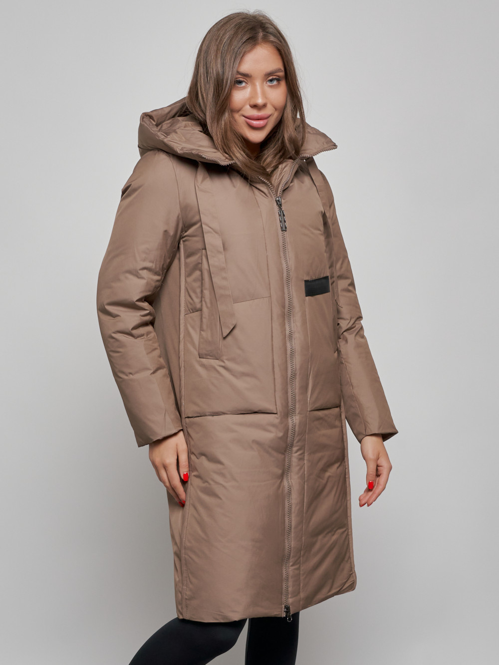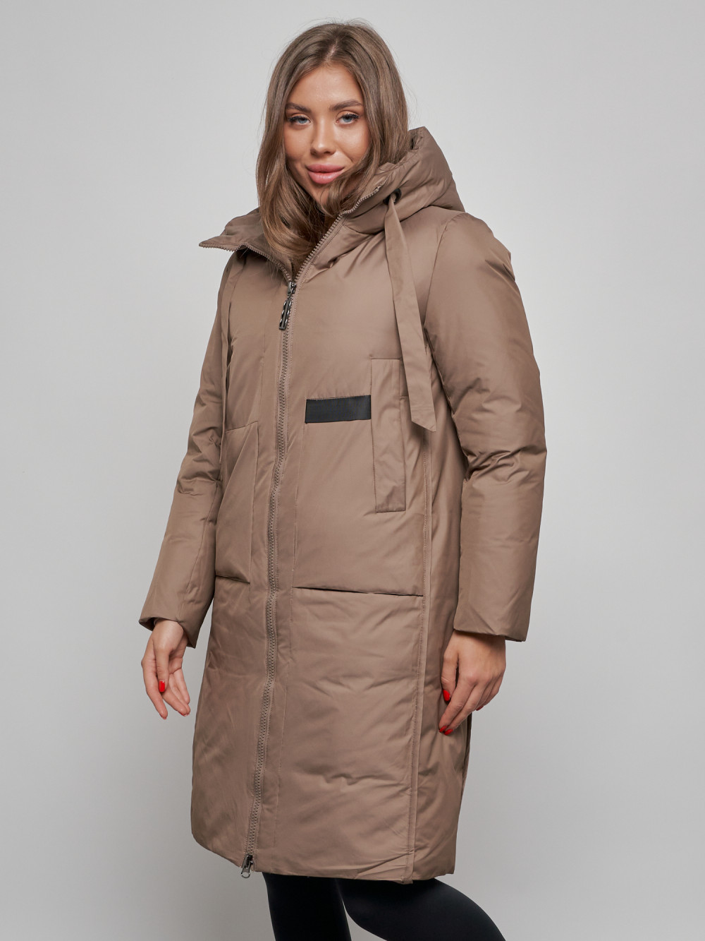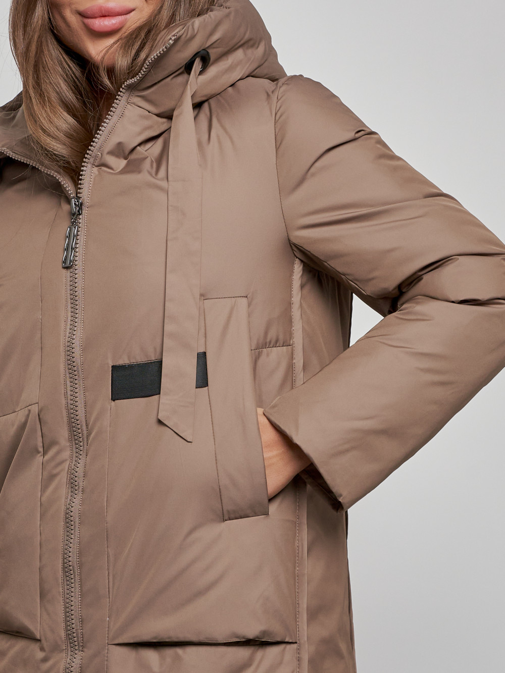 Пальто утепленное молодежное зимнее женское коричневого цвета 52359K
