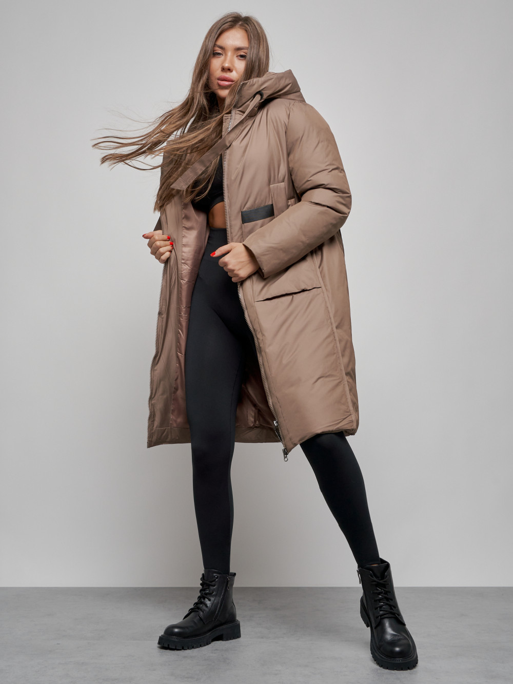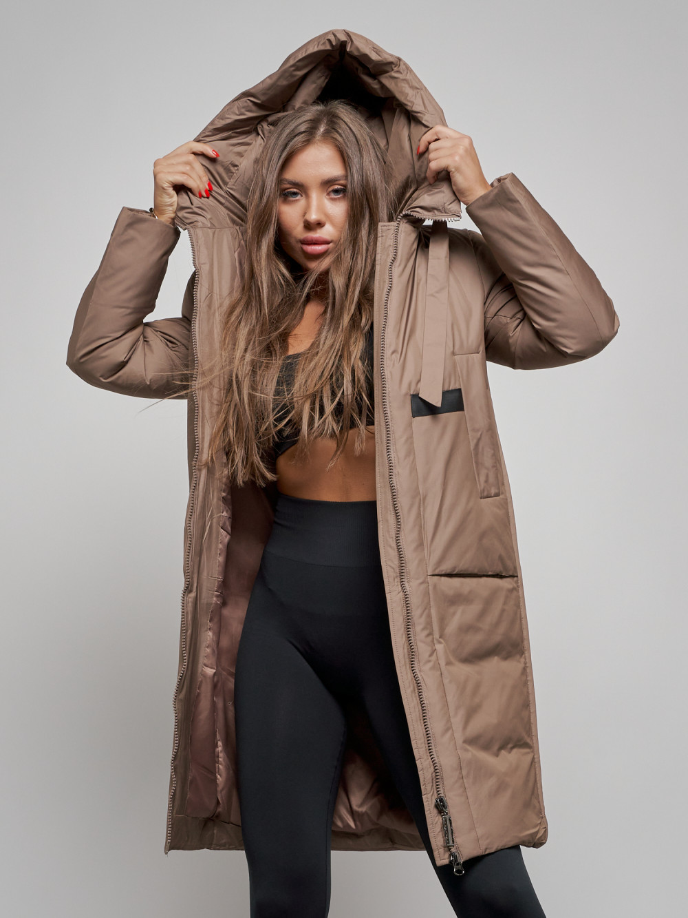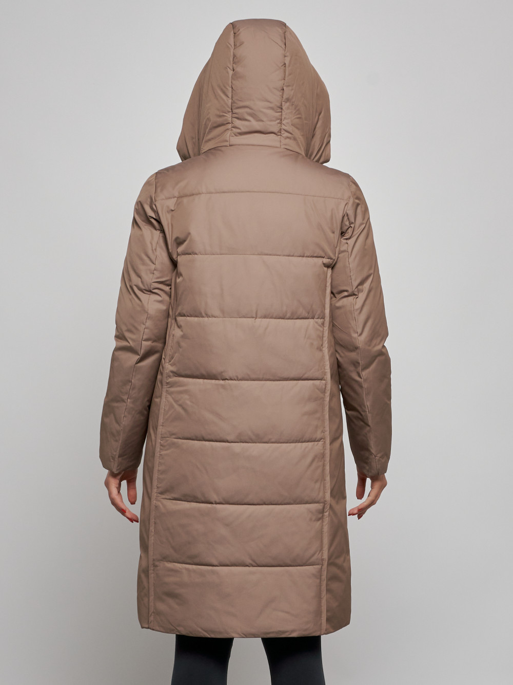Пальто утепленное молодежное зимнее женское коричневого цвета 52359K