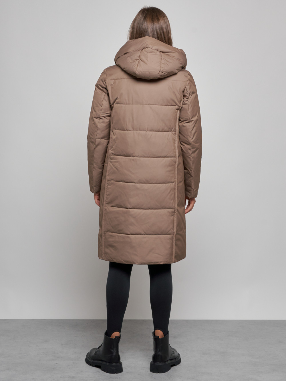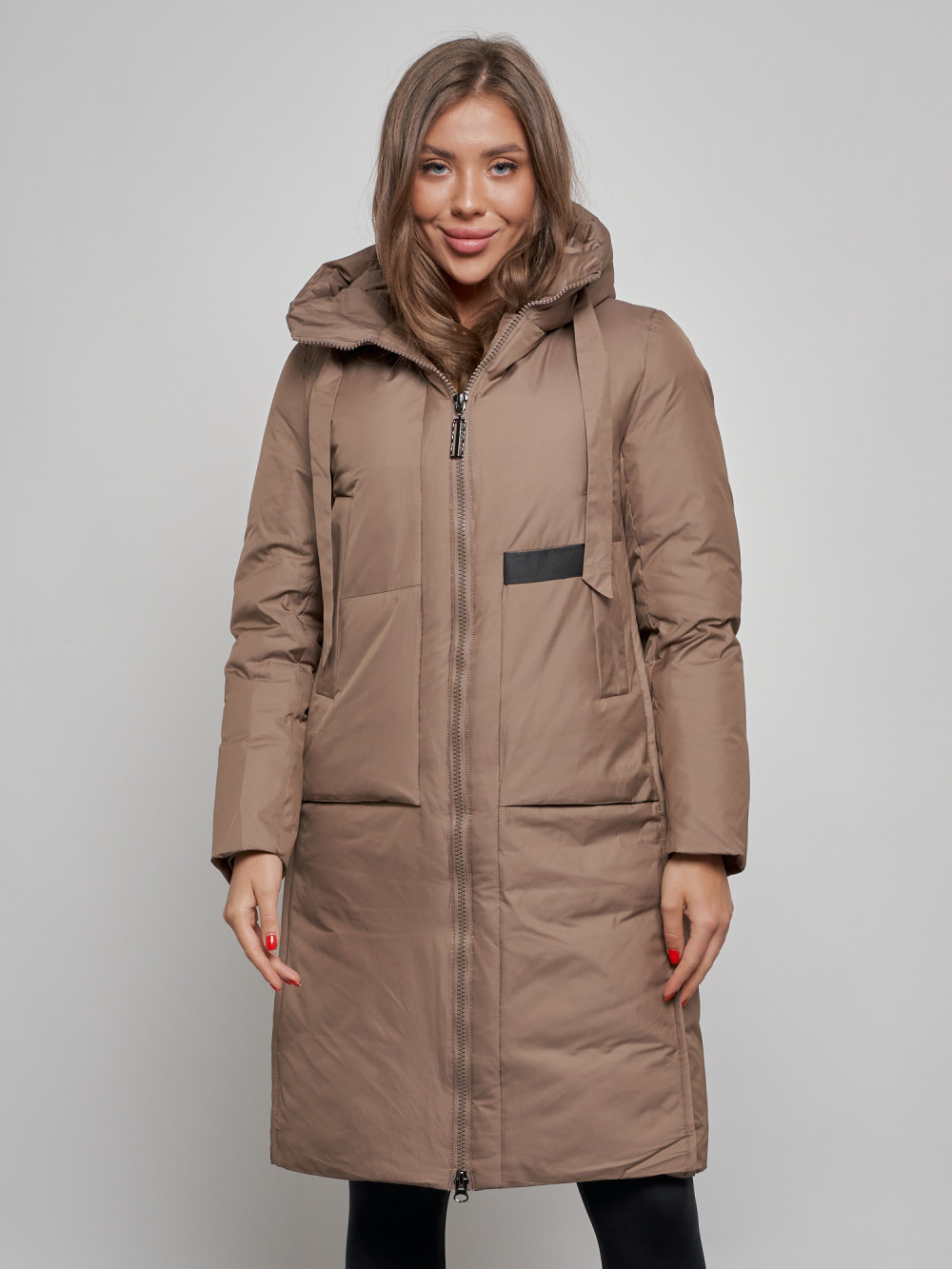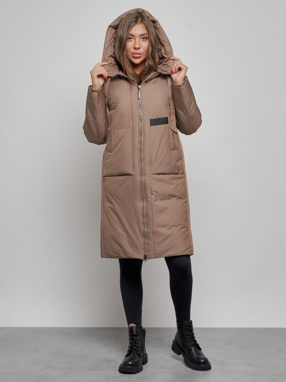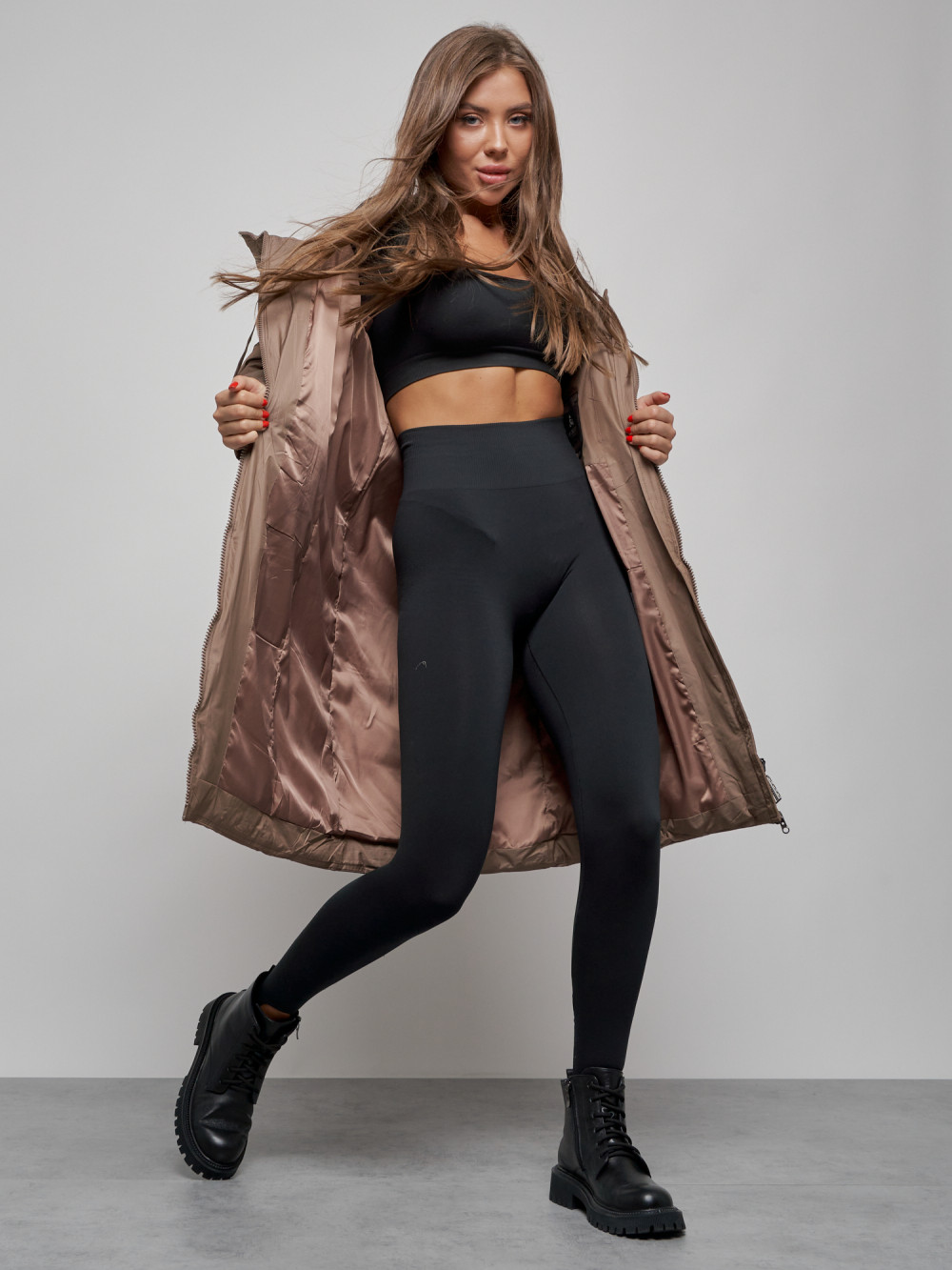 Пальто утепленное молодежное зимнее женское коричневого цвета 52359K