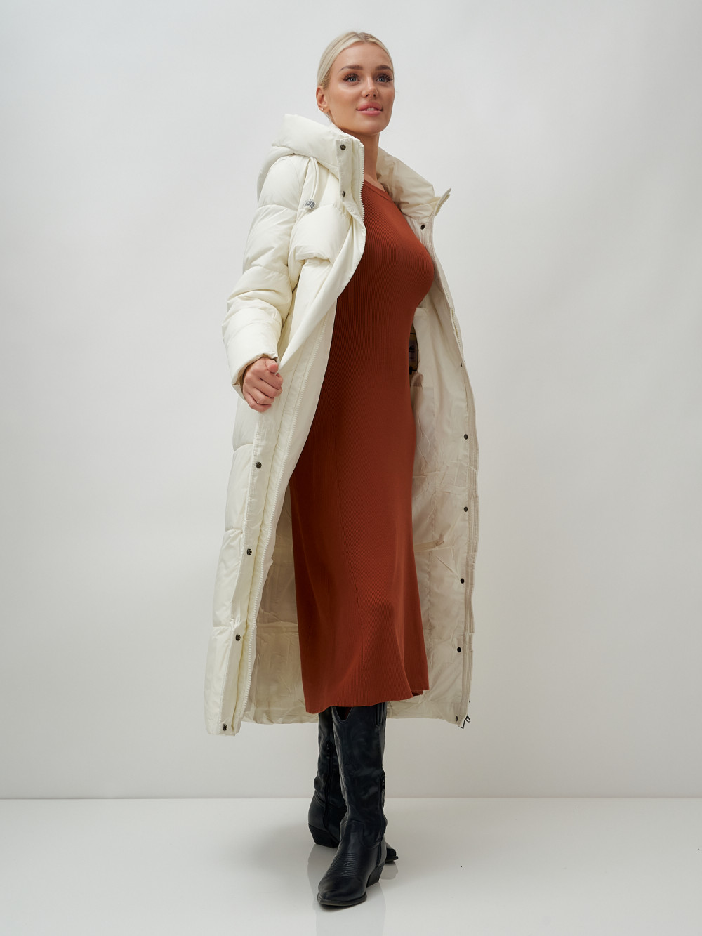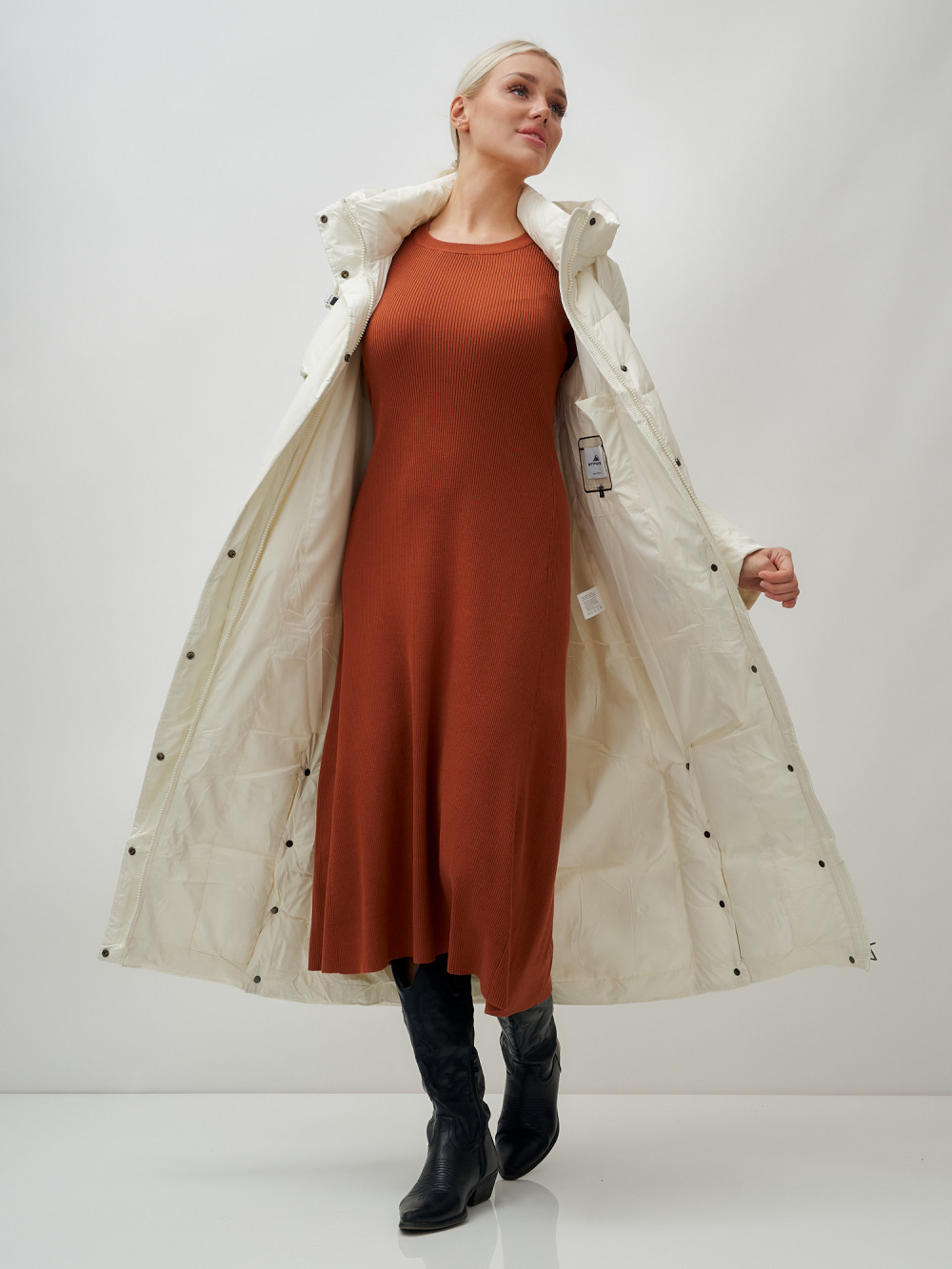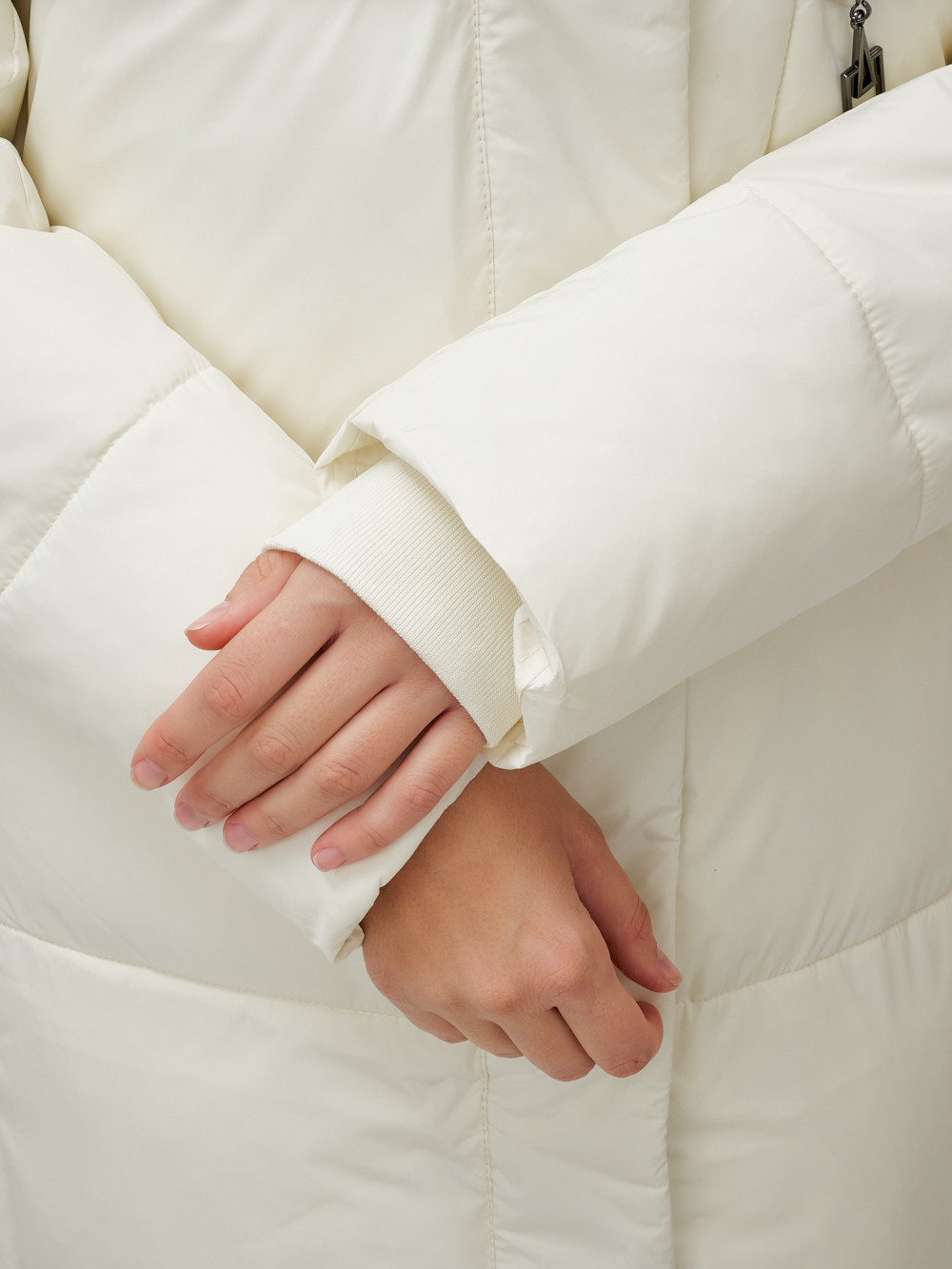 — Оно оснащено несъемным капюшоном, который защитит вас от ветра и снега, а прямые рукава с трикотажными манжетами плотно прилегают и сохраняют тепло внутри.