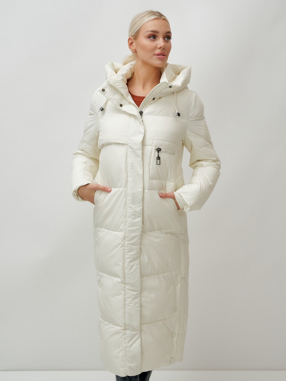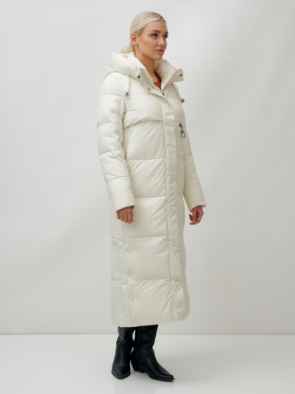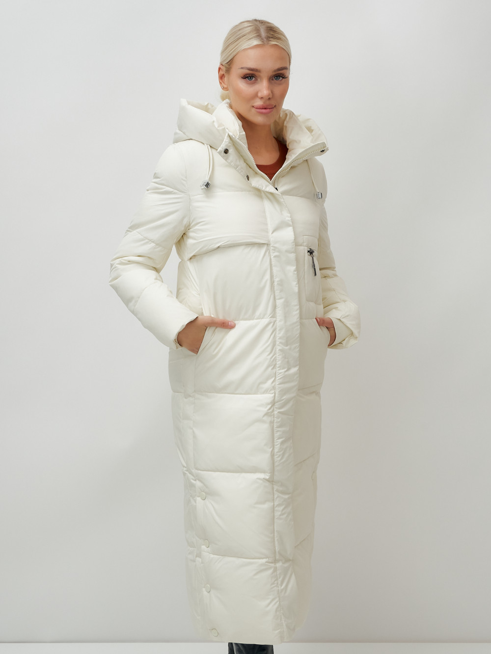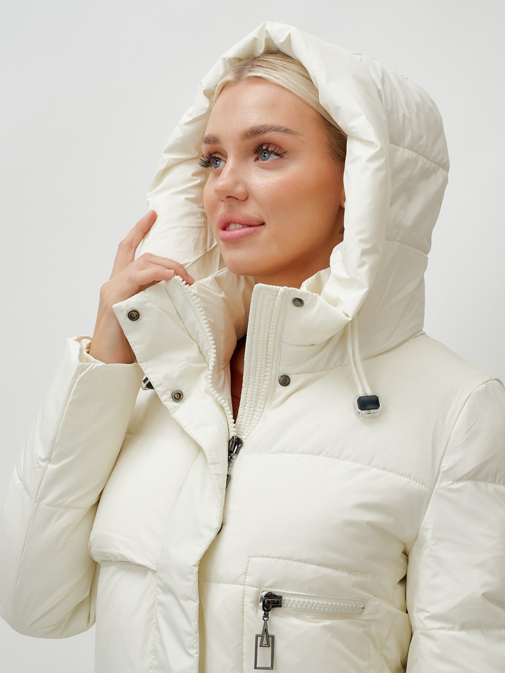 Пальто утепленное стеганное зимнее с капюшоном женское бежевого цвета 9611B — MTFORCE