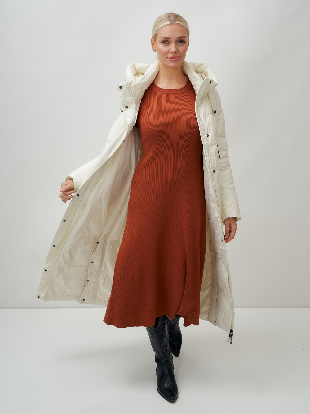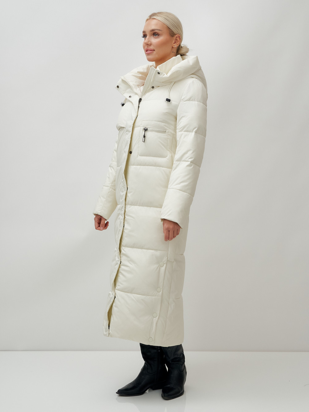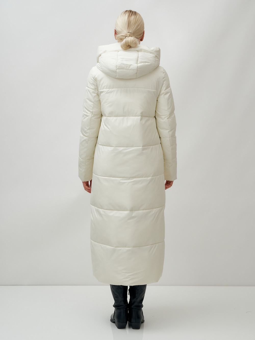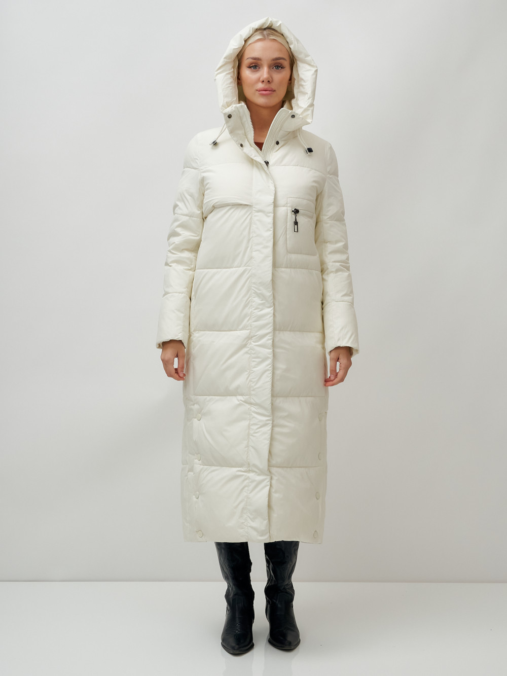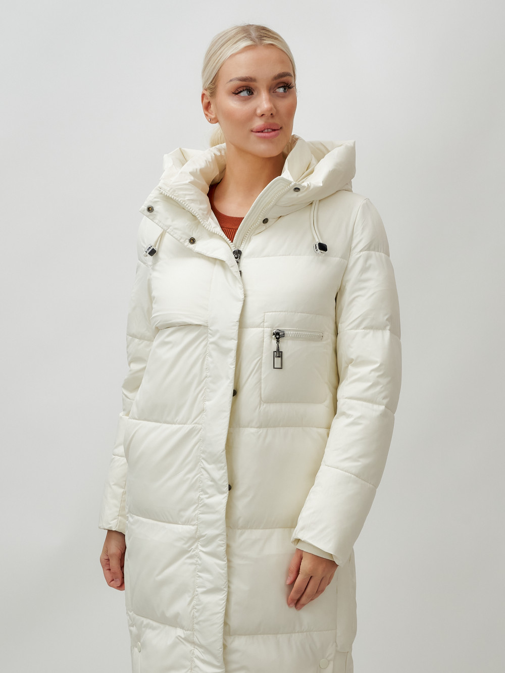 Пальто утепленное стеганное зимнее с капюшоном женское бежевого цвета 9611B — MTFORCE