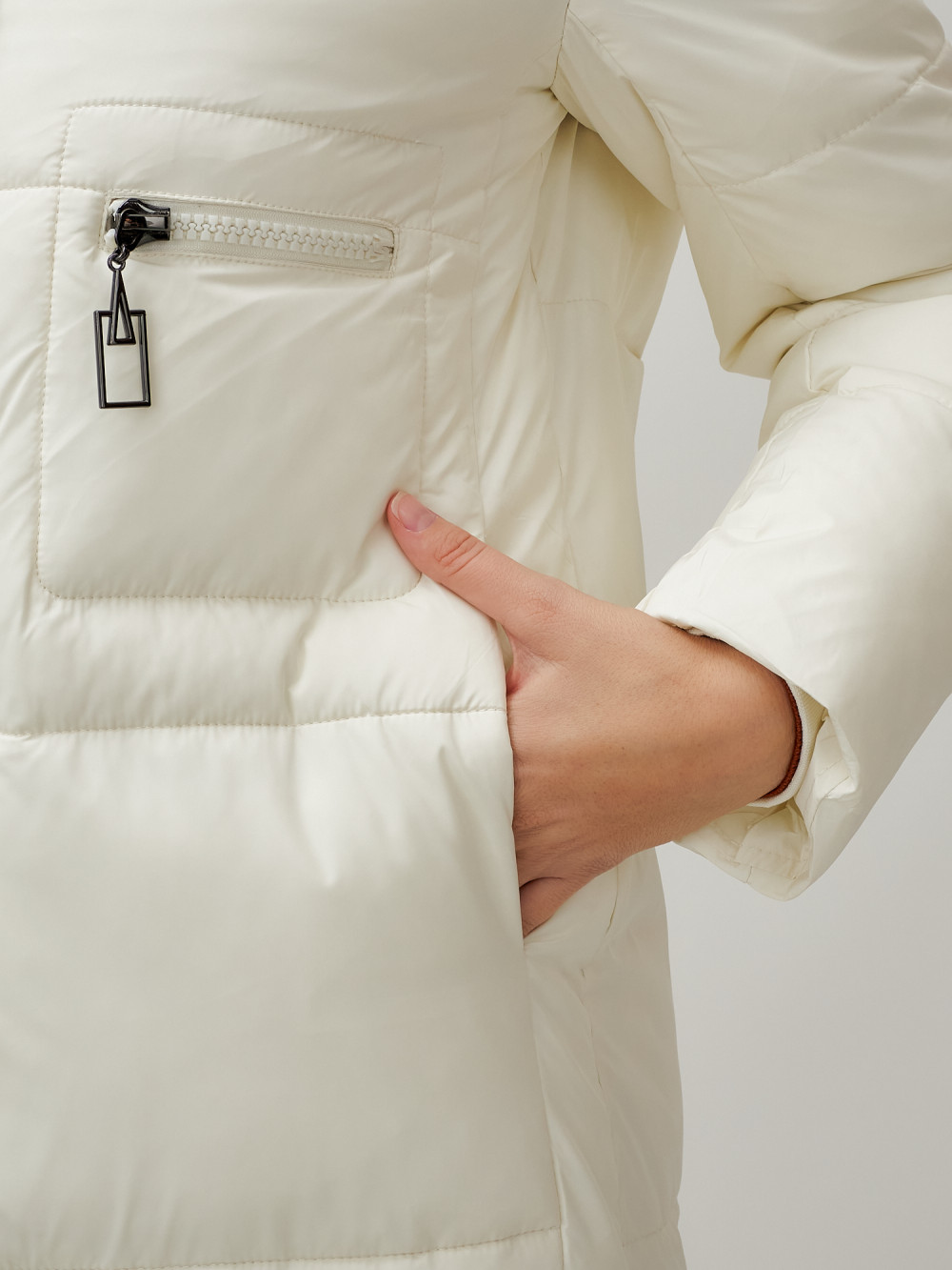 Пальто утепленное стеганное зимнее с капюшоном женское бежевого цвета 9611B