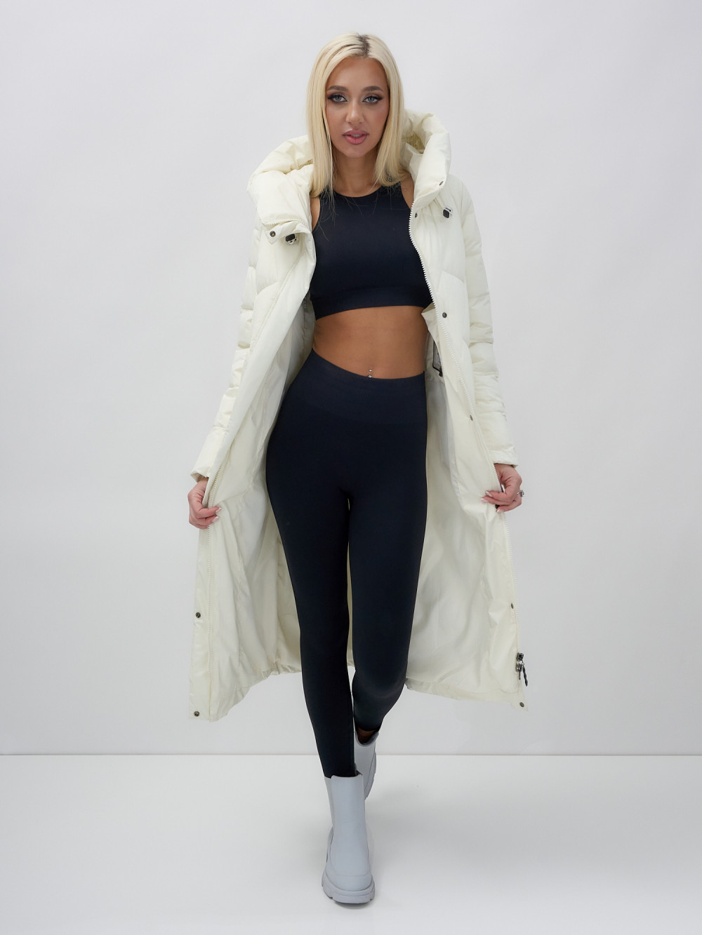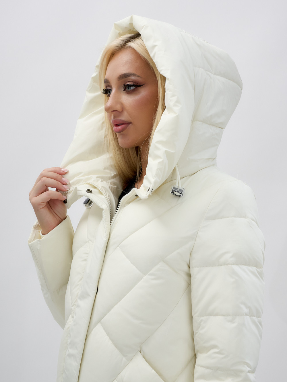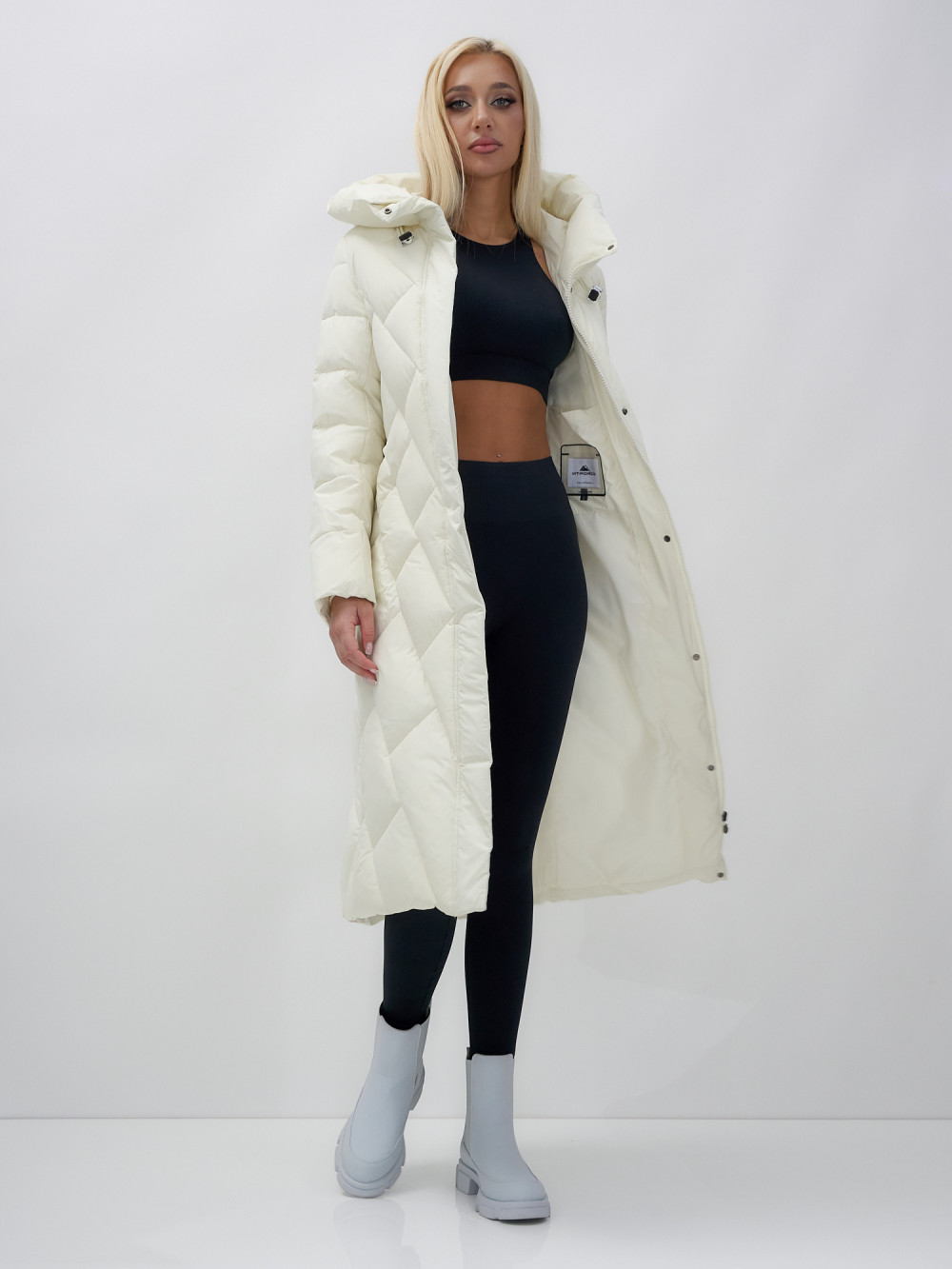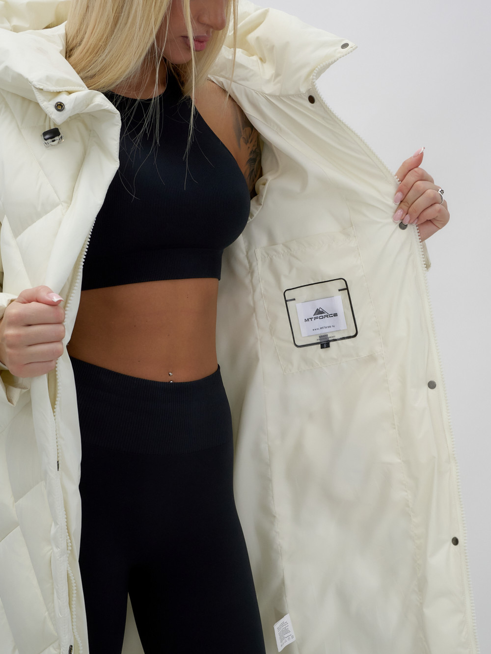 Пальто утепленное стеганное зимнее с капюшоном женское бежевого цвета 9612B — MTFORCE