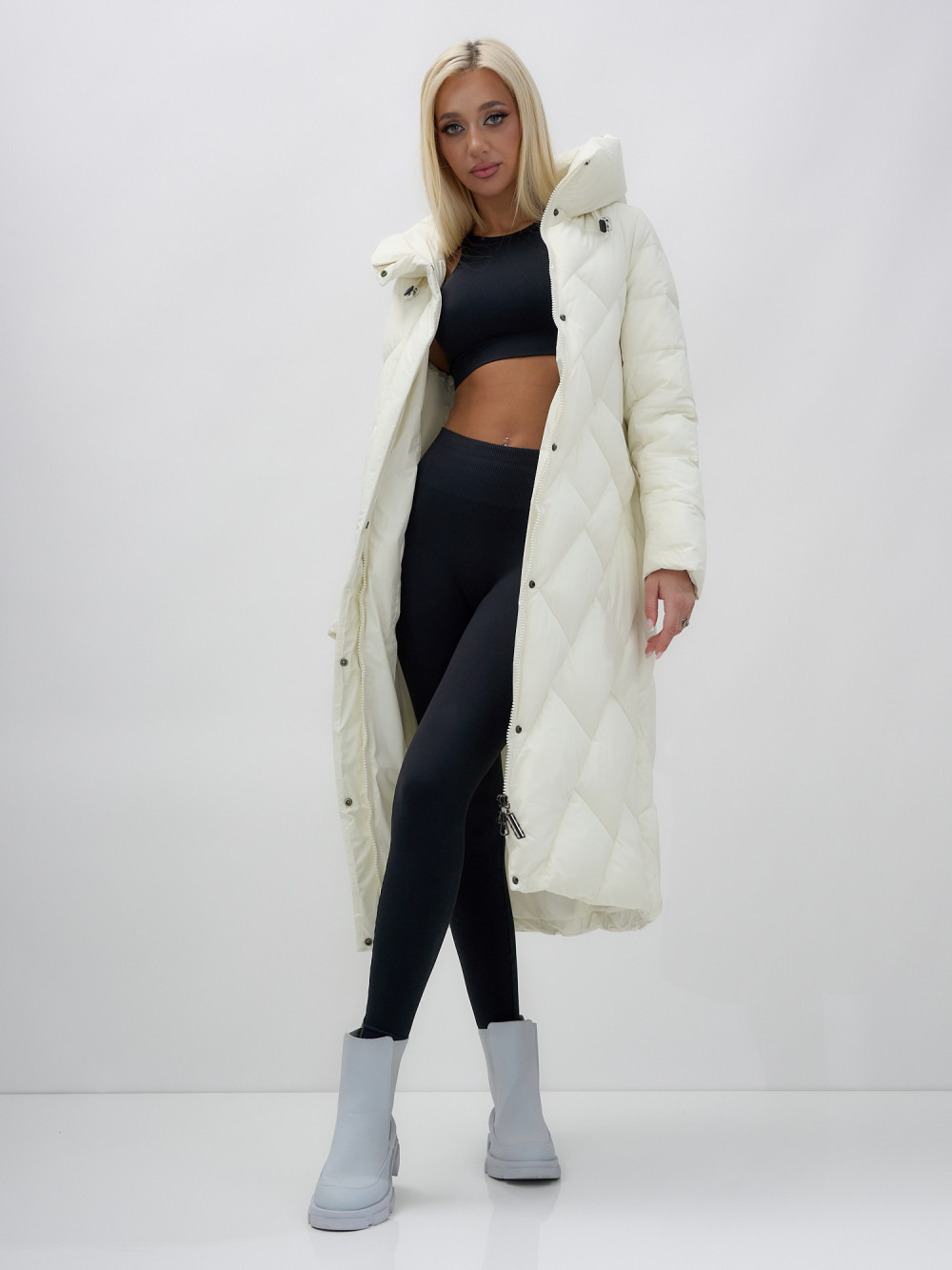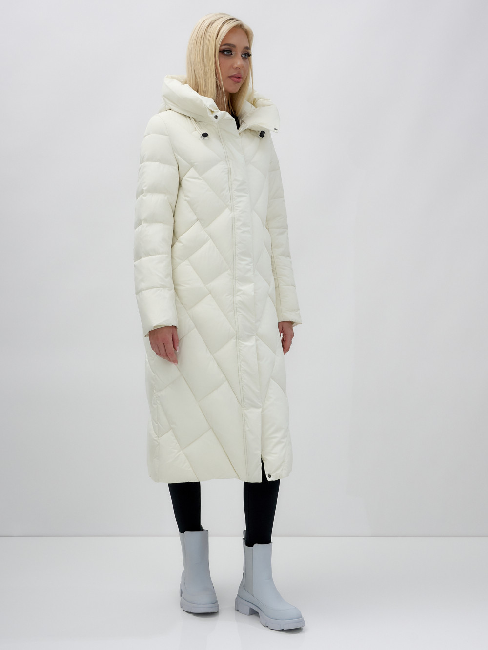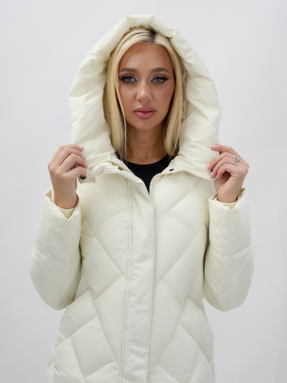 Пальто утепленное стеганное зимнее с капюшоном женское бежевого цвета 9612B — MTFORCE