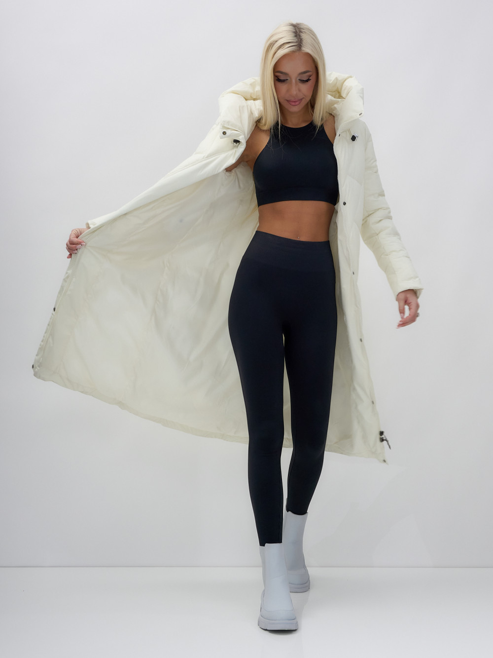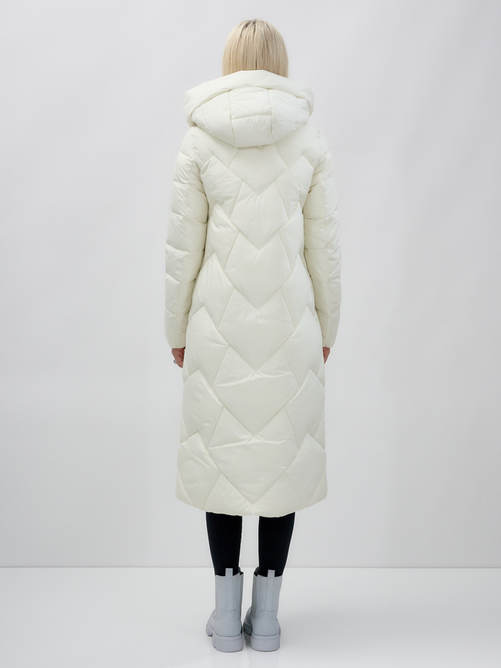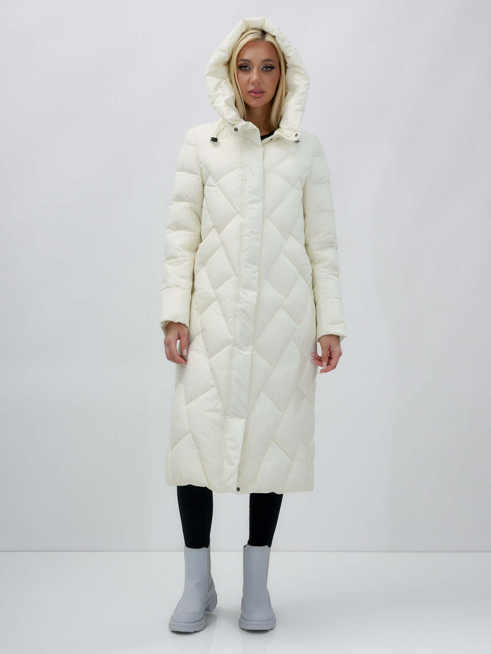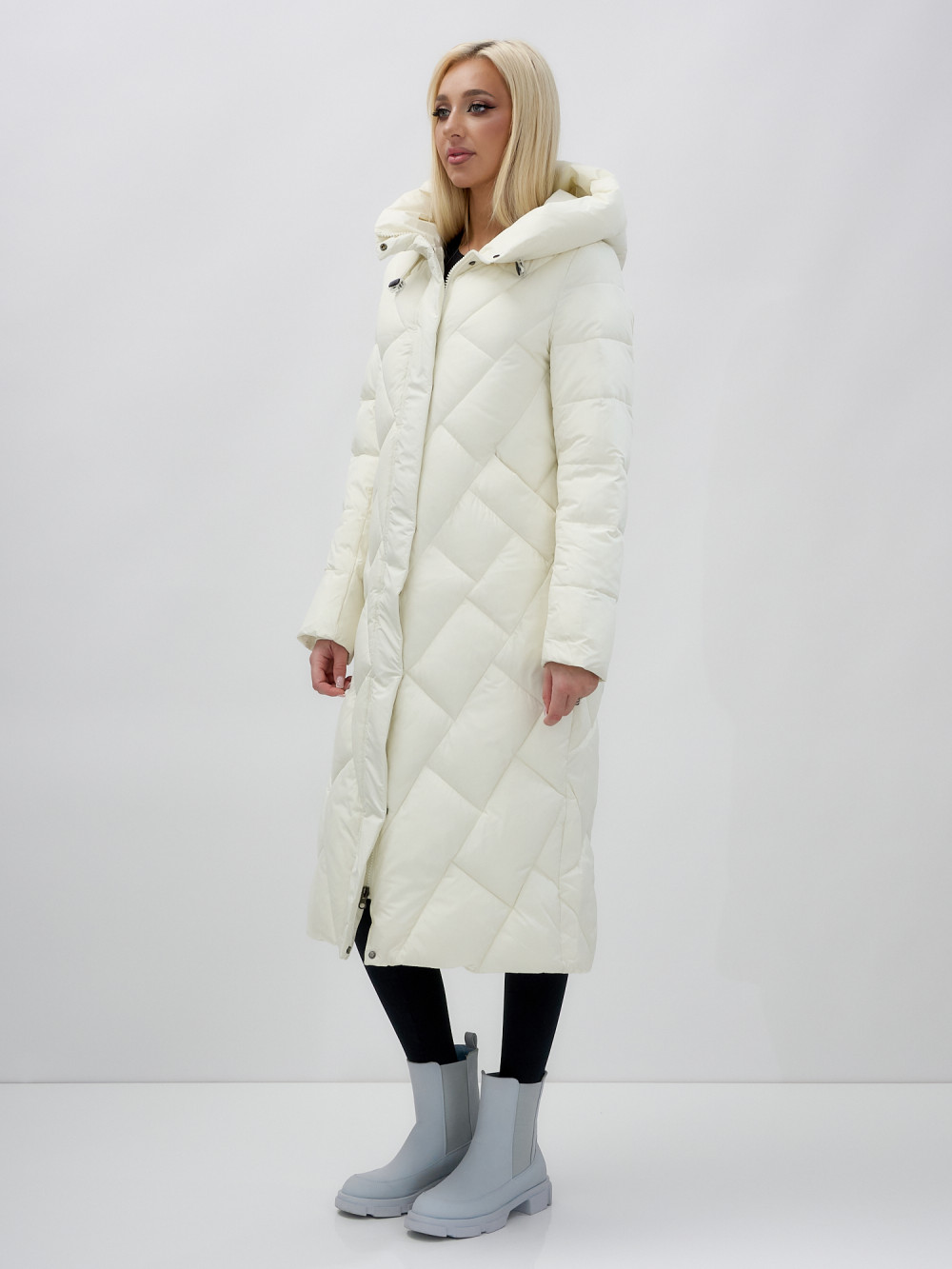 Пальто утепленное стеганное зимнее с капюшоном женское бежевого цвета 9612B — MTFORCE