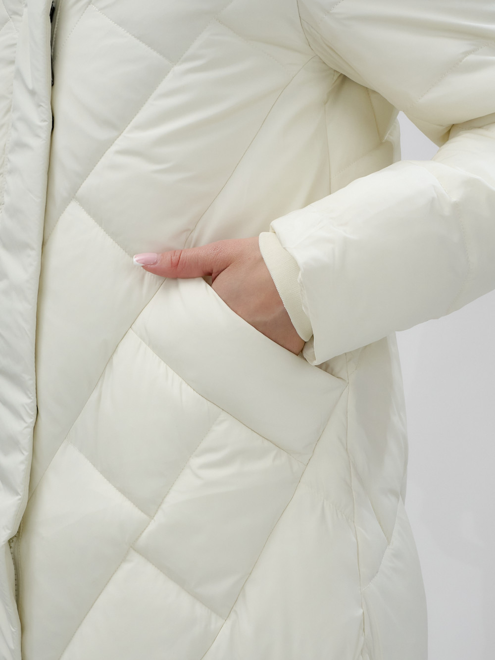 Пальто утепленное стеганное зимнее с капюшоном женское бежевого цвета 9612B