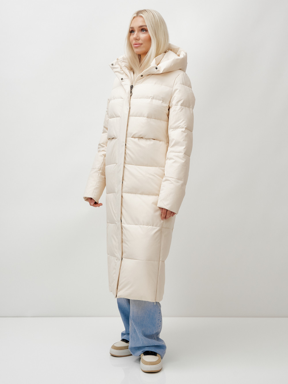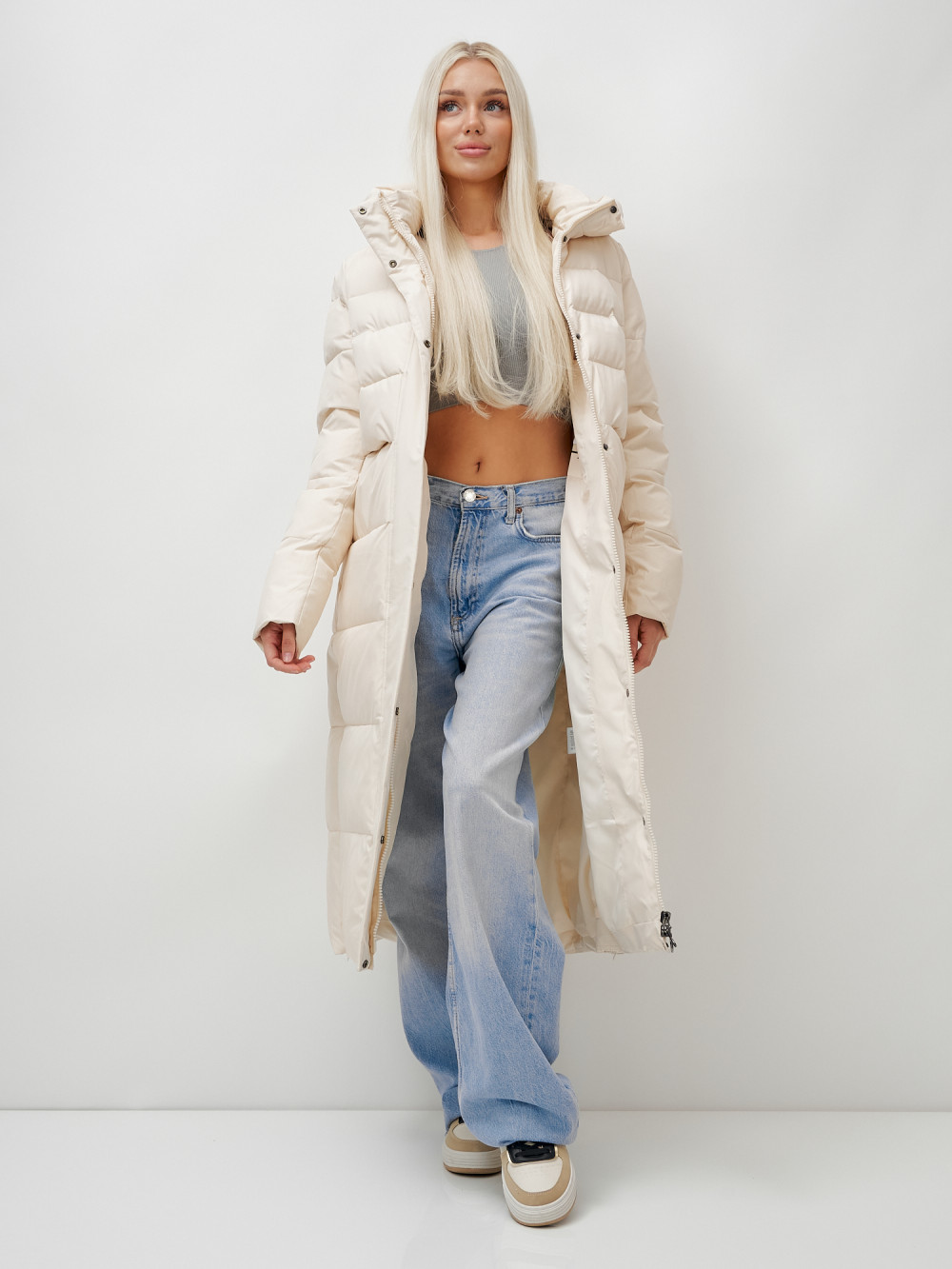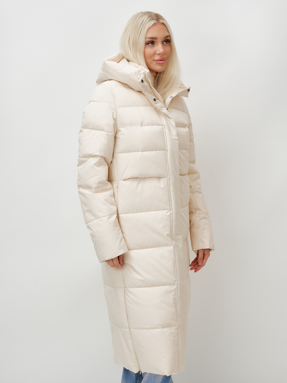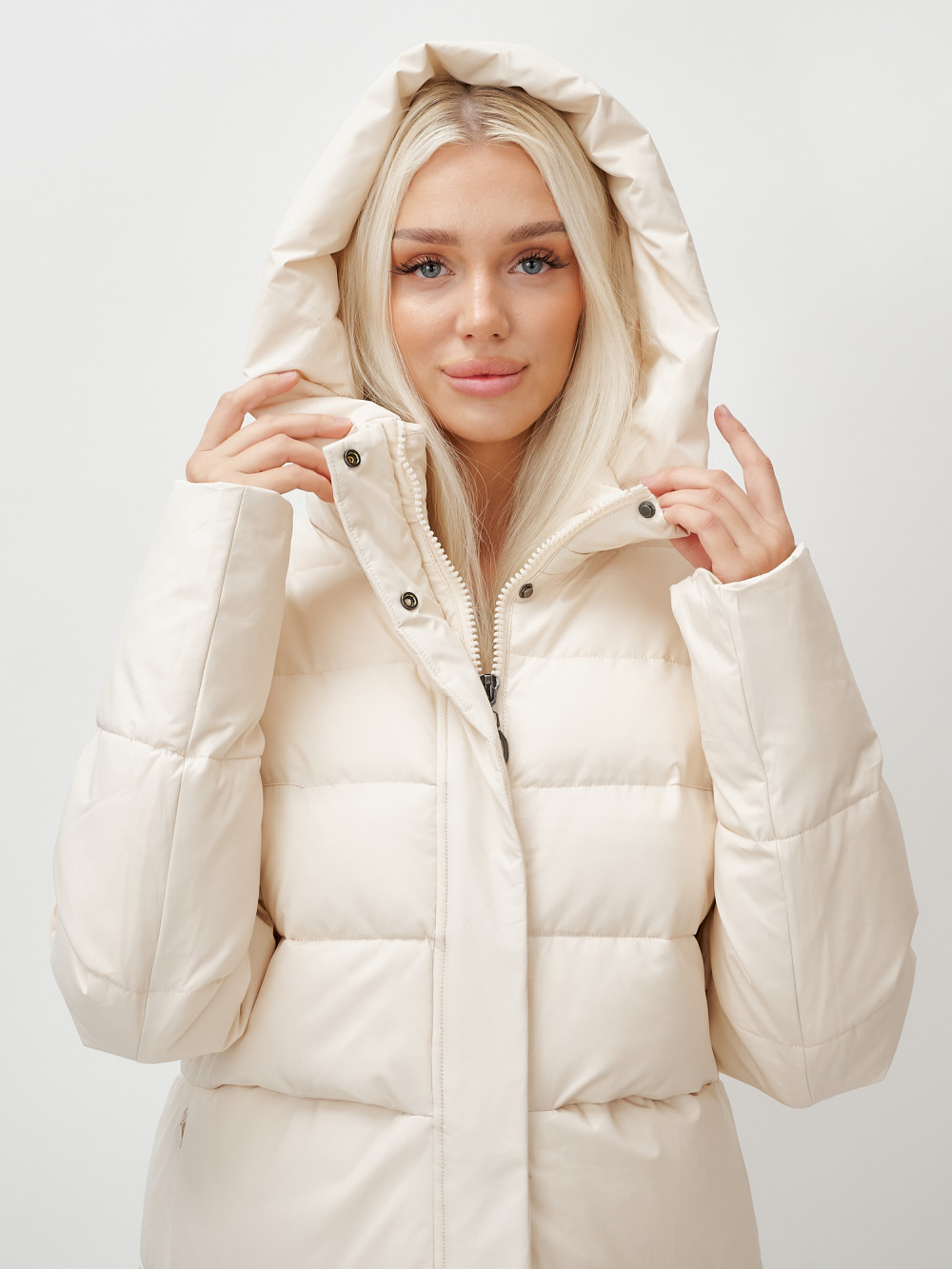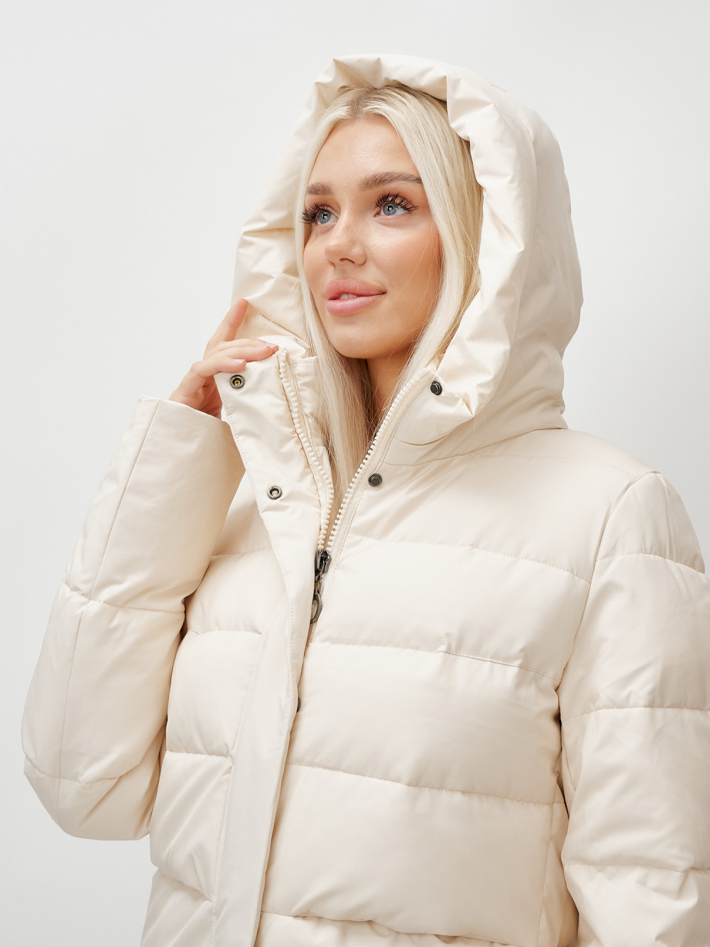 Пальто утепленное стеганное зимнее с капюшоном женское бежевого цвета 9620B — MTFORCE