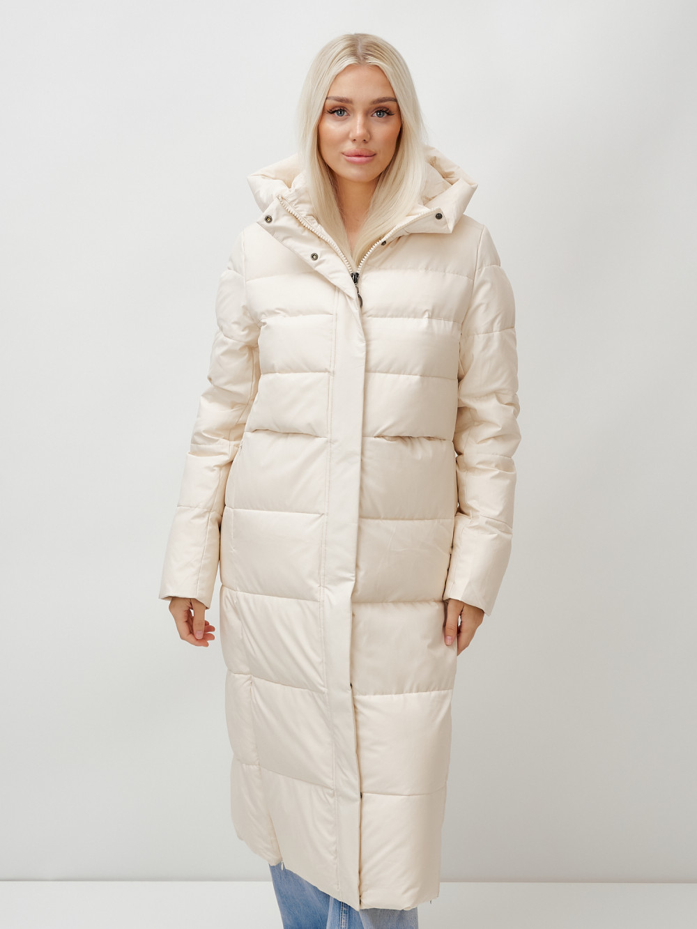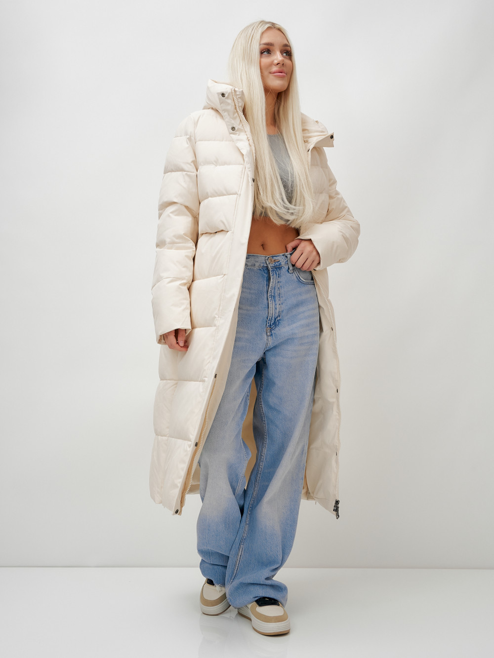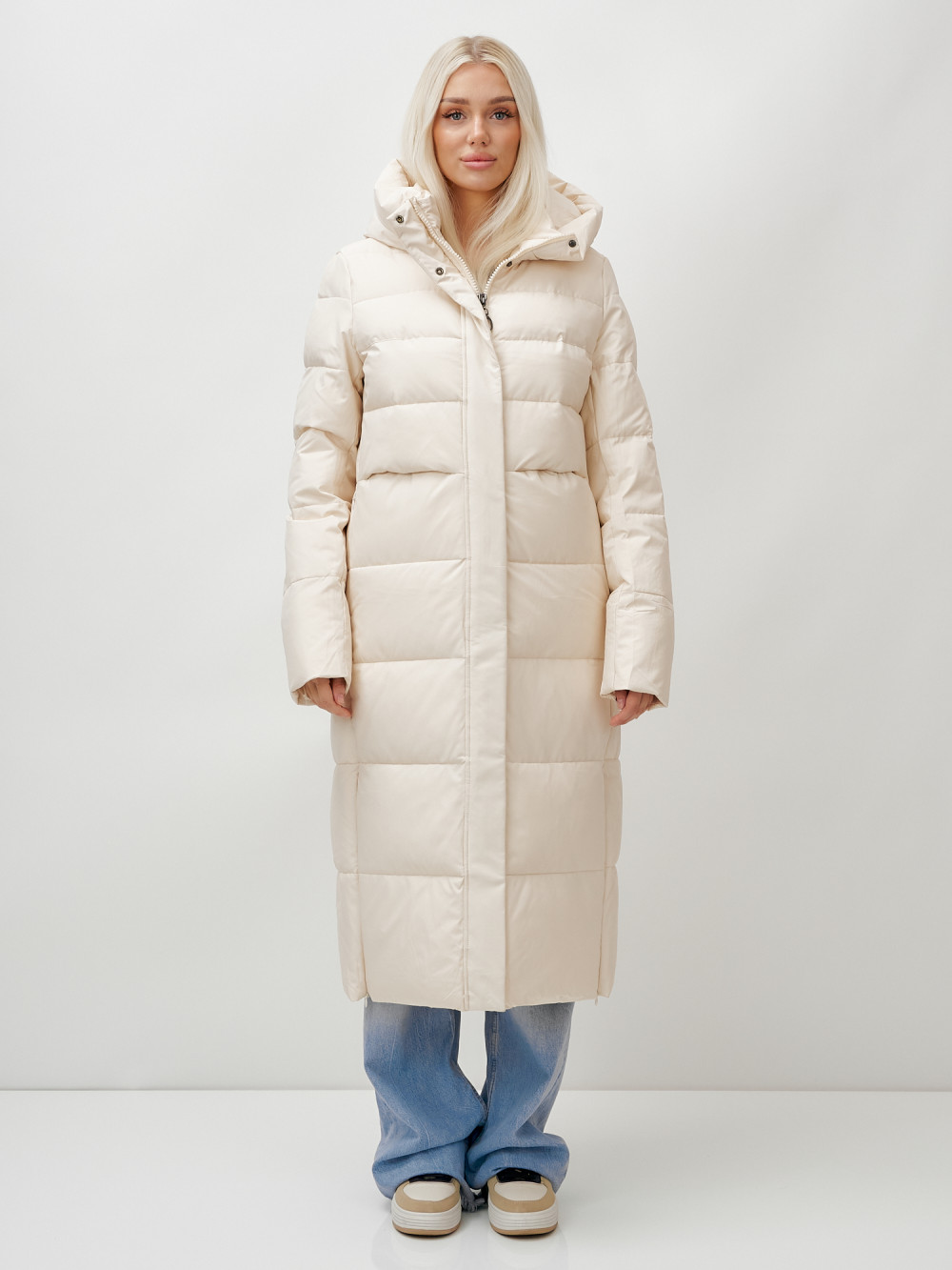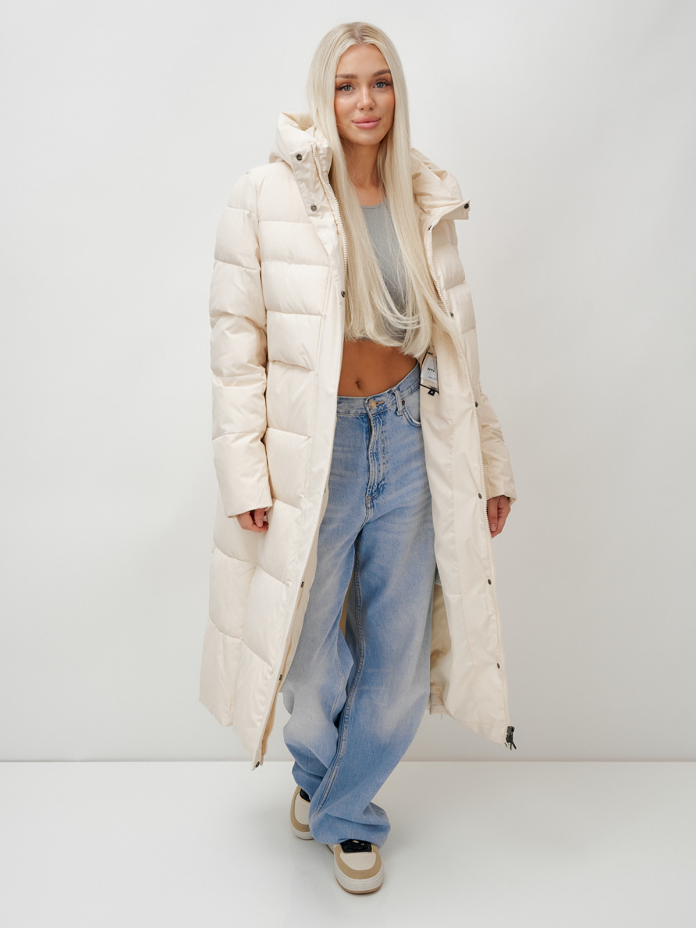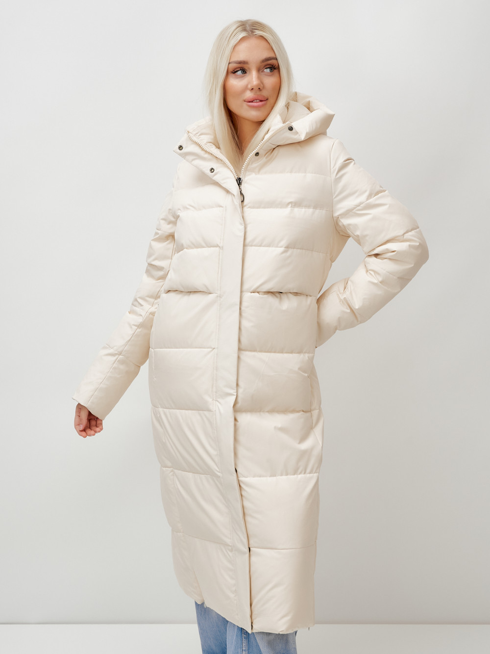 Пальто утепленное стеганное зимнее с капюшоном женское бежевого цвета 9620B — MTFORCE