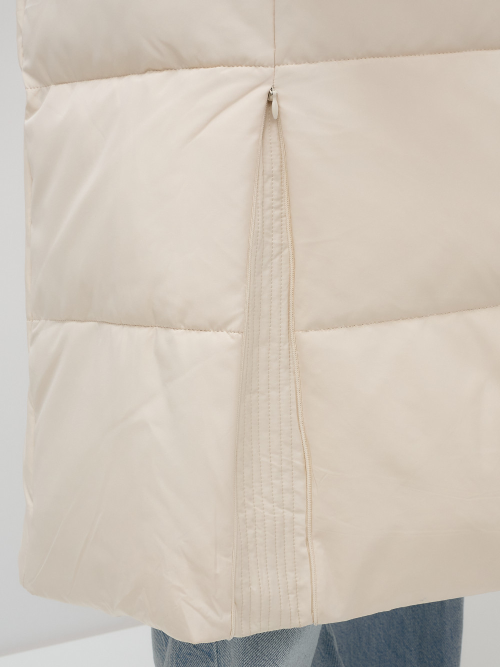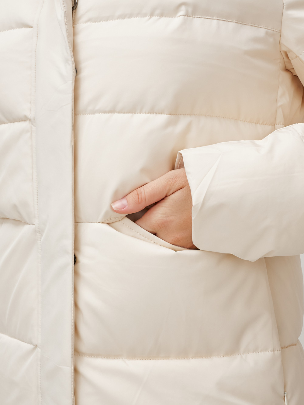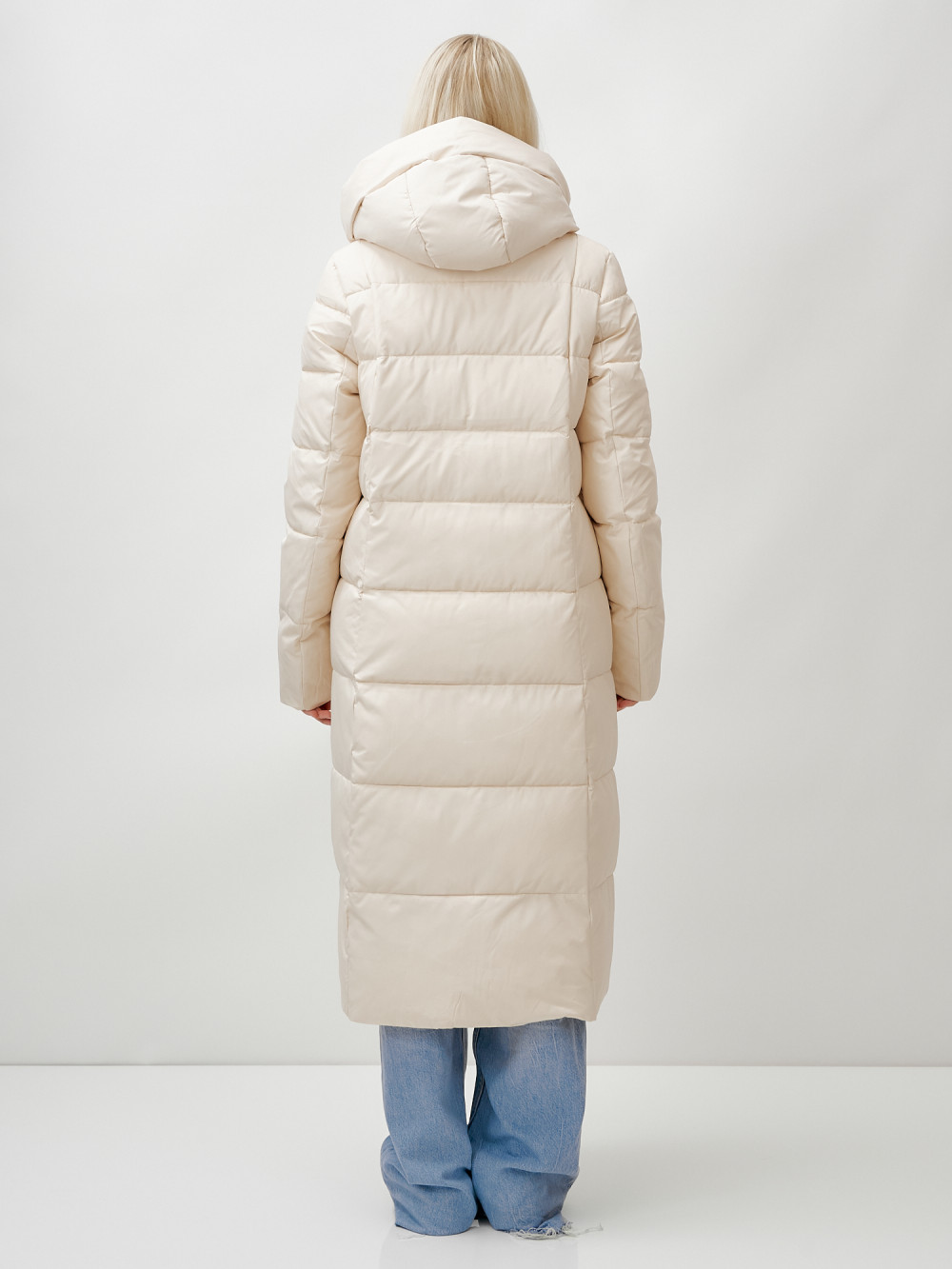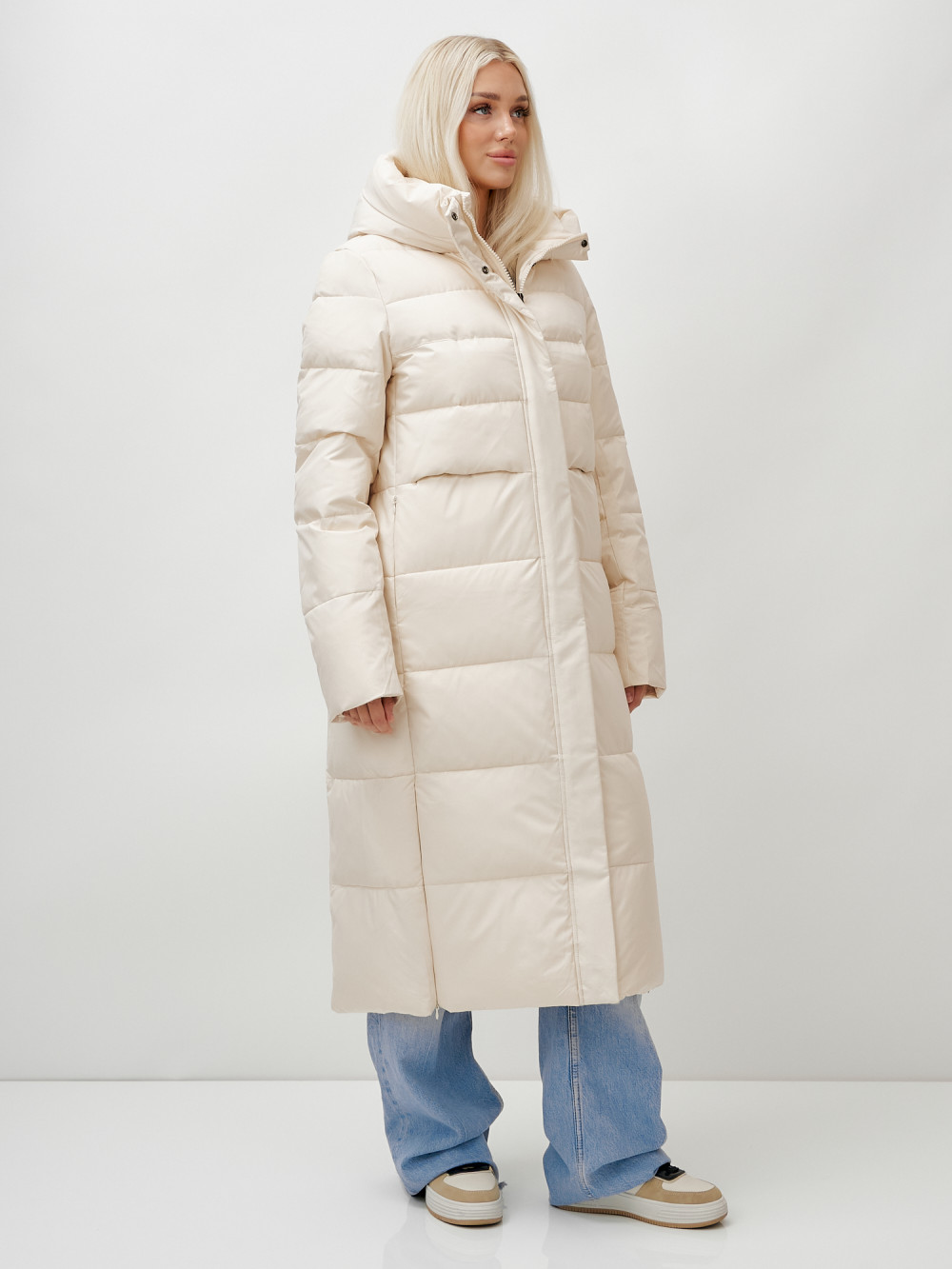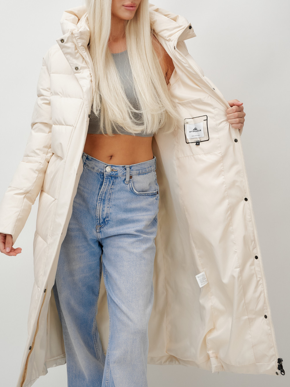 Пальто утепленное стеганное зимнее с капюшоном женское бежевого цвета 9620B — MTFORCE