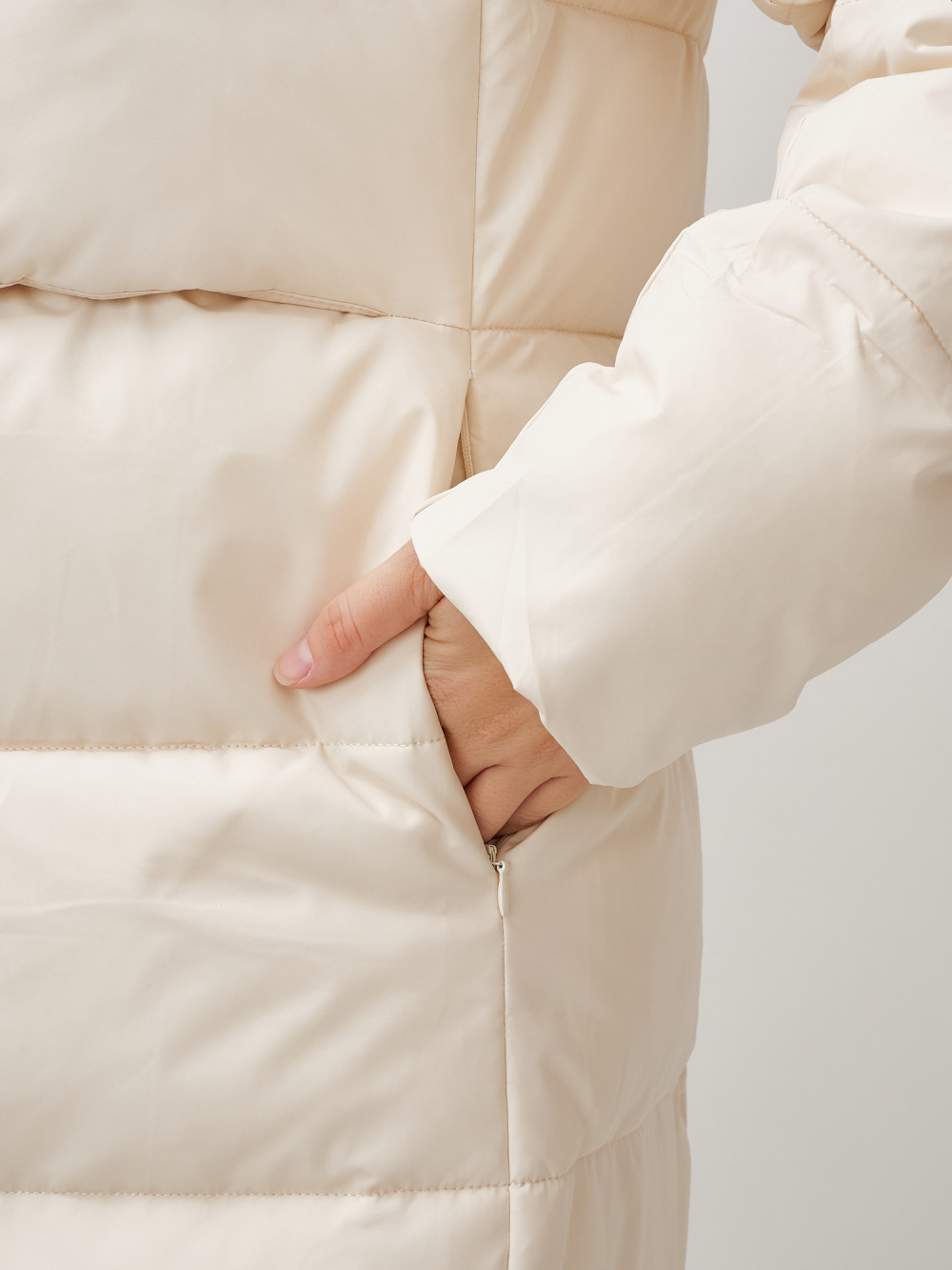Пальто утепленное стеганное зимнее с капюшоном женское бежевого цвета 9620B