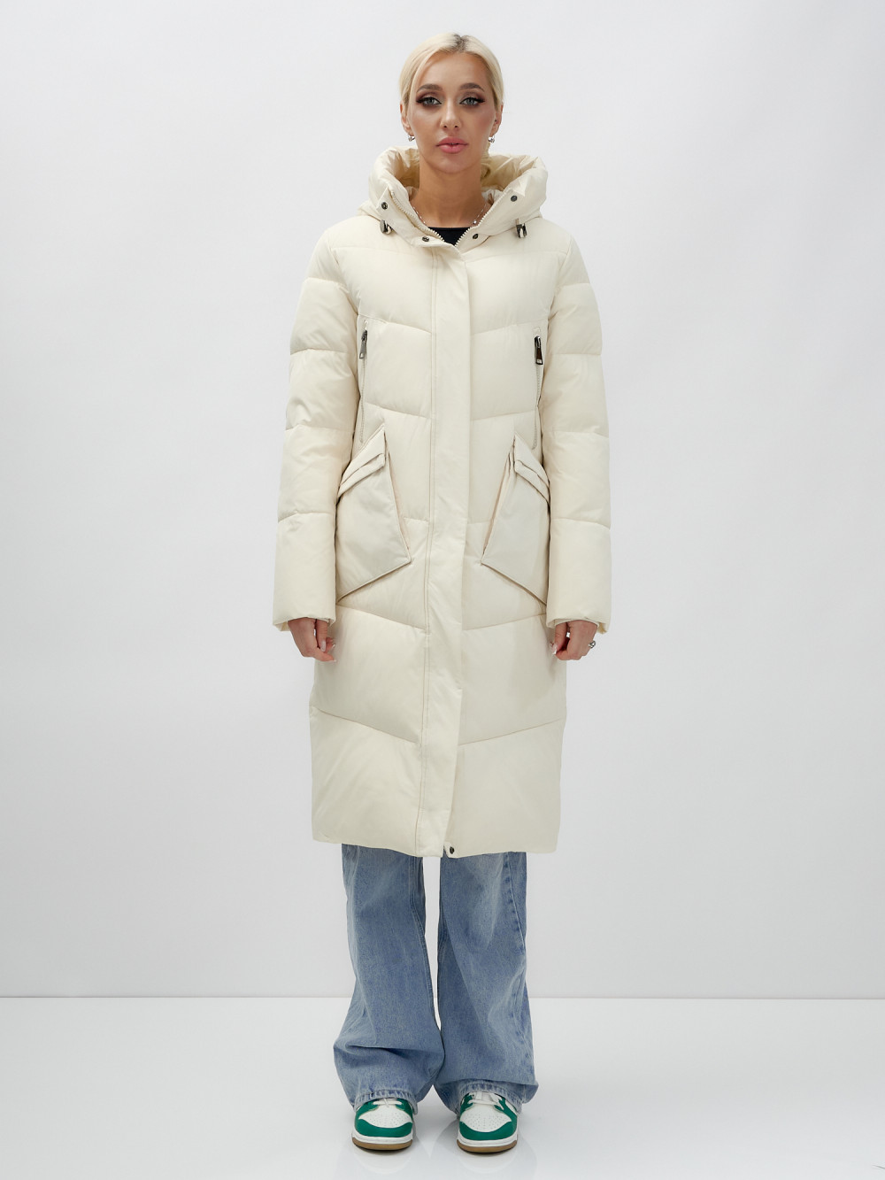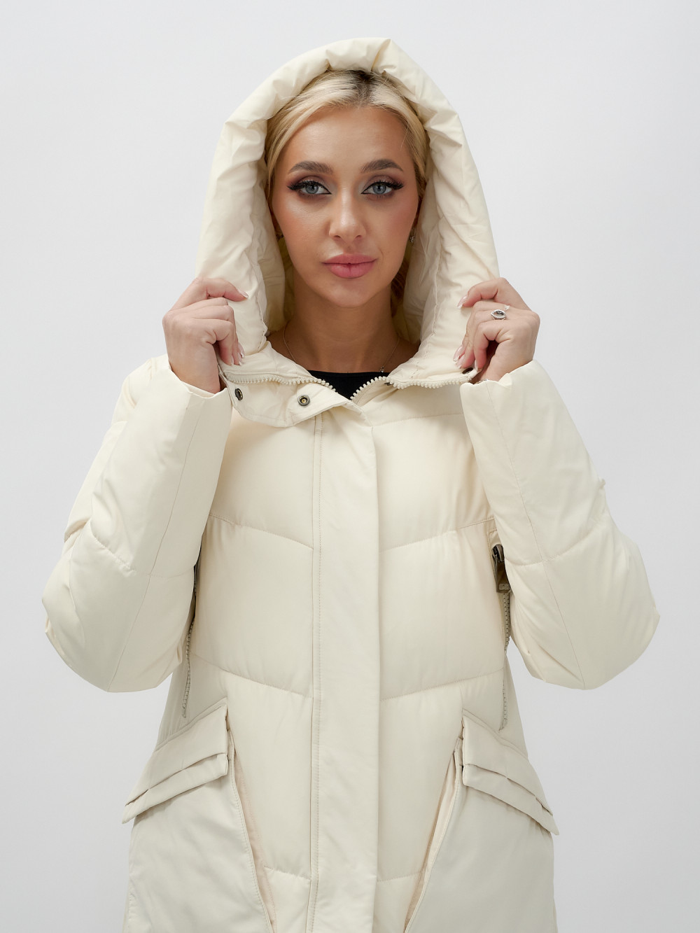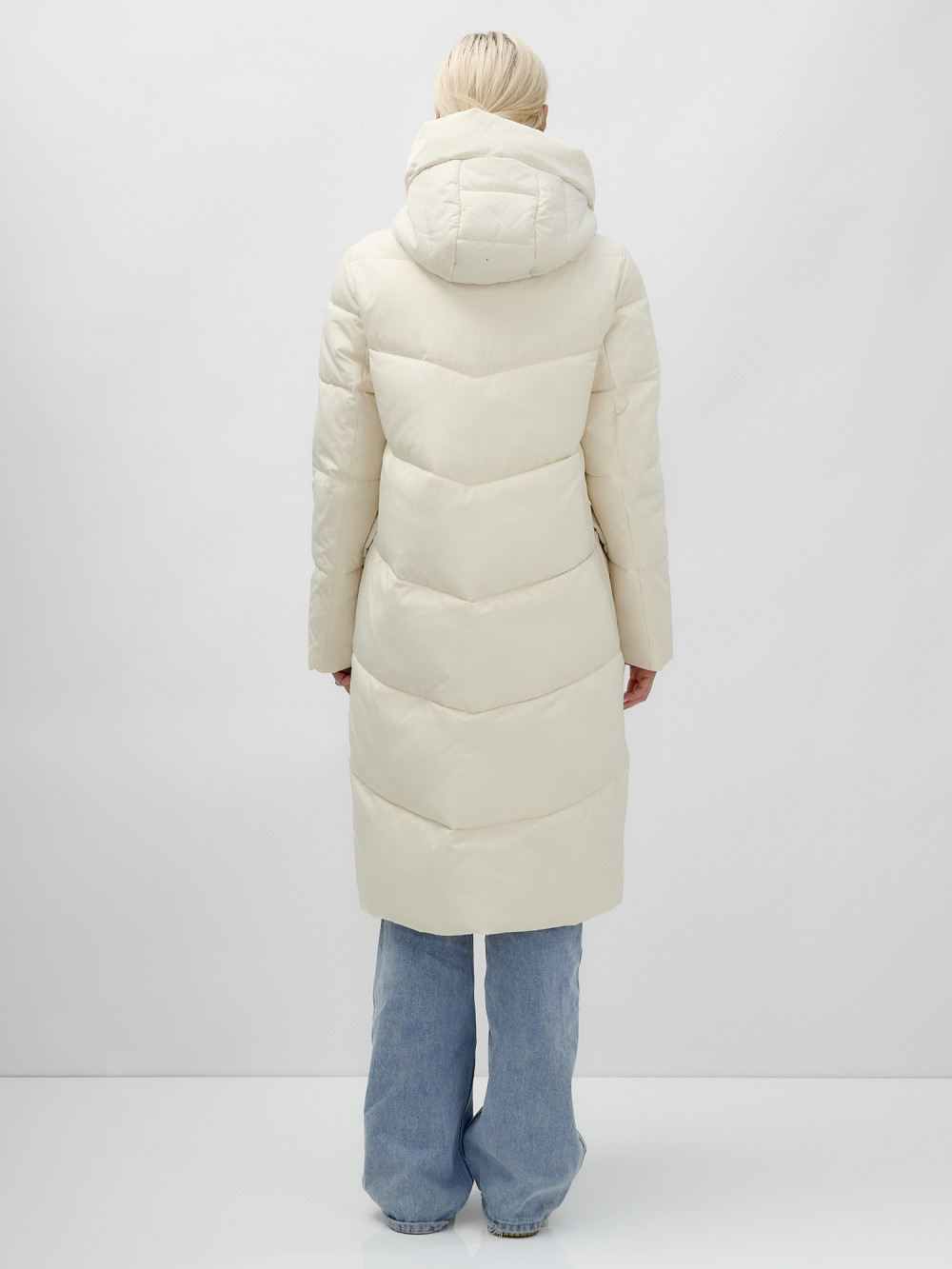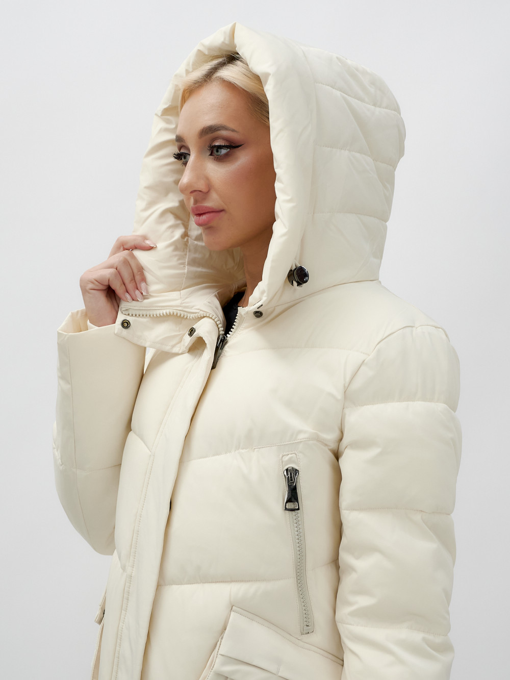 Пальто утепленное стеганное зимнее с капюшоном женское бежевого цвета 9639B — MTFORCE