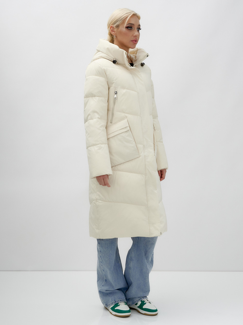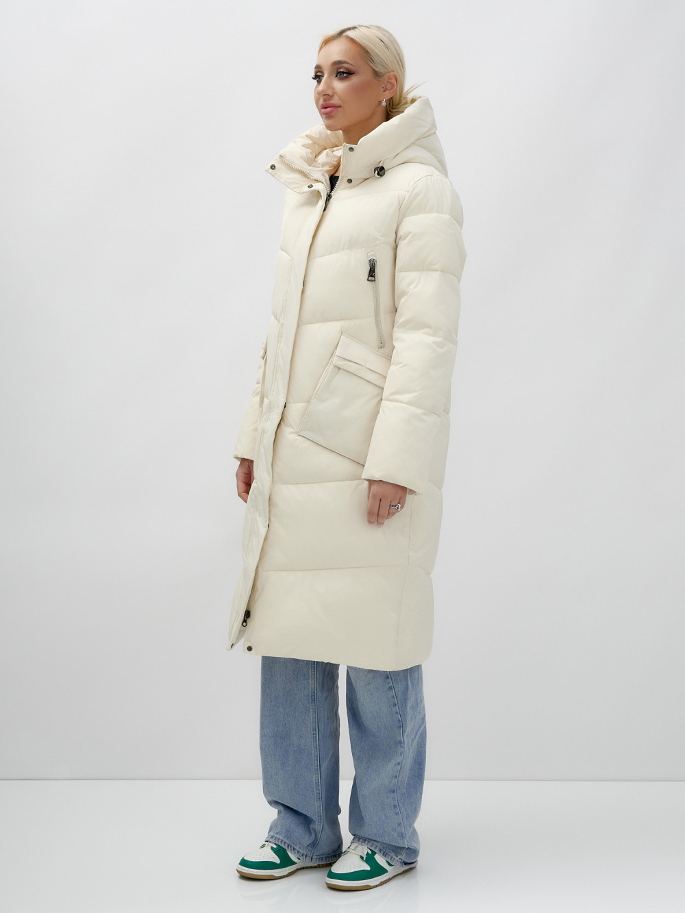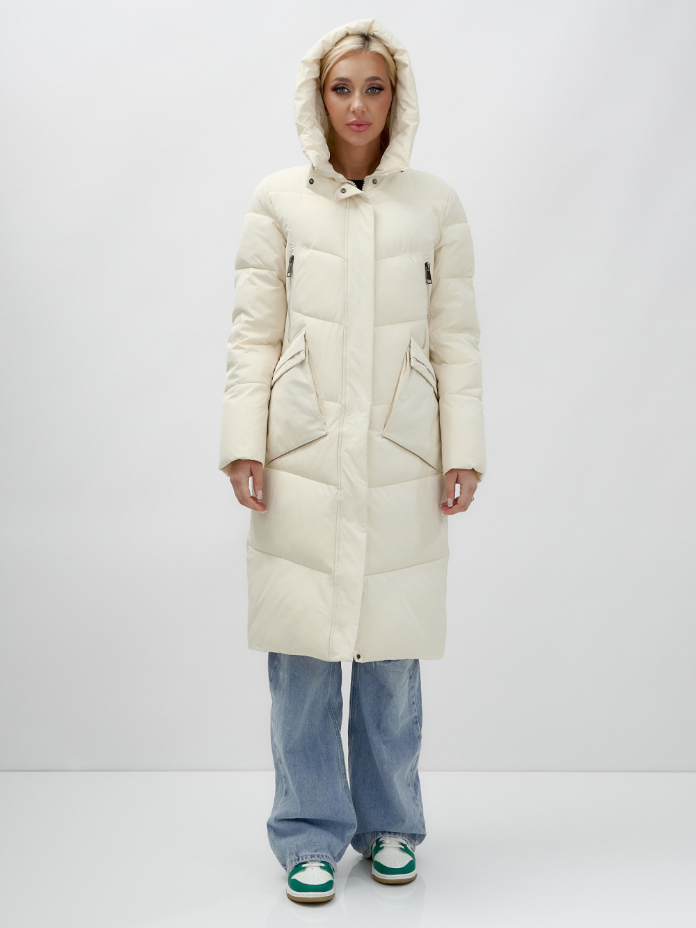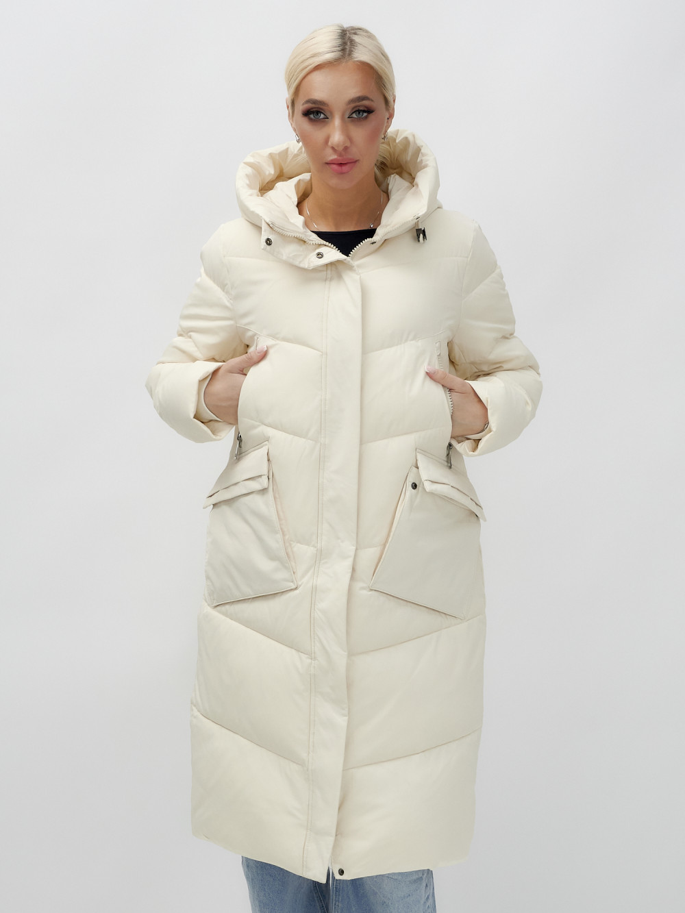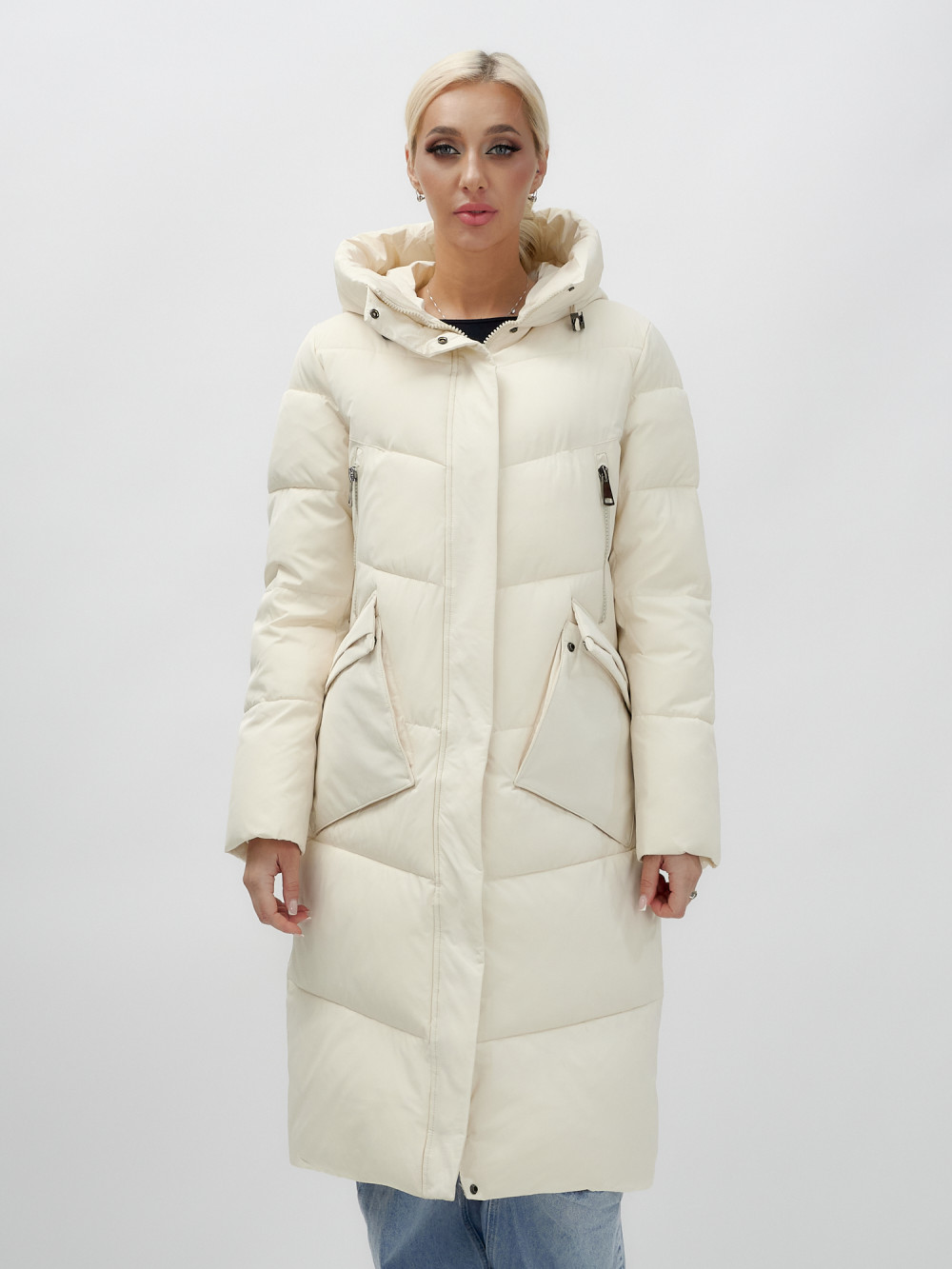 Пальто утепленное стеганное зимнее с капюшоном женское бежевого цвета 9639B — MTFORCE