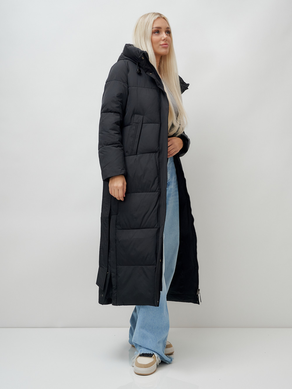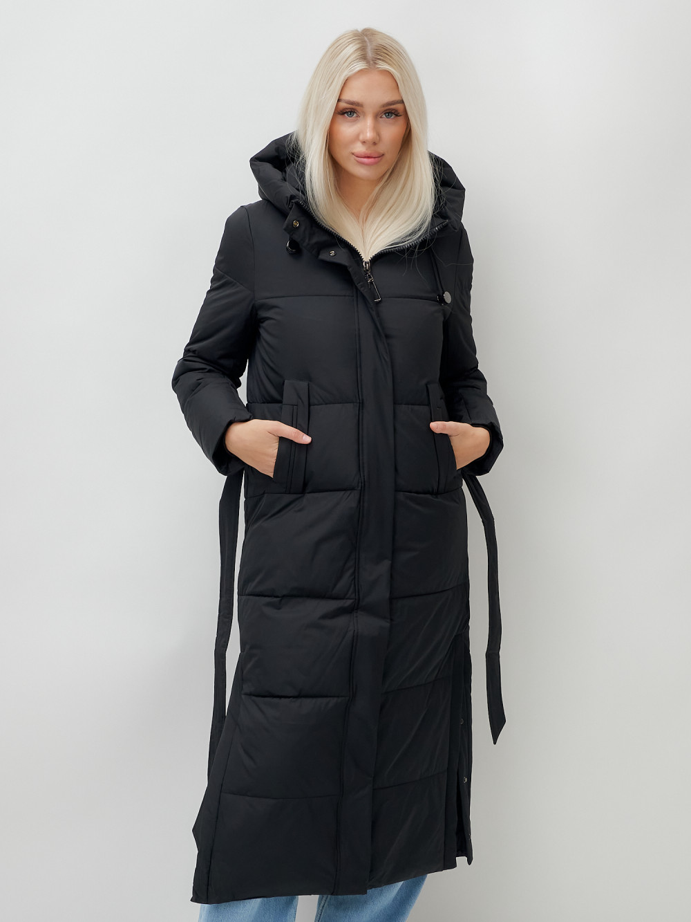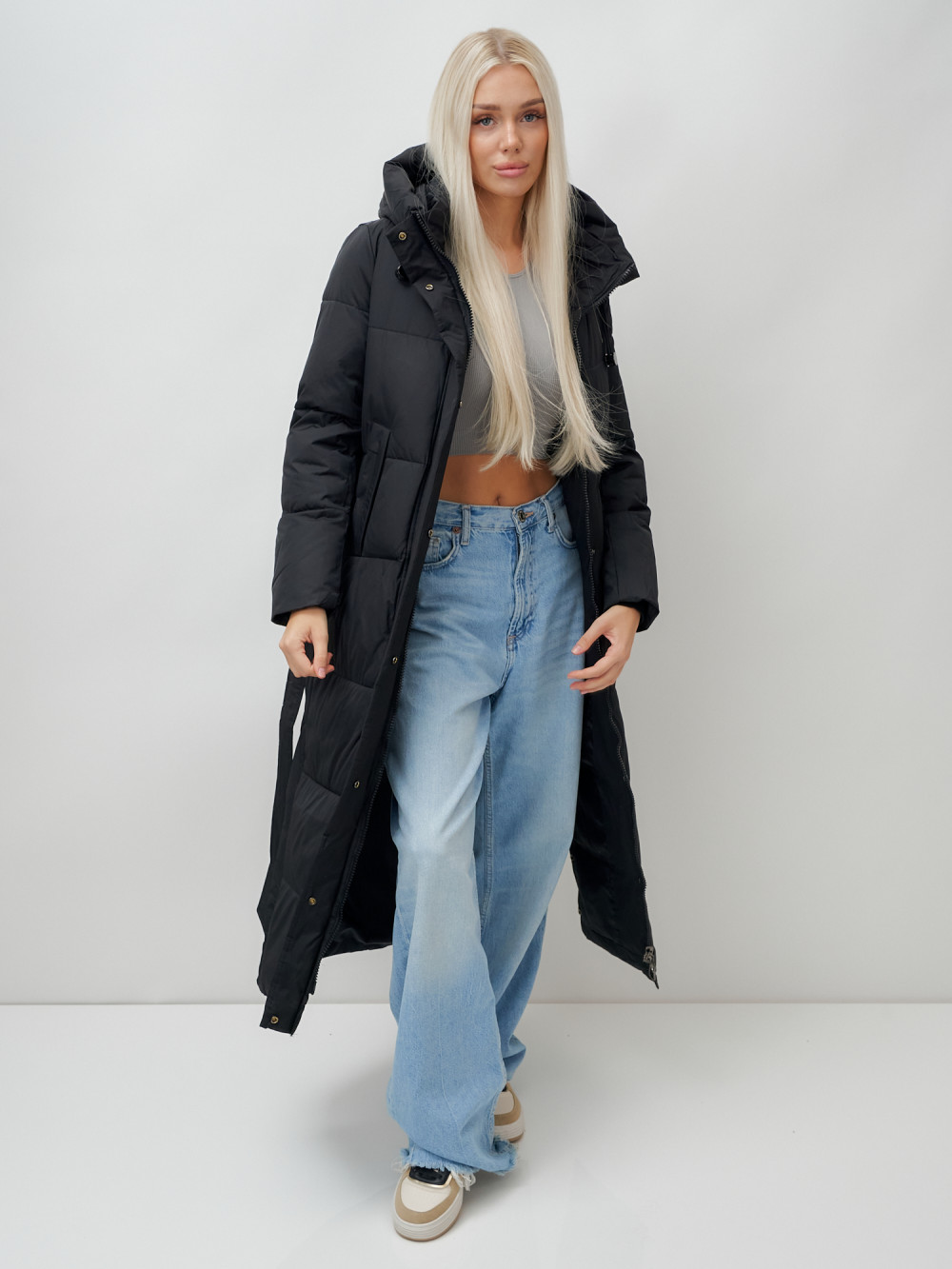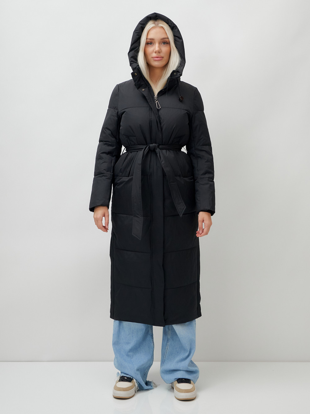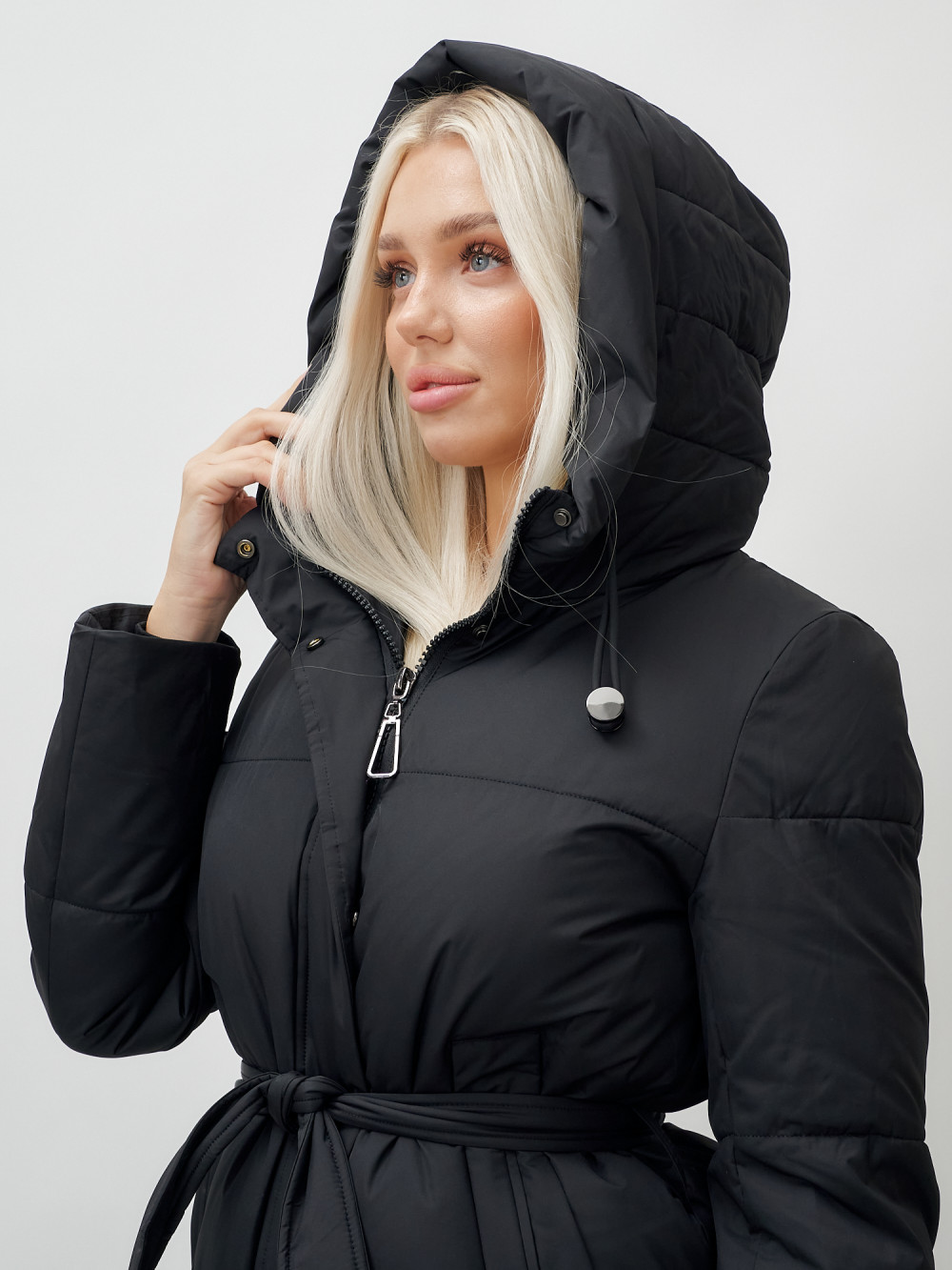 Пальто утепленное стеганное зимнее с капюшоном женское черного цвета 9605Ch — MTFORCE