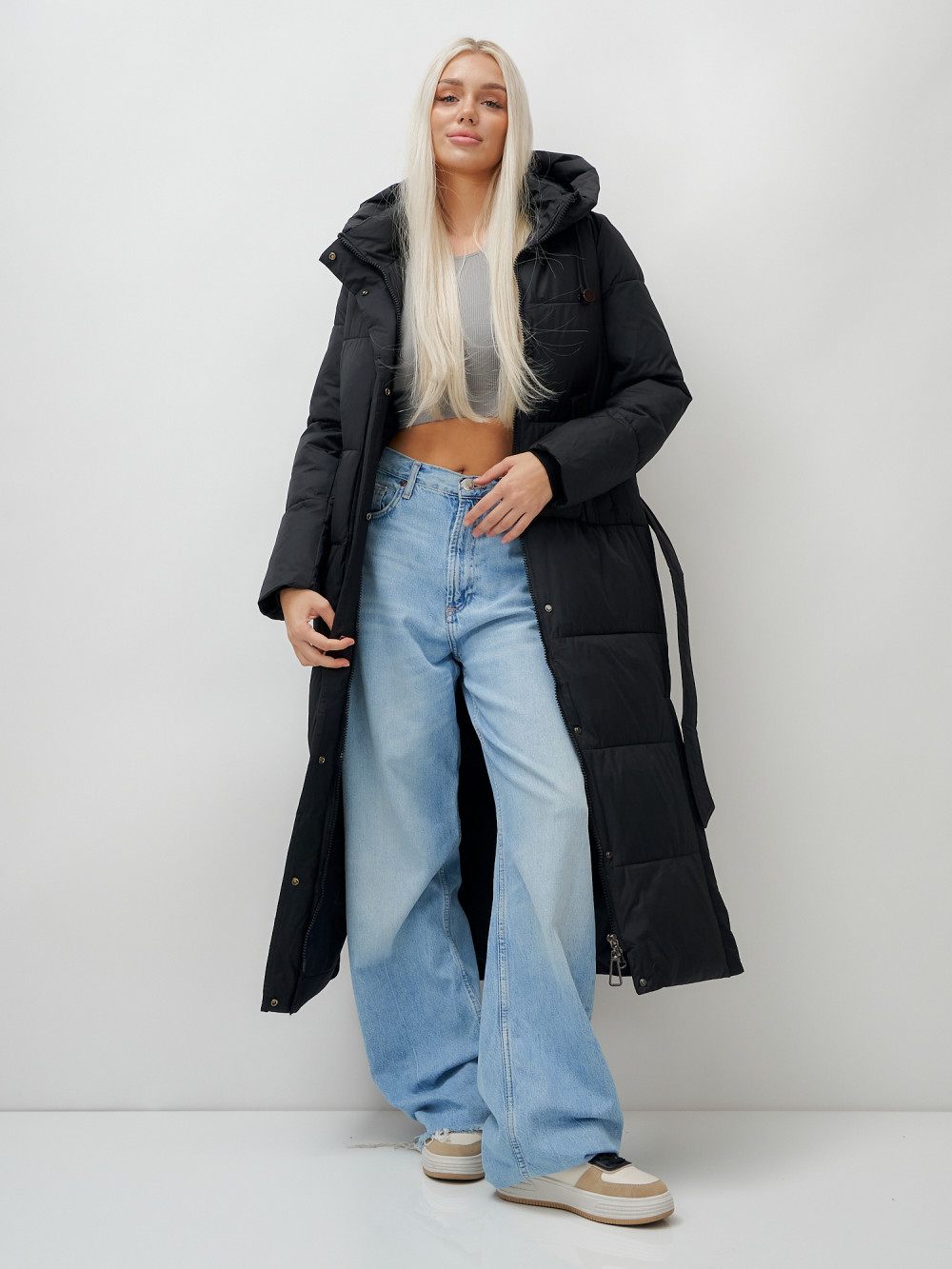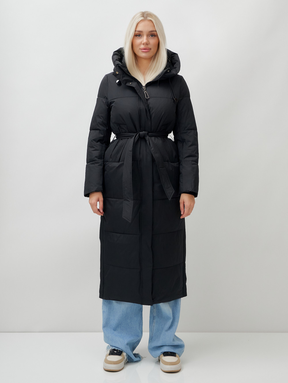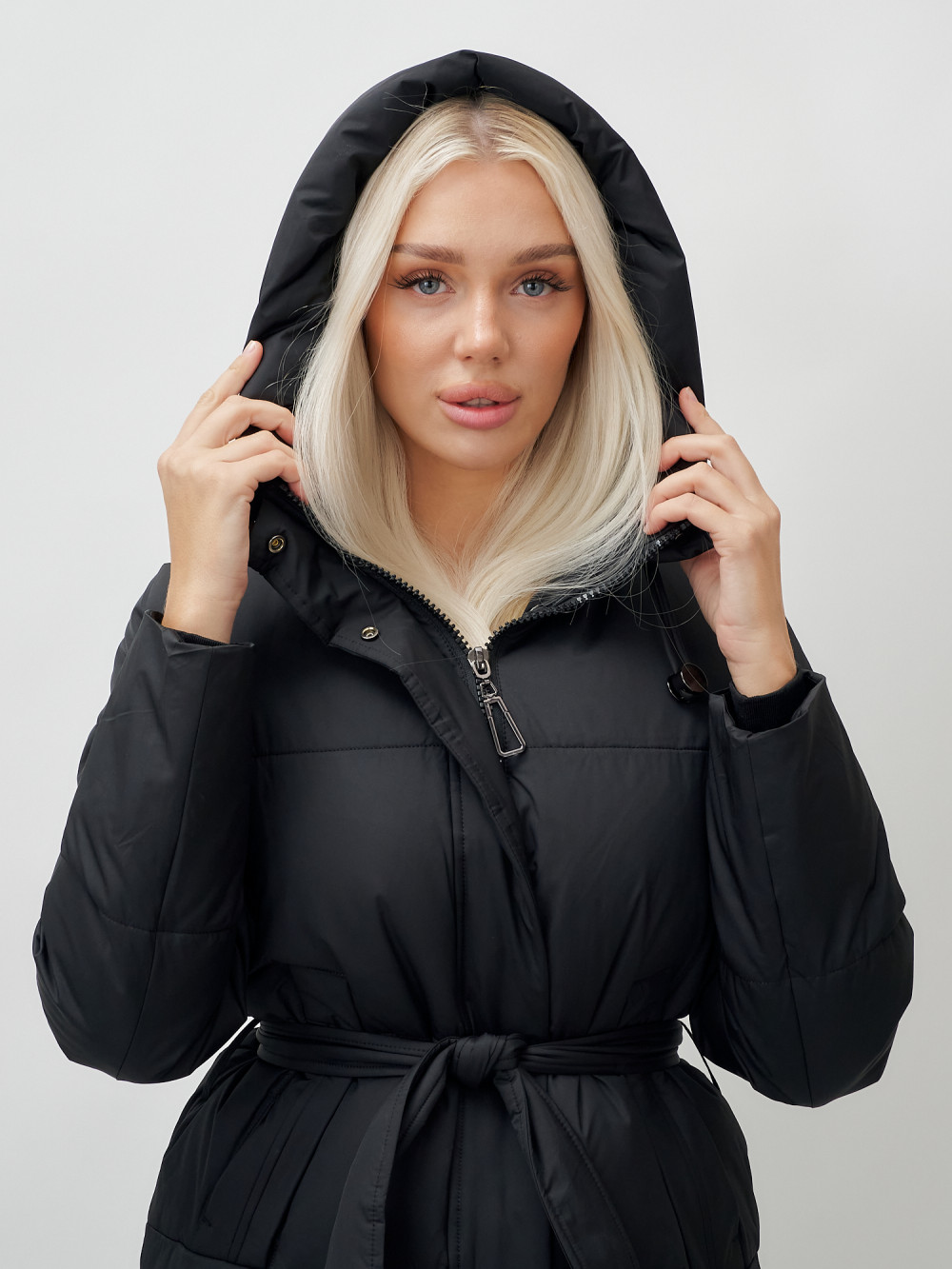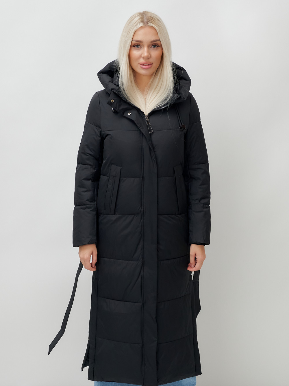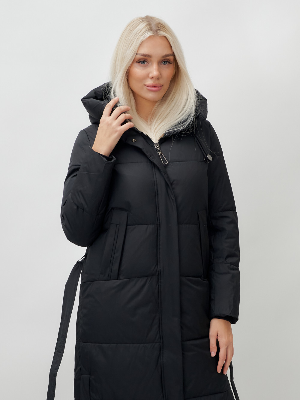 Пальто утепленное стеганное зимнее с капюшоном женское черного цвета 9605Ch — MTFORCE