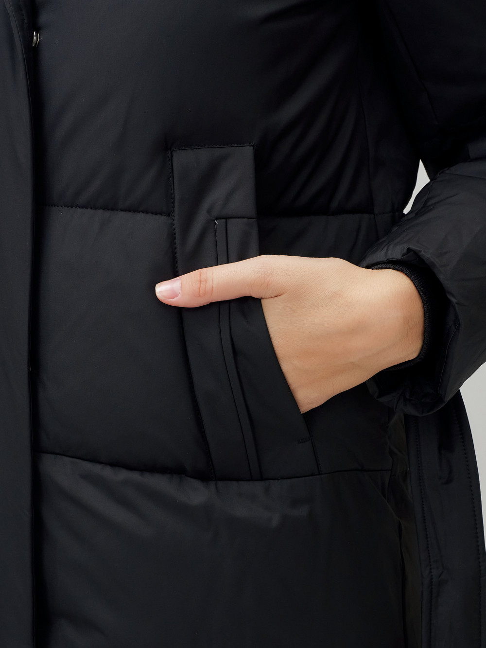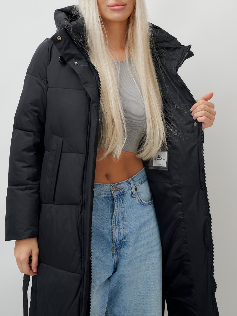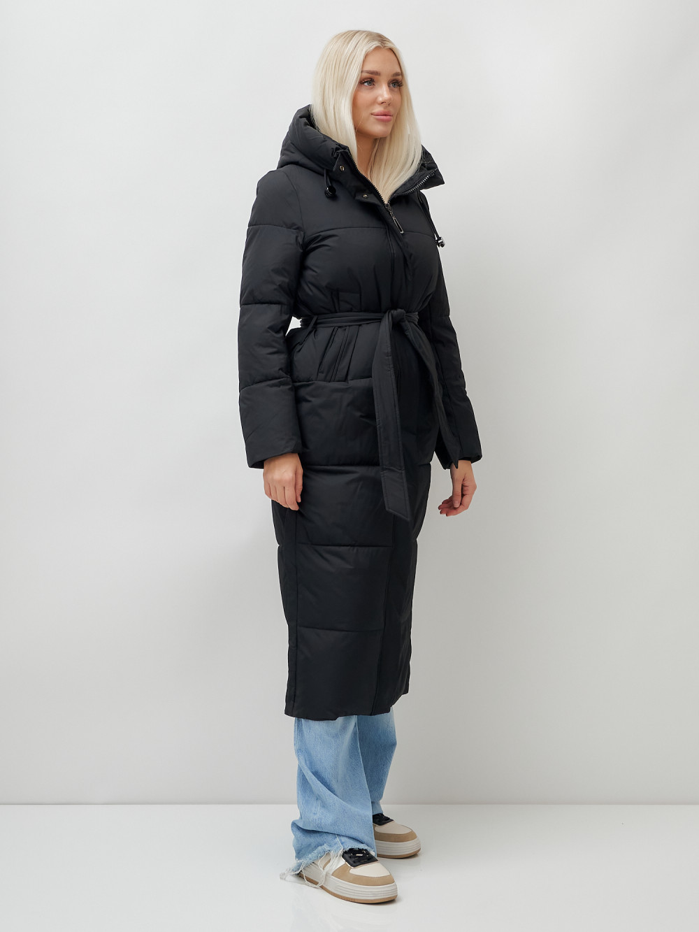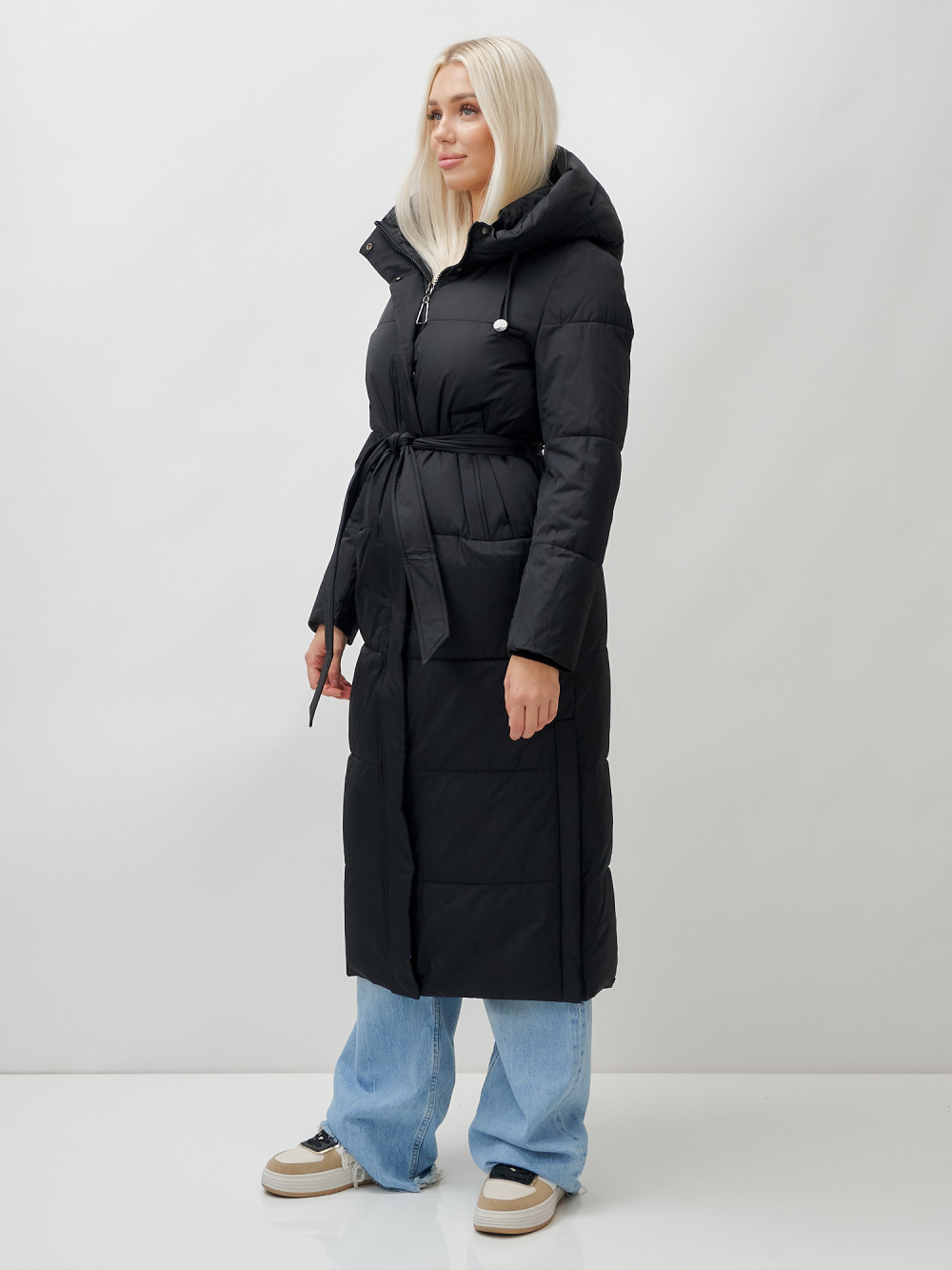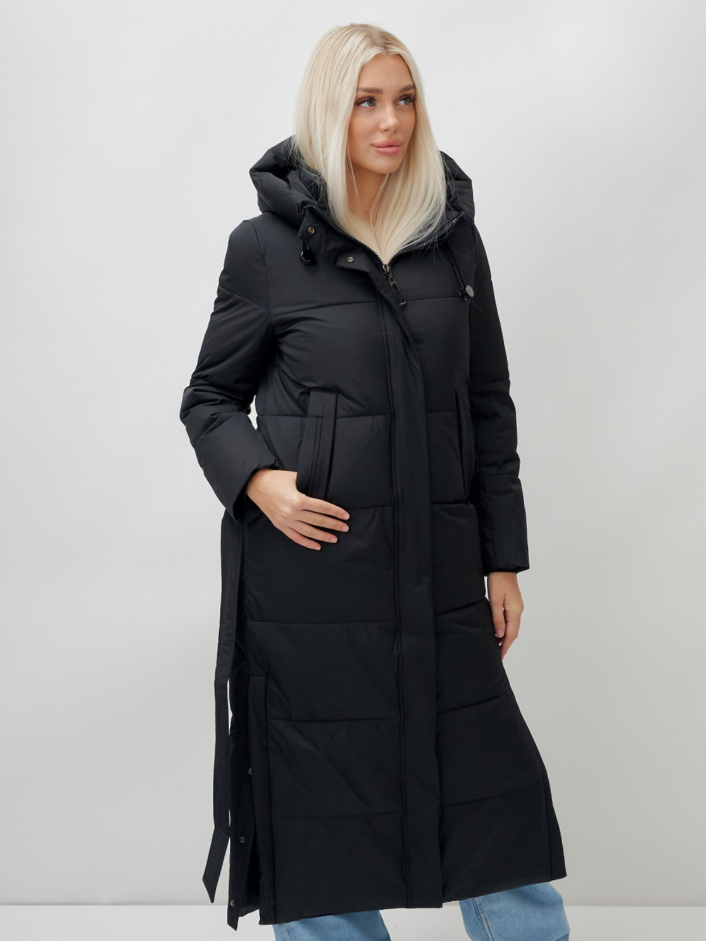 Пальто утепленное стеганное зимнее с капюшоном женское черного цвета 9605Ch — MTFORCE