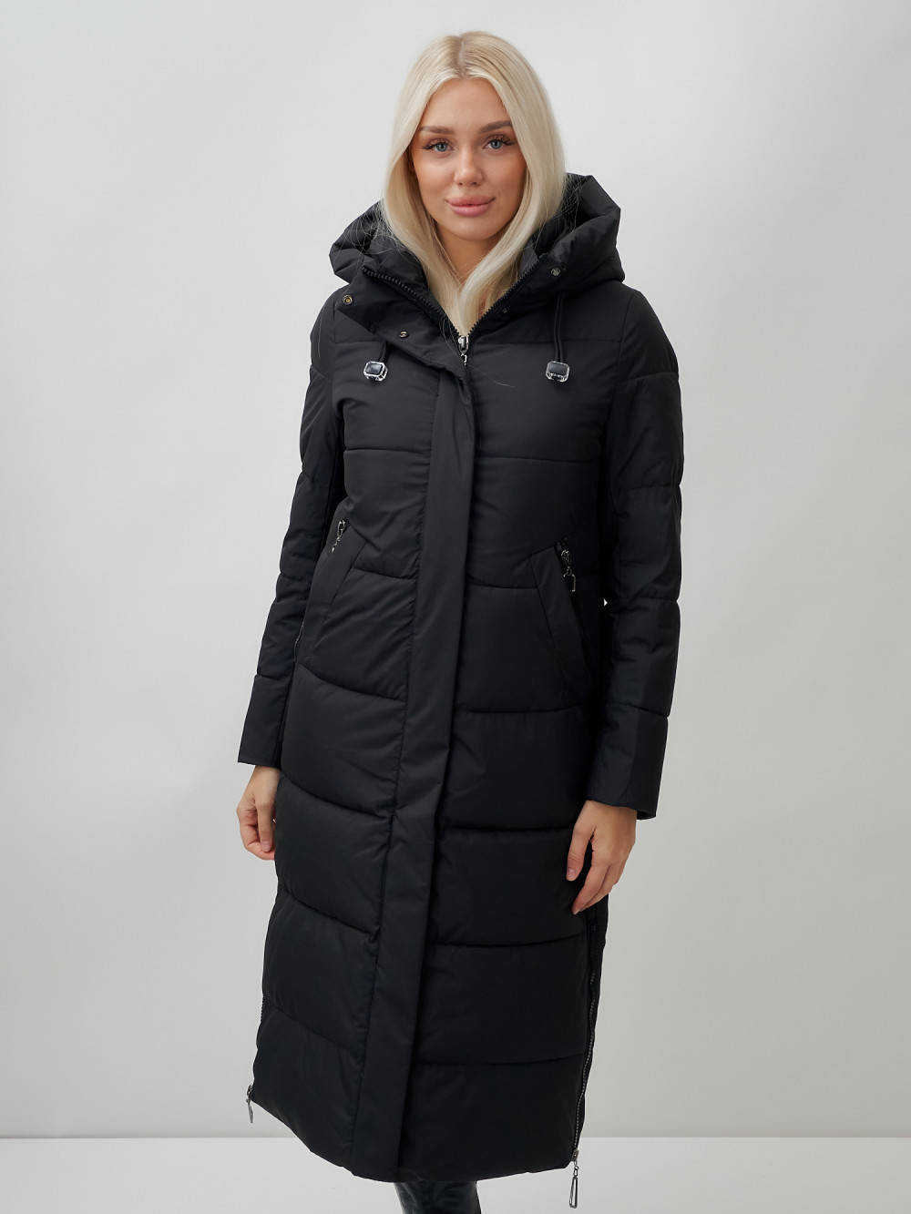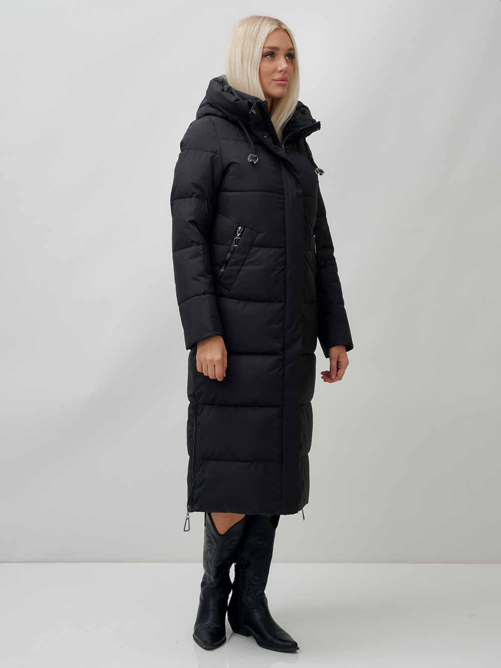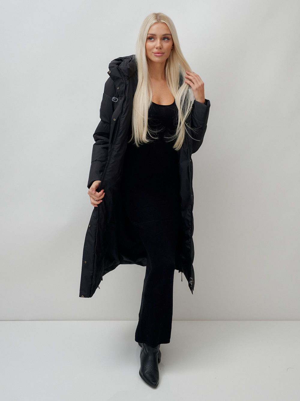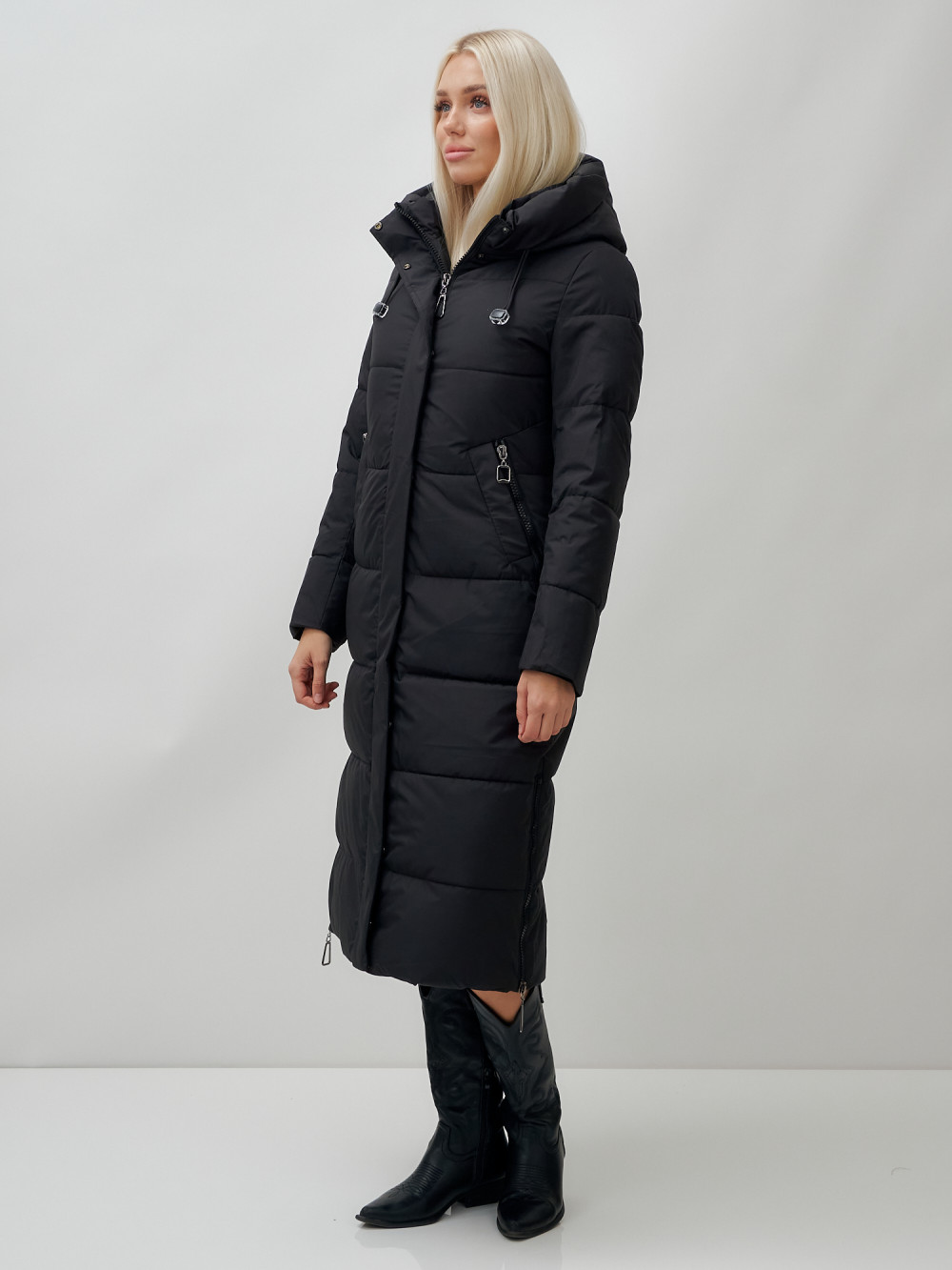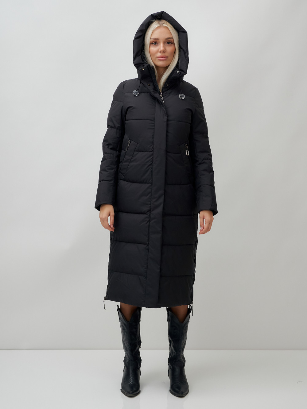 Пальто утепленное стеганное зимнее с капюшоном женское черного цвета 9607Ch — MTFORCE