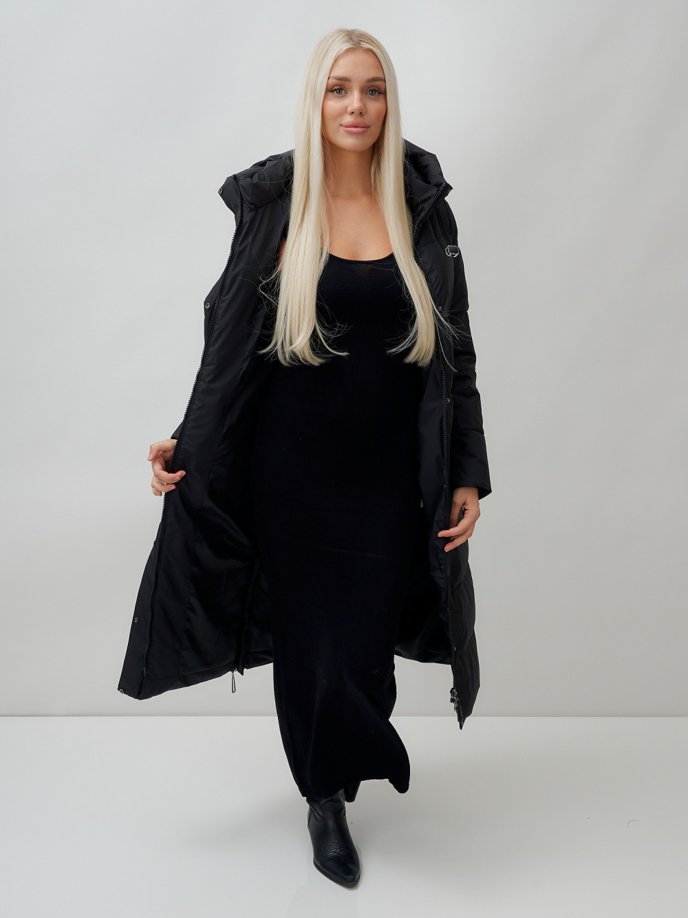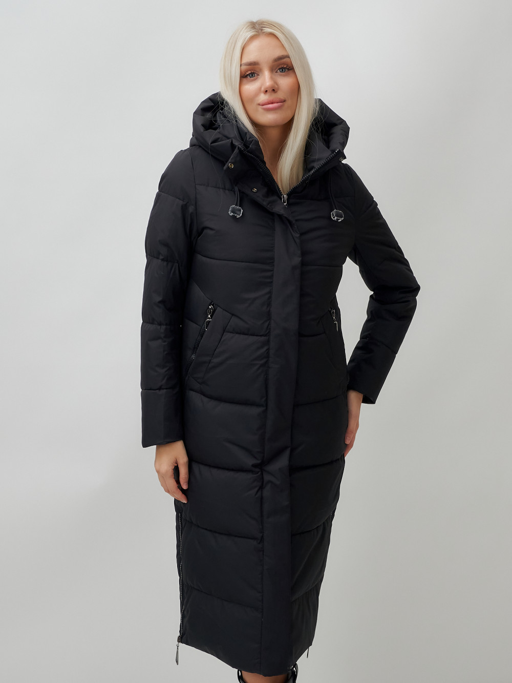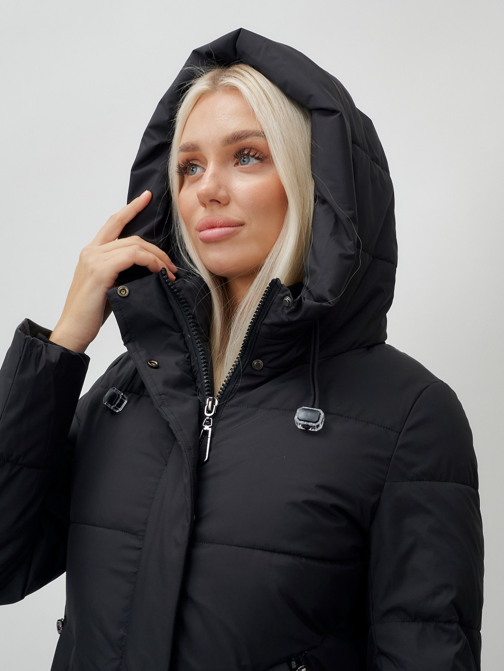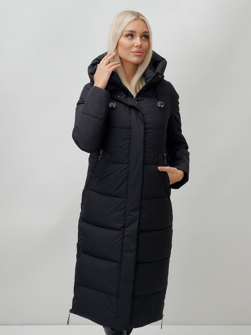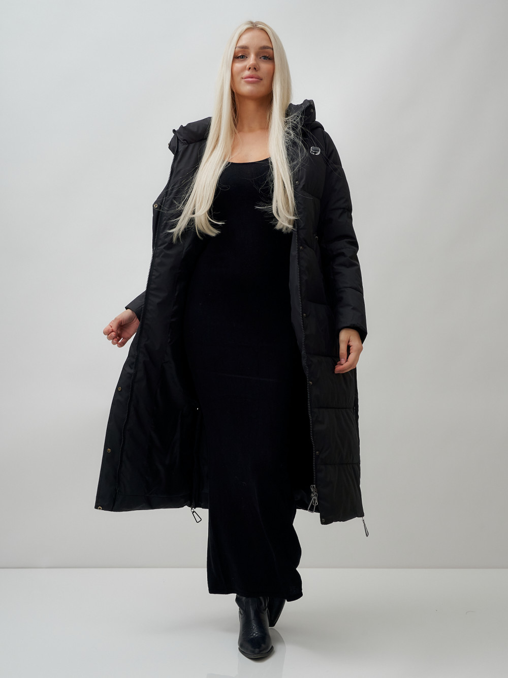 Пальто утепленное стеганное зимнее с капюшоном женское черного цвета 9607Ch — MTFORCE