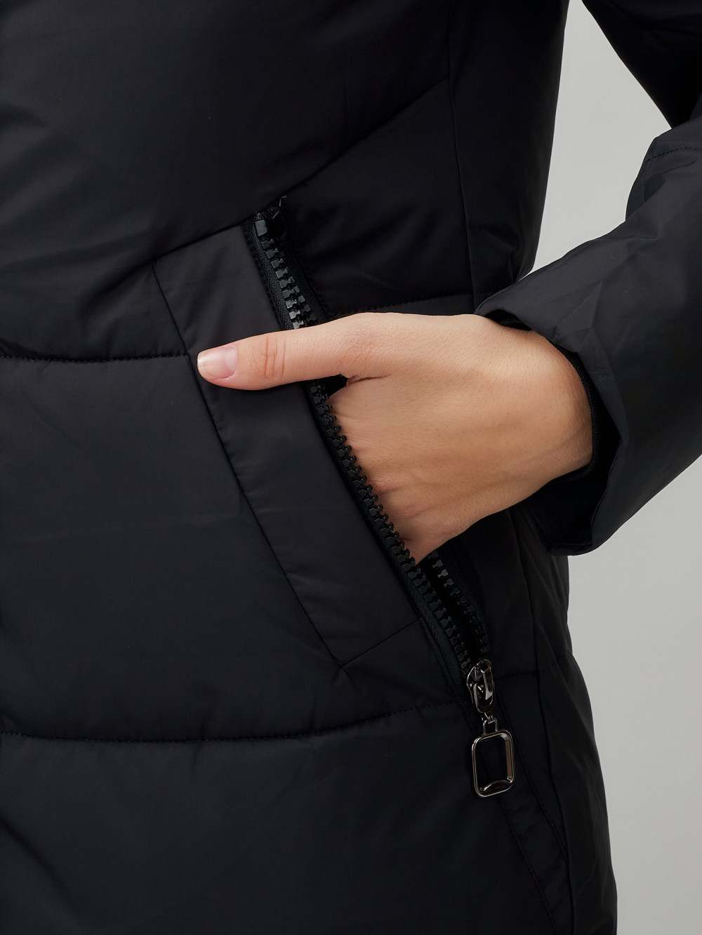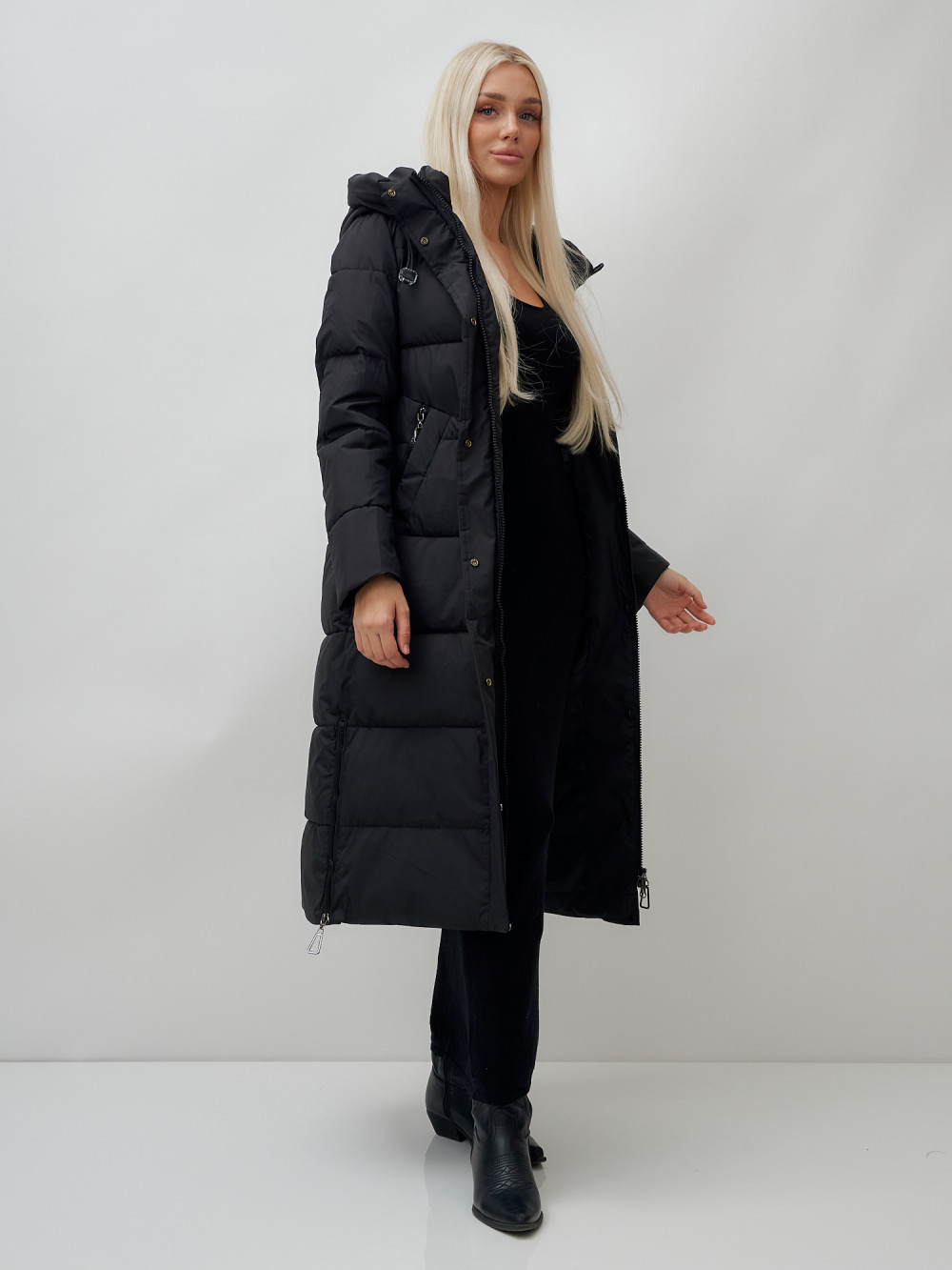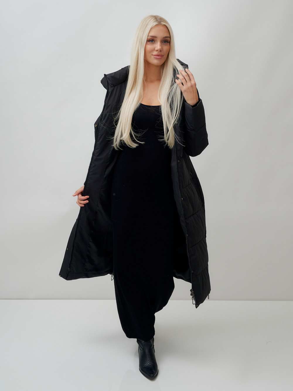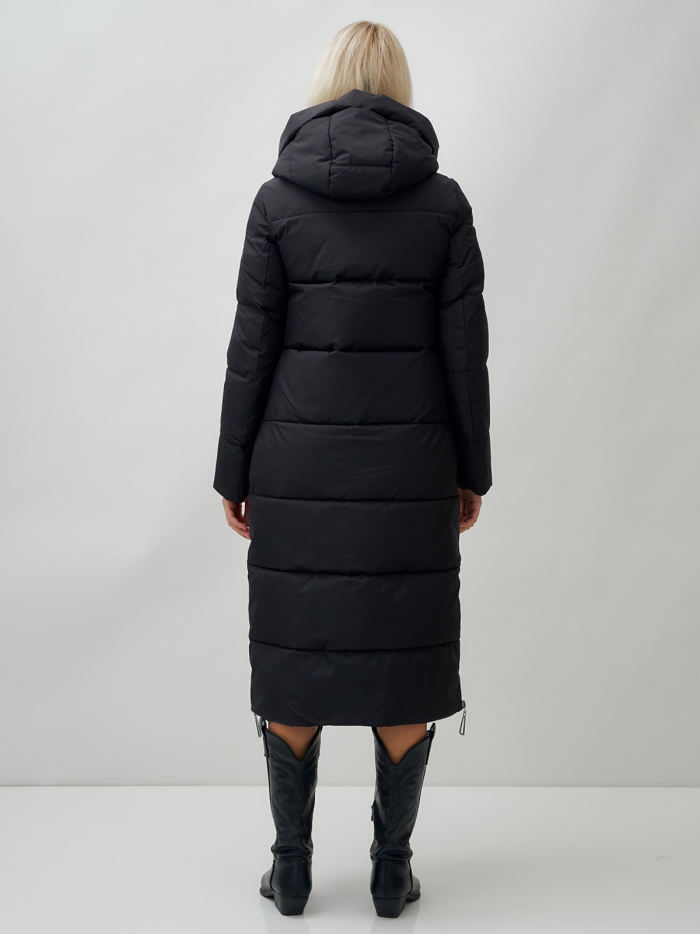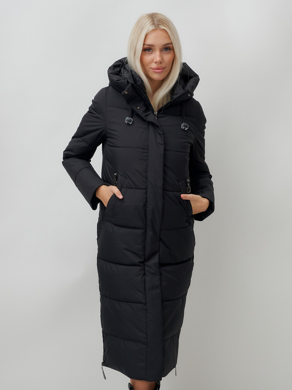 Пальто утепленное стеганное зимнее с капюшоном женское черного цвета 9607Ch — MTFORCE
