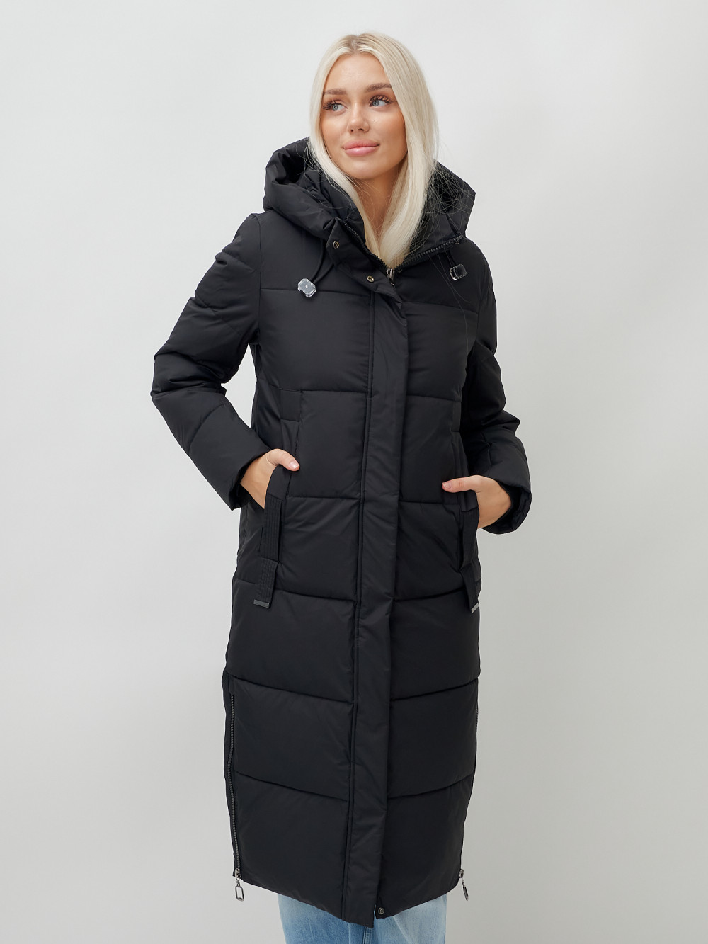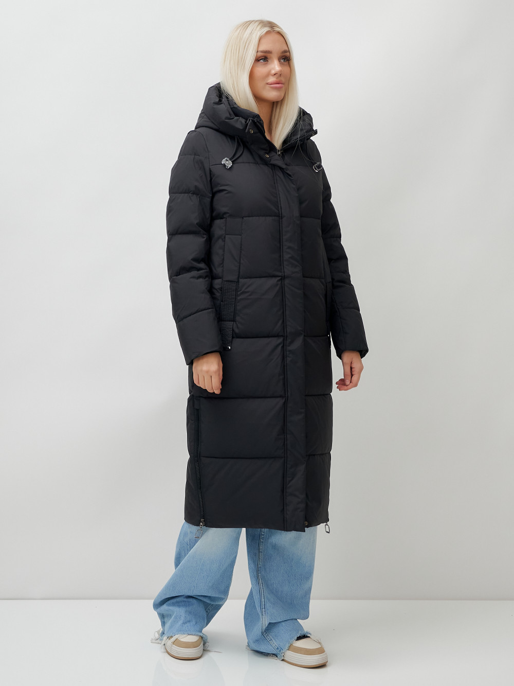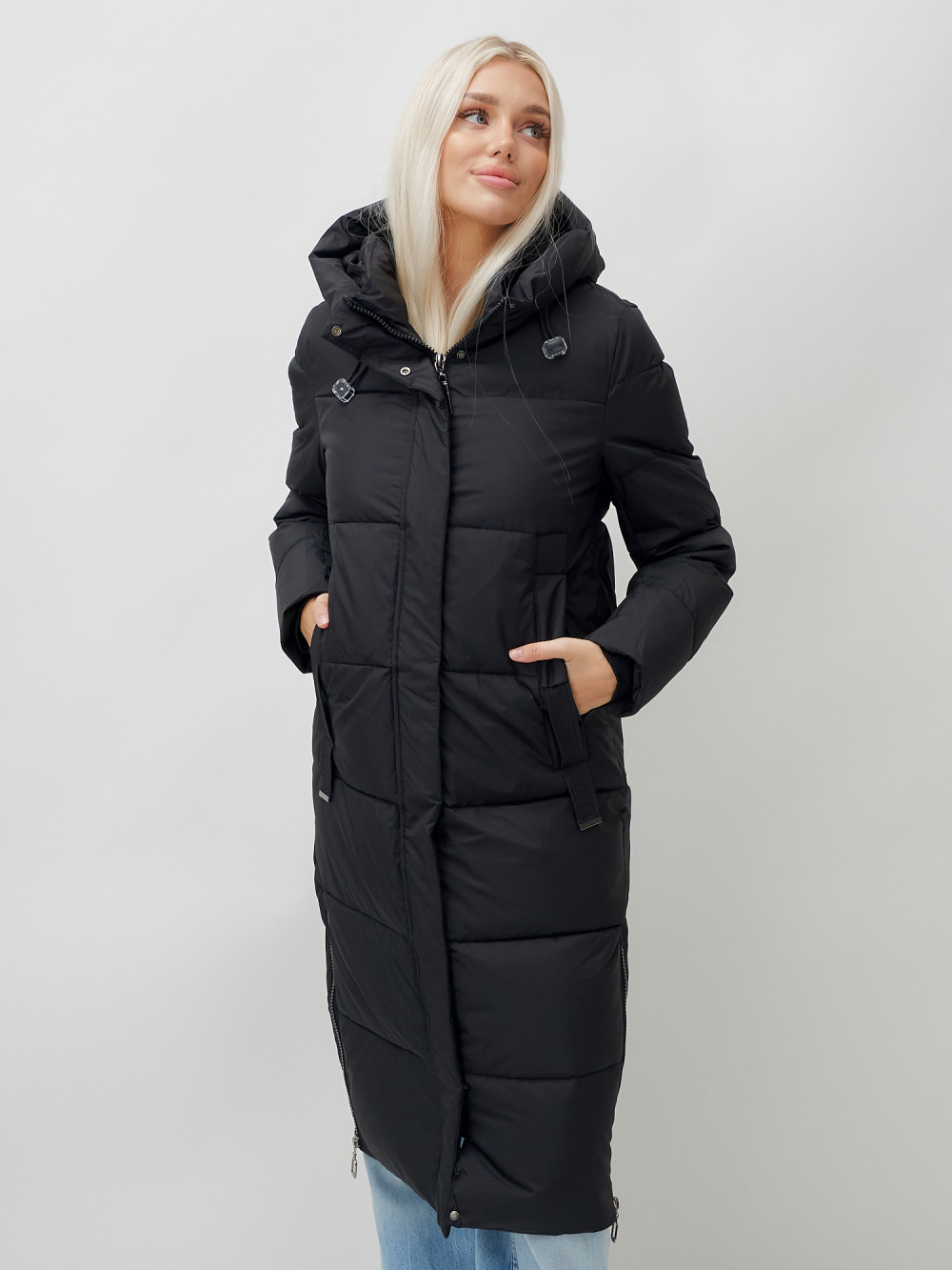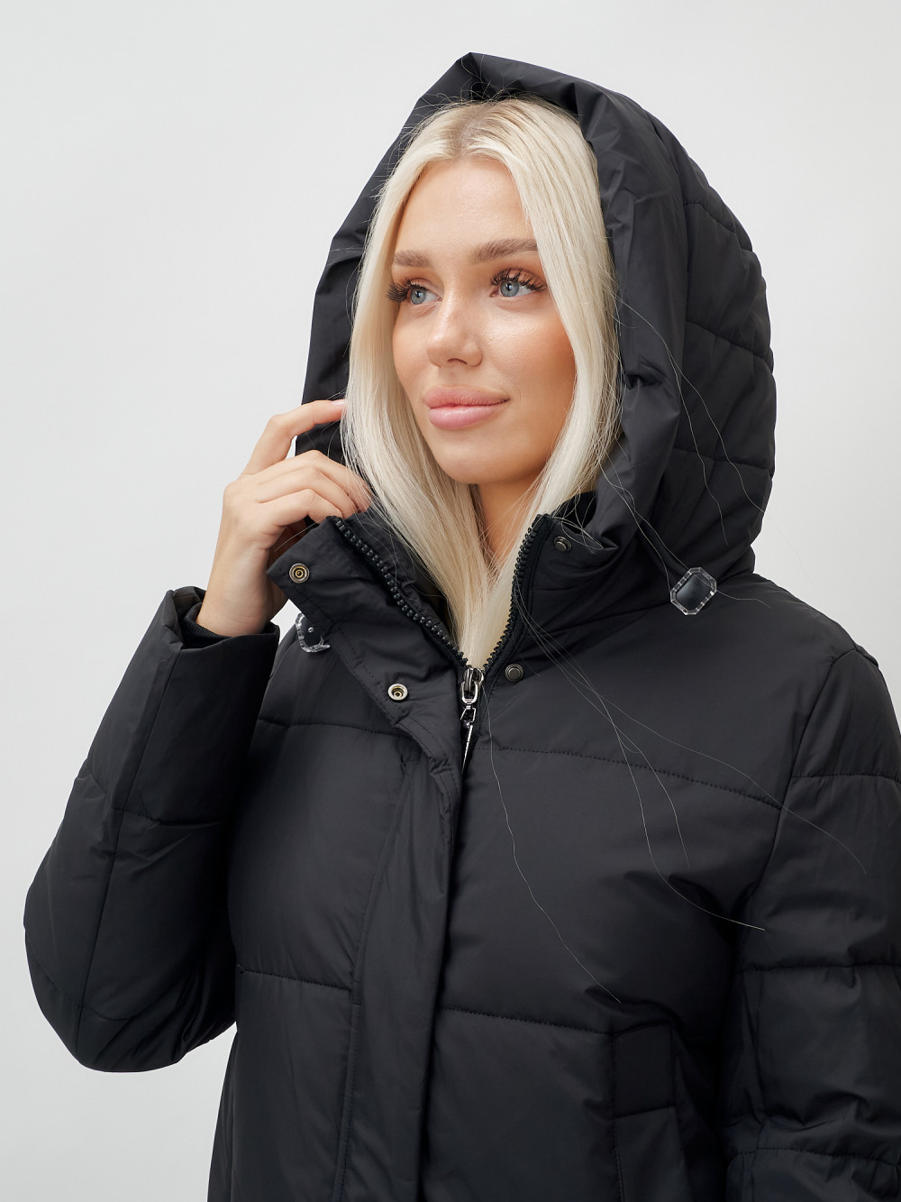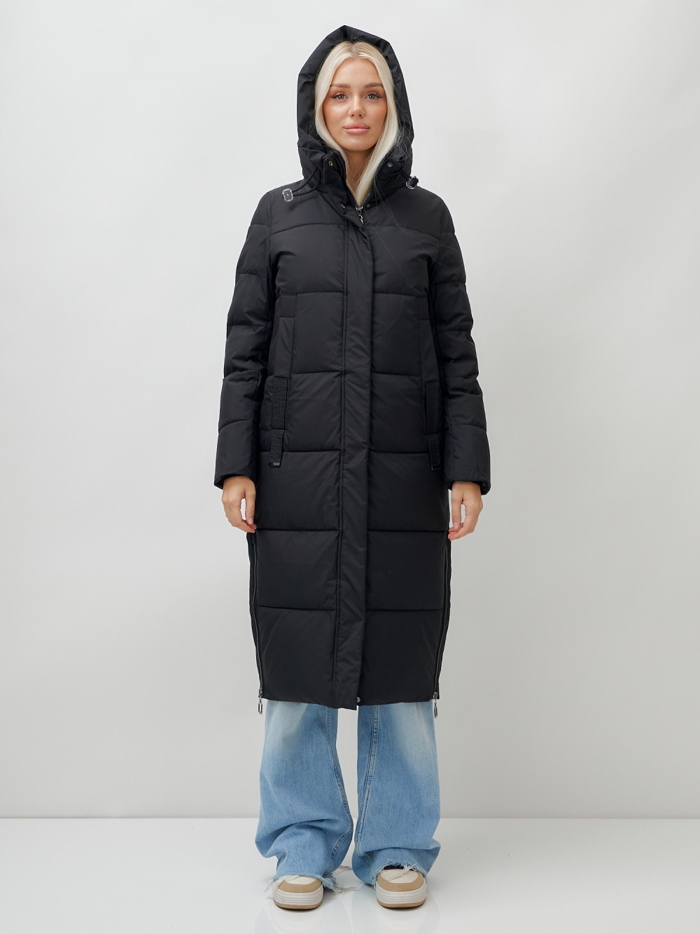 Пальто утепленное стеганное зимнее с капюшоном женское черного цвета 9608Ch — MTFORCE