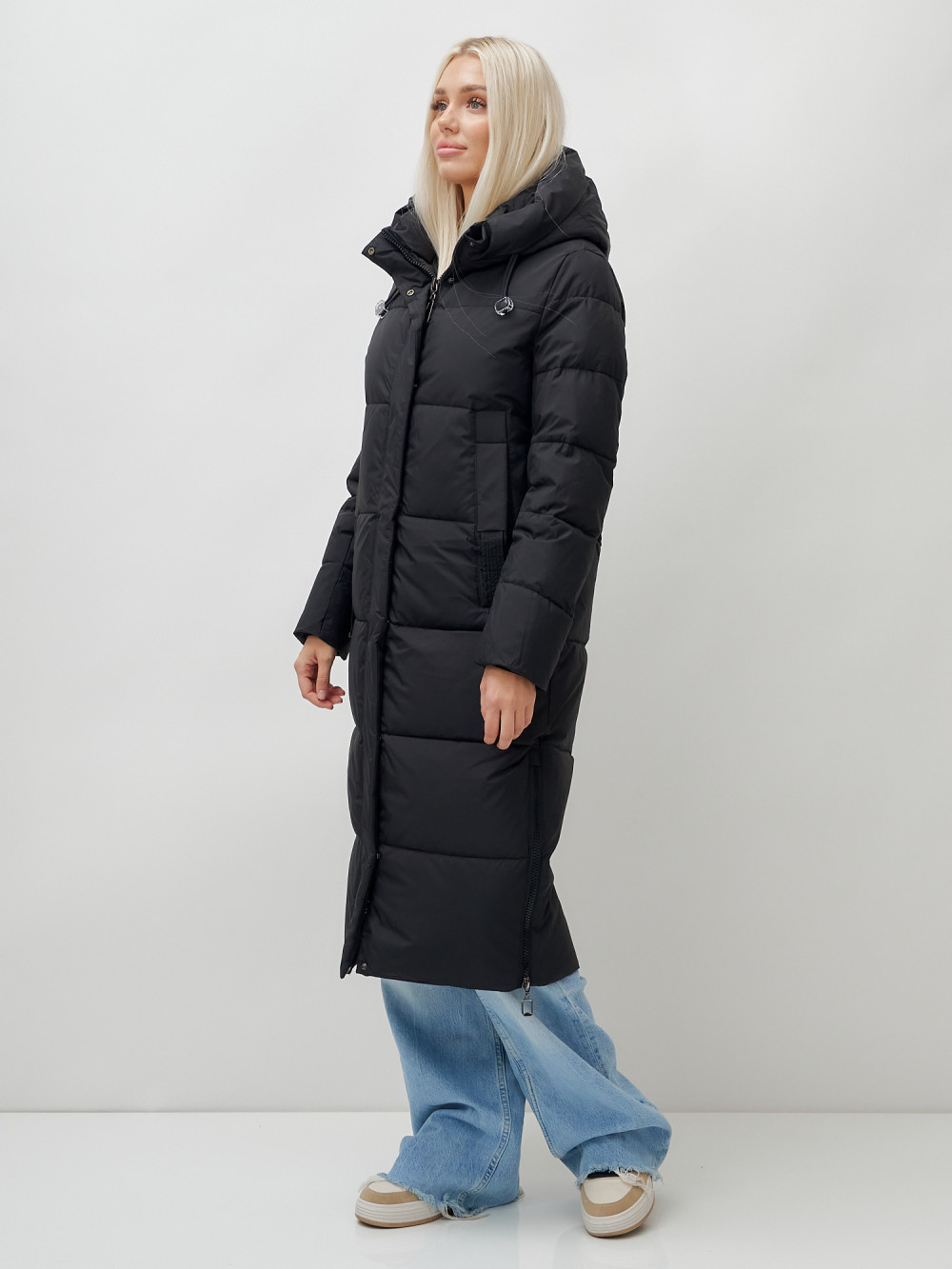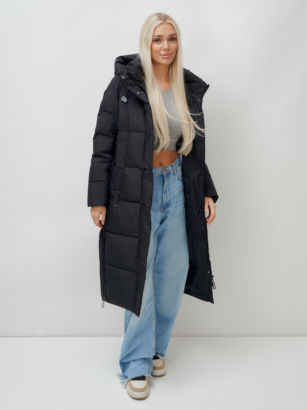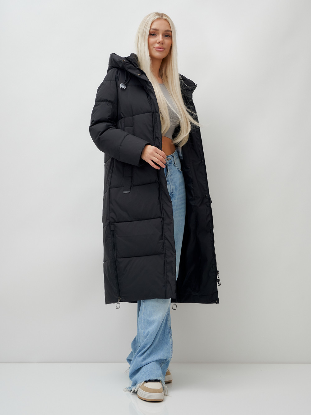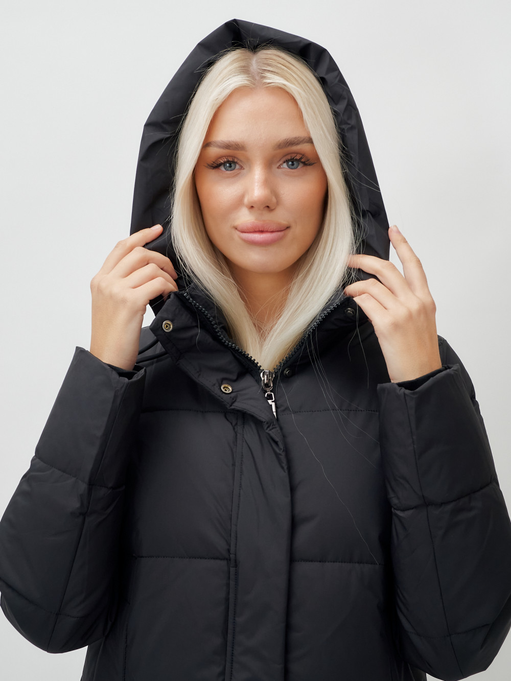 Пальто утепленное стеганное зимнее с капюшоном женское черного цвета 9608Ch — MTFORCE