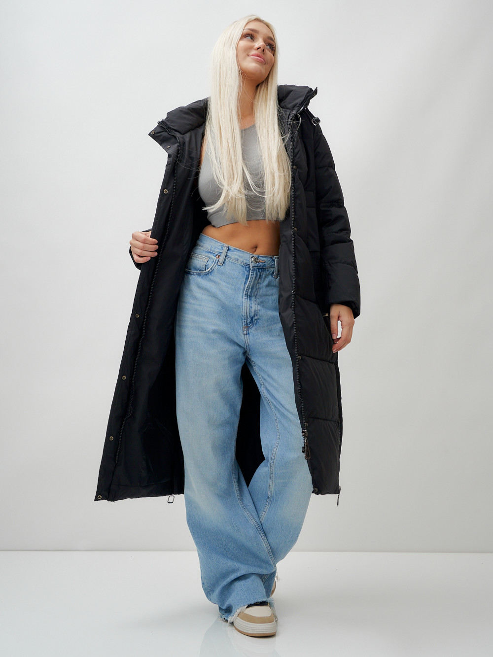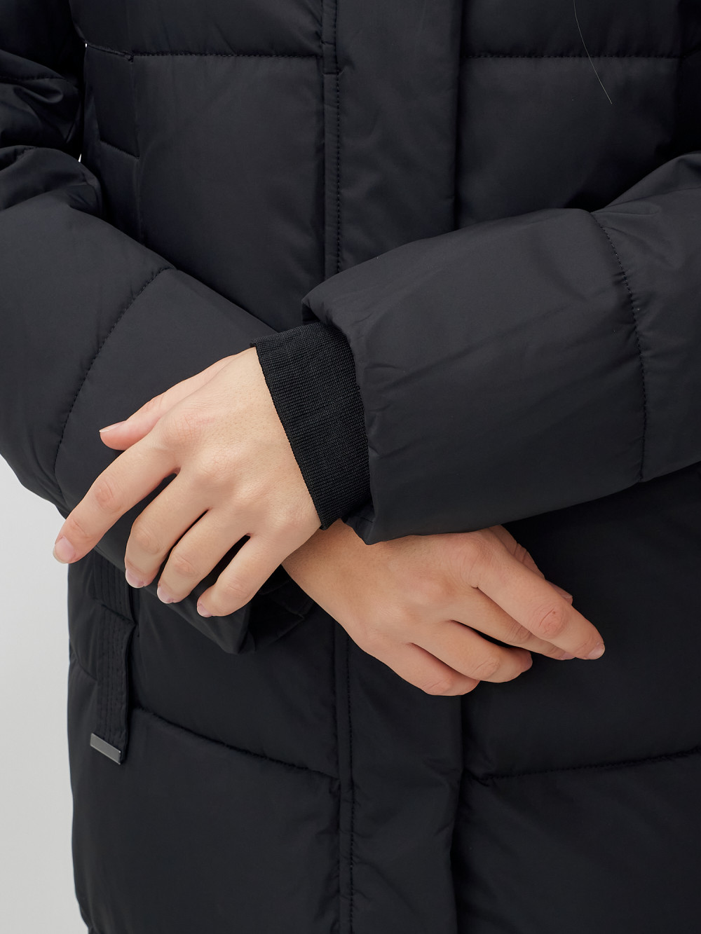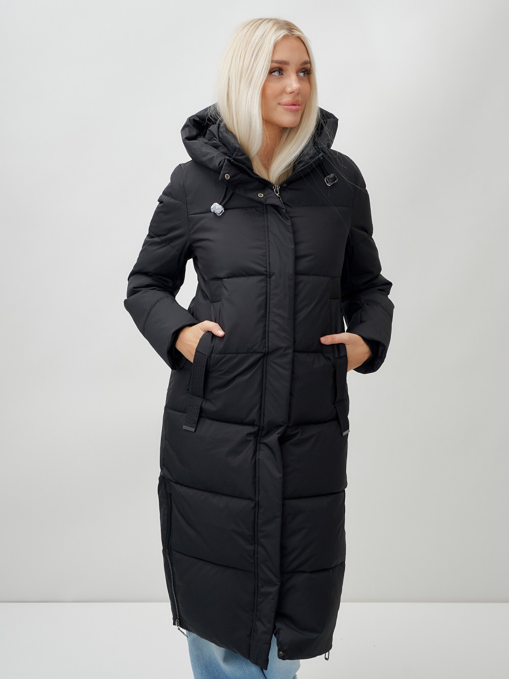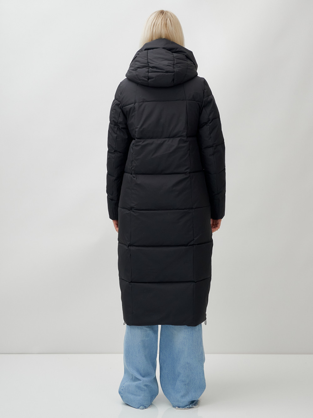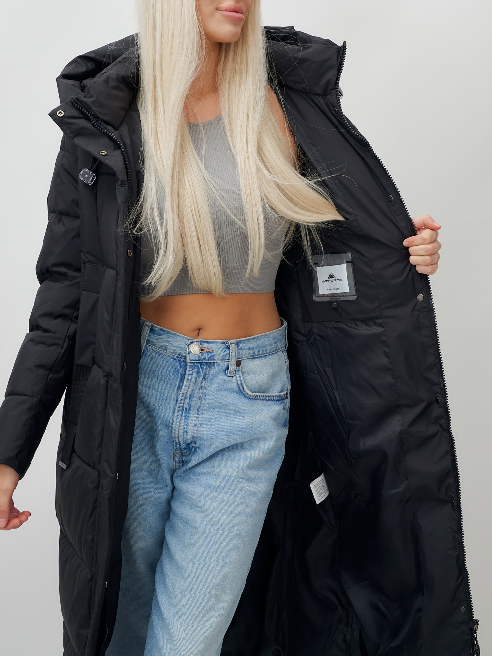 Пальто утепленное стеганное зимнее с капюшоном женское черного цвета 9608Ch — MTFORCE