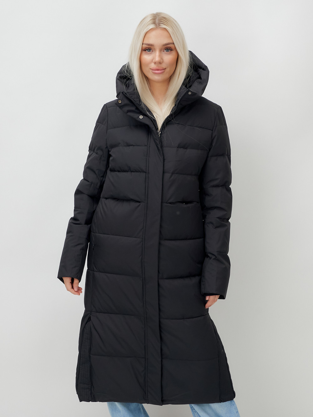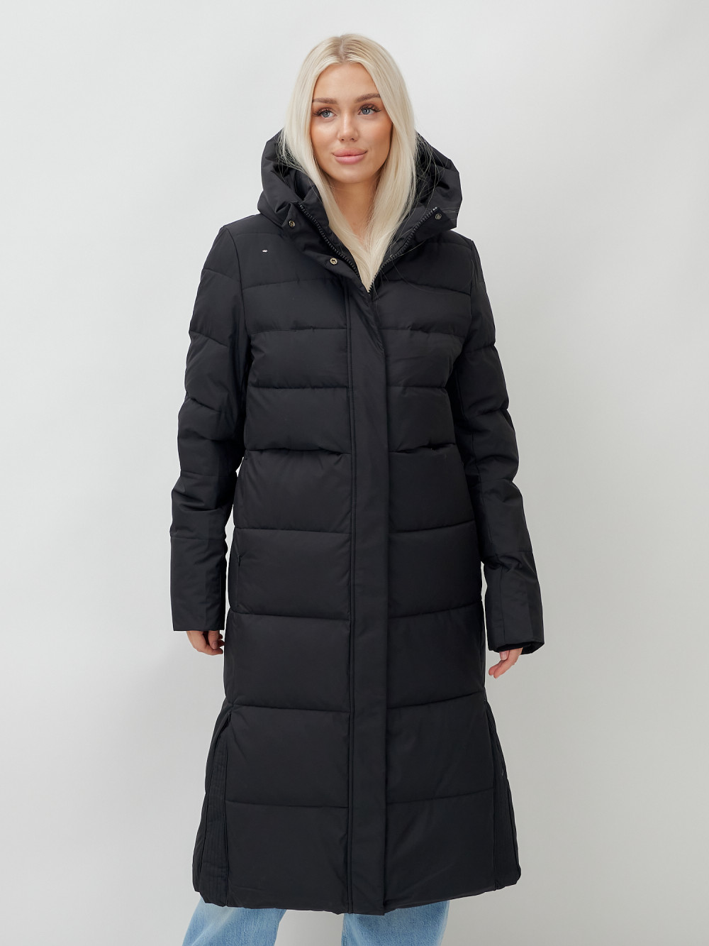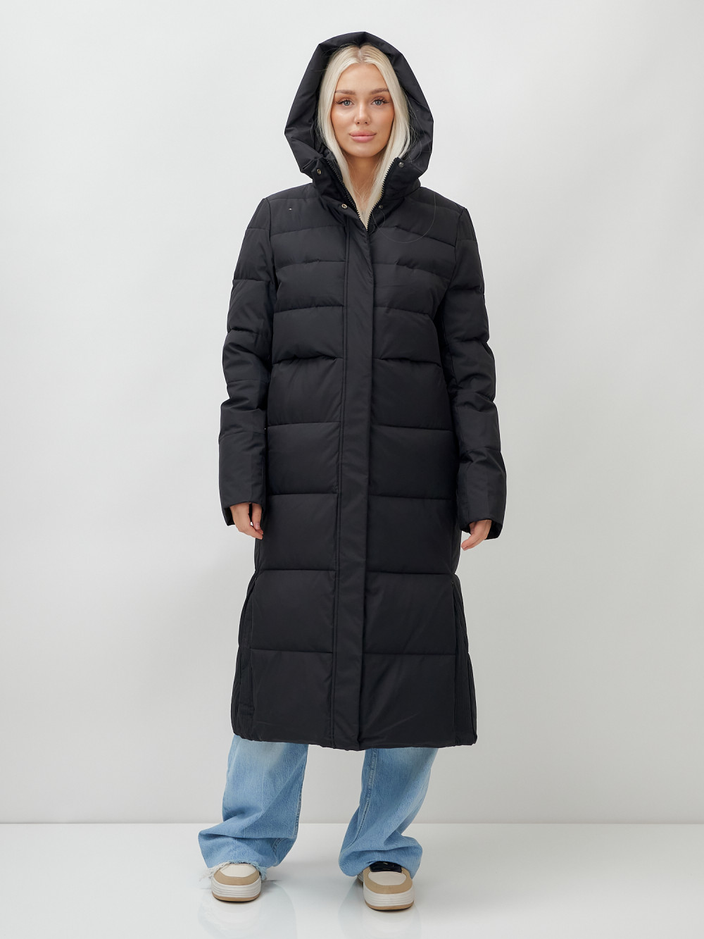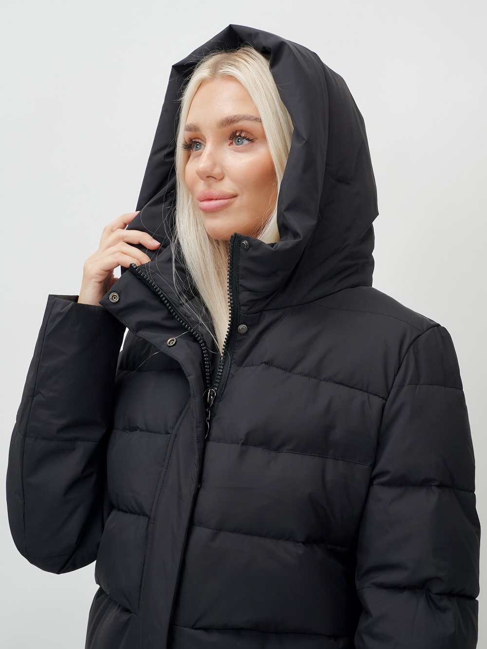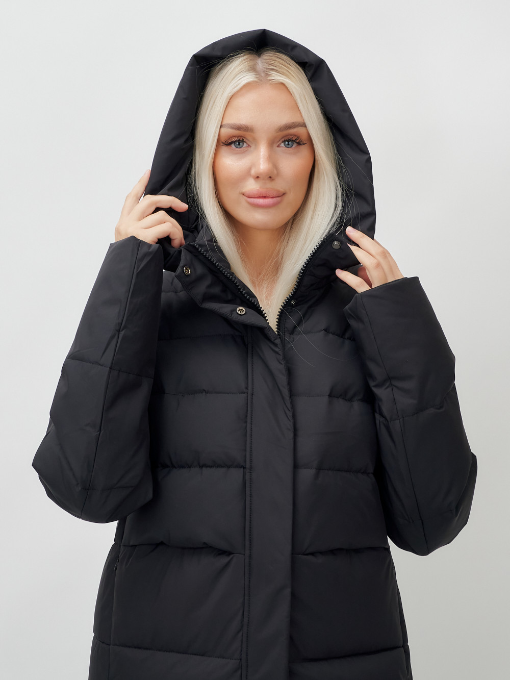 Пальто утепленное стеганное зимнее с капюшоном женское черного цвета 9620Ch — MTFORCE
