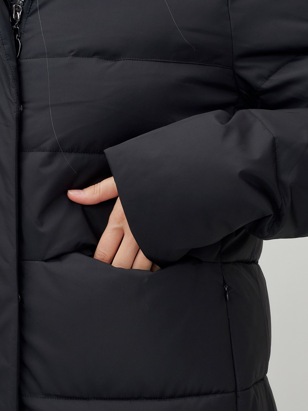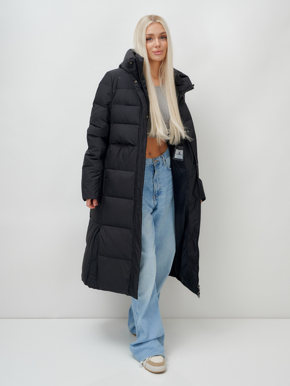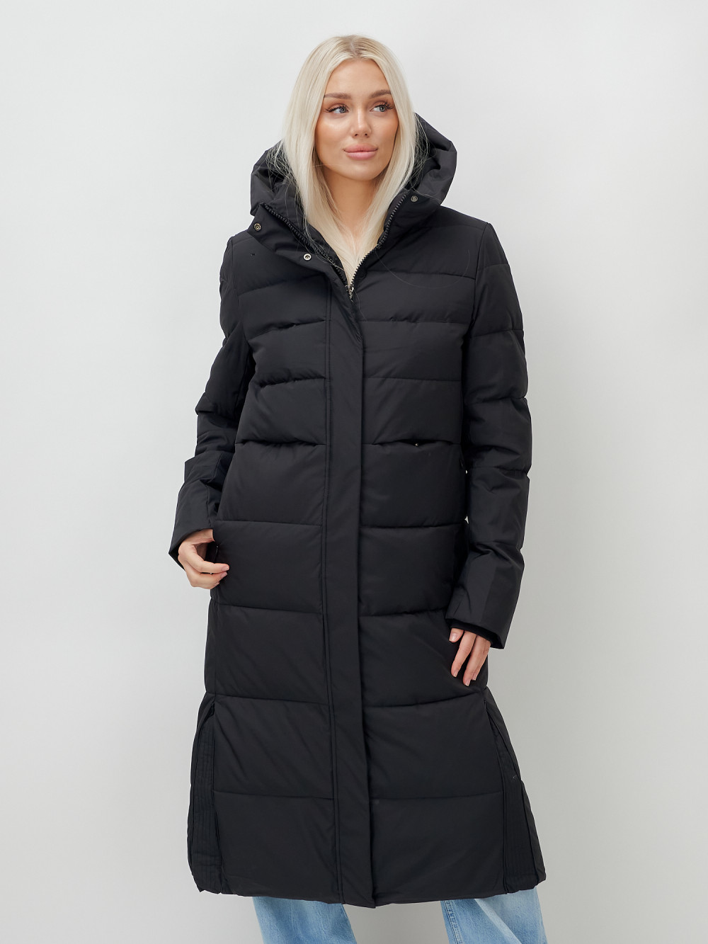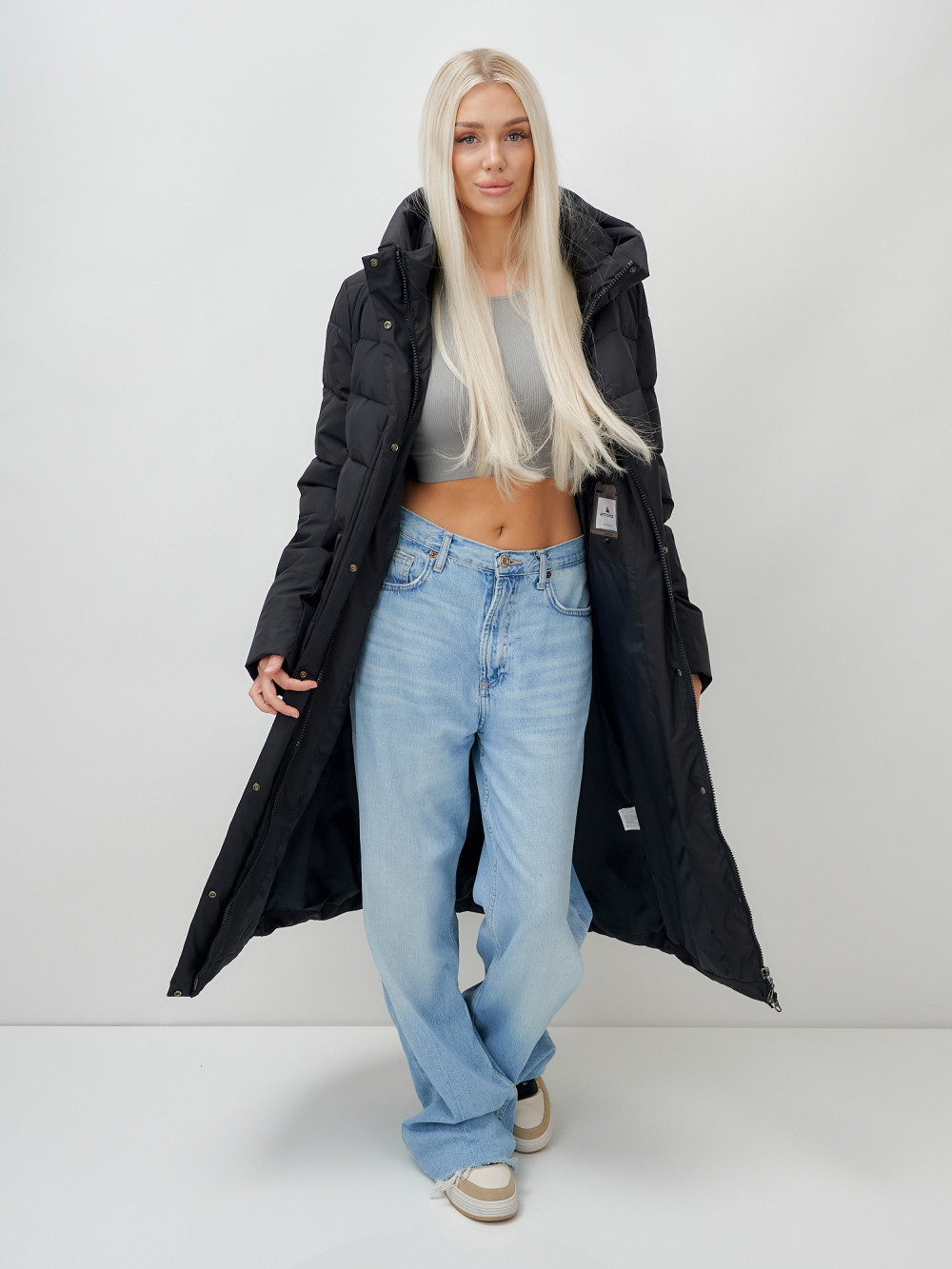 Пальто утепленное стеганное зимнее с капюшоном женское черного цвета 9620Ch — MTFORCE