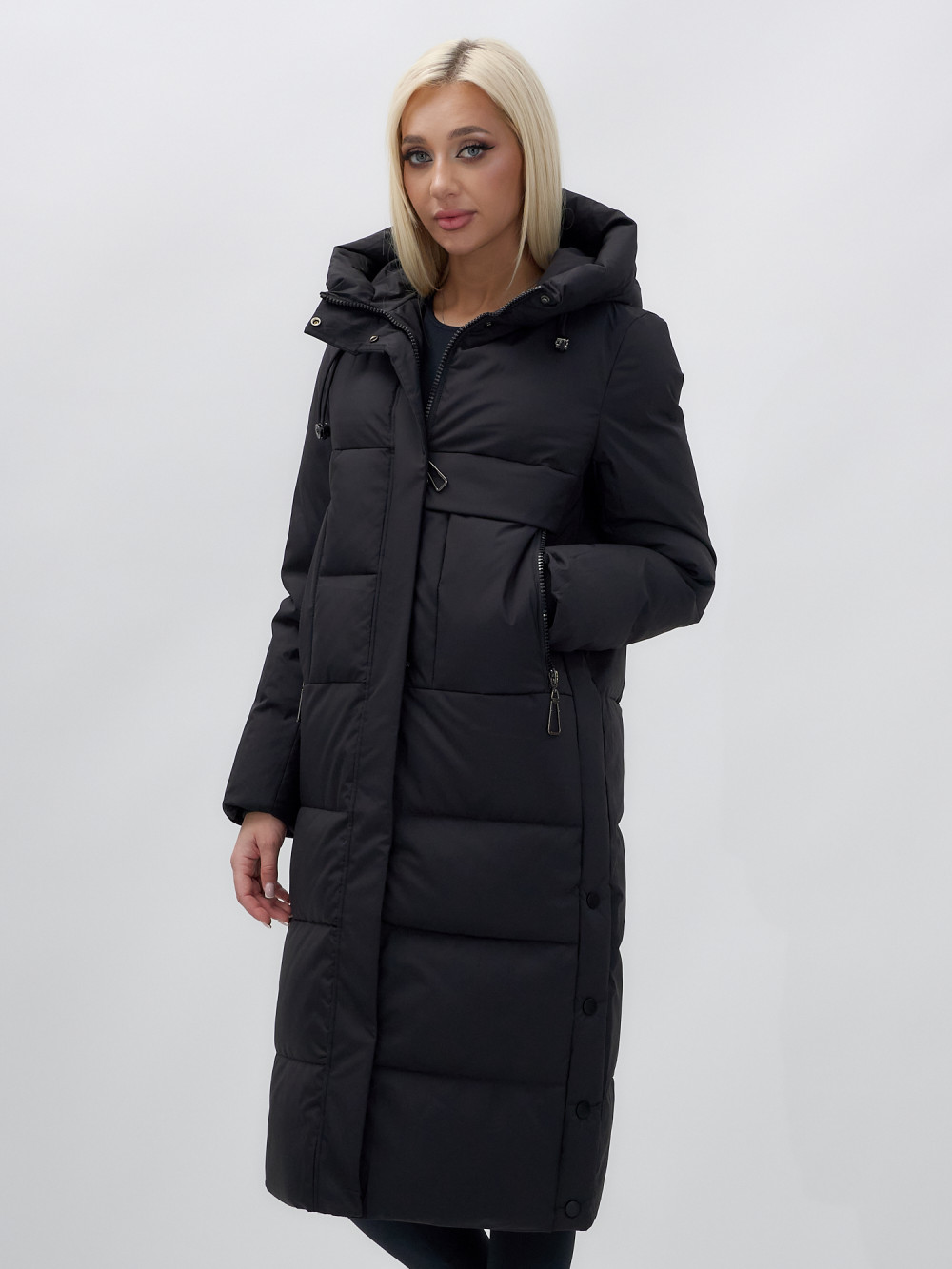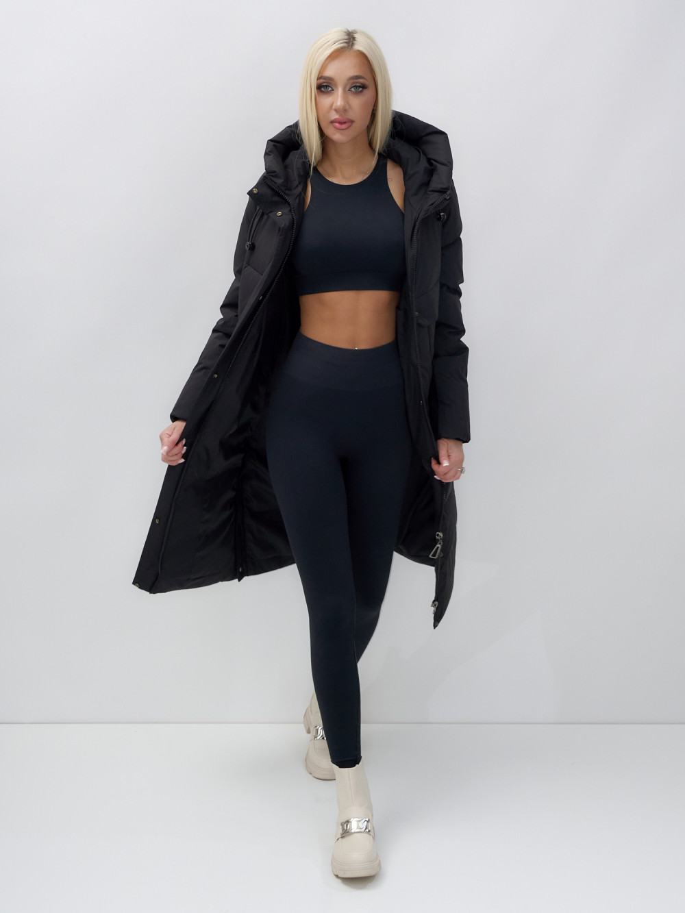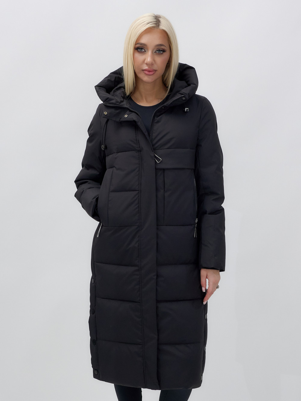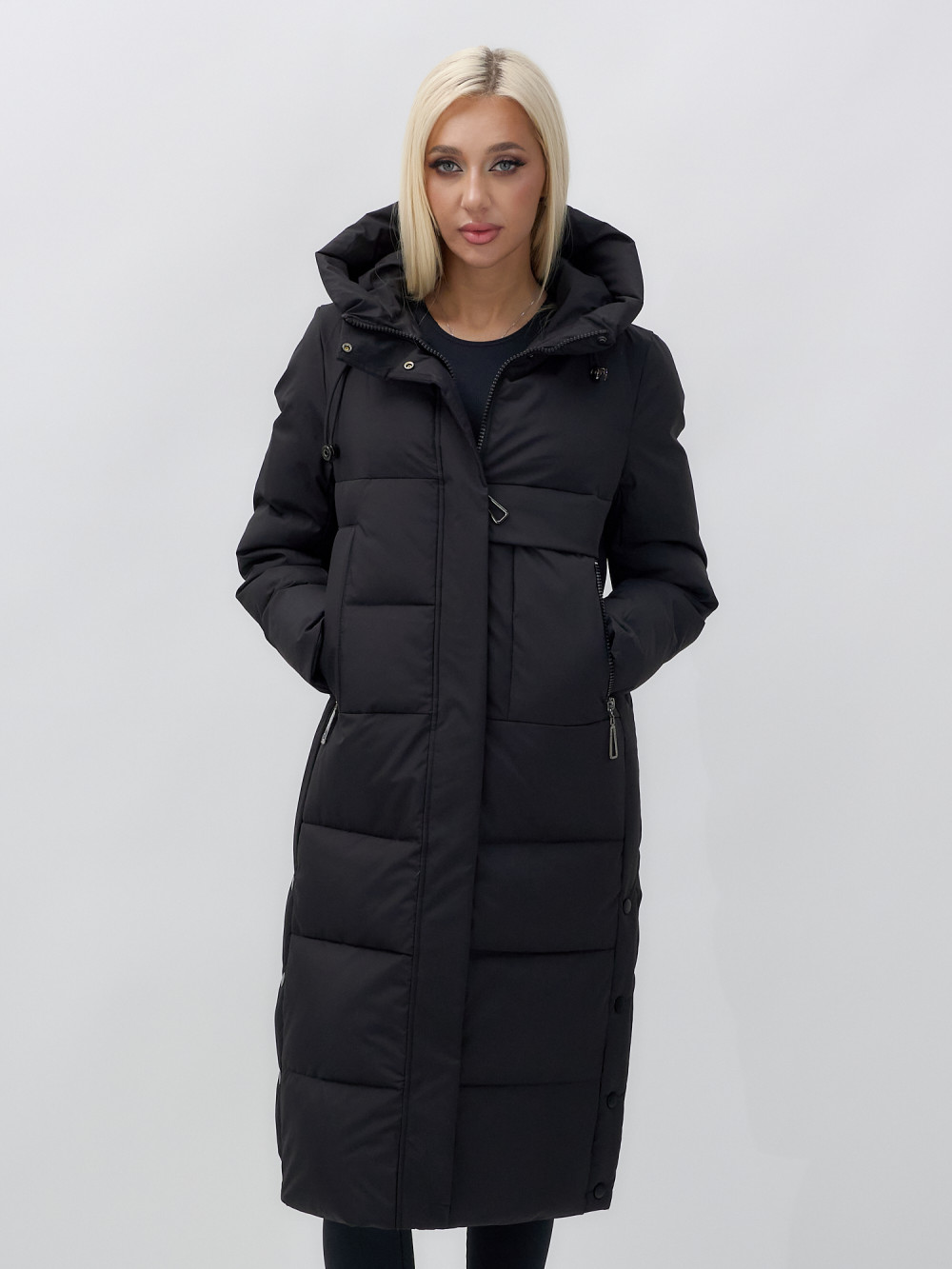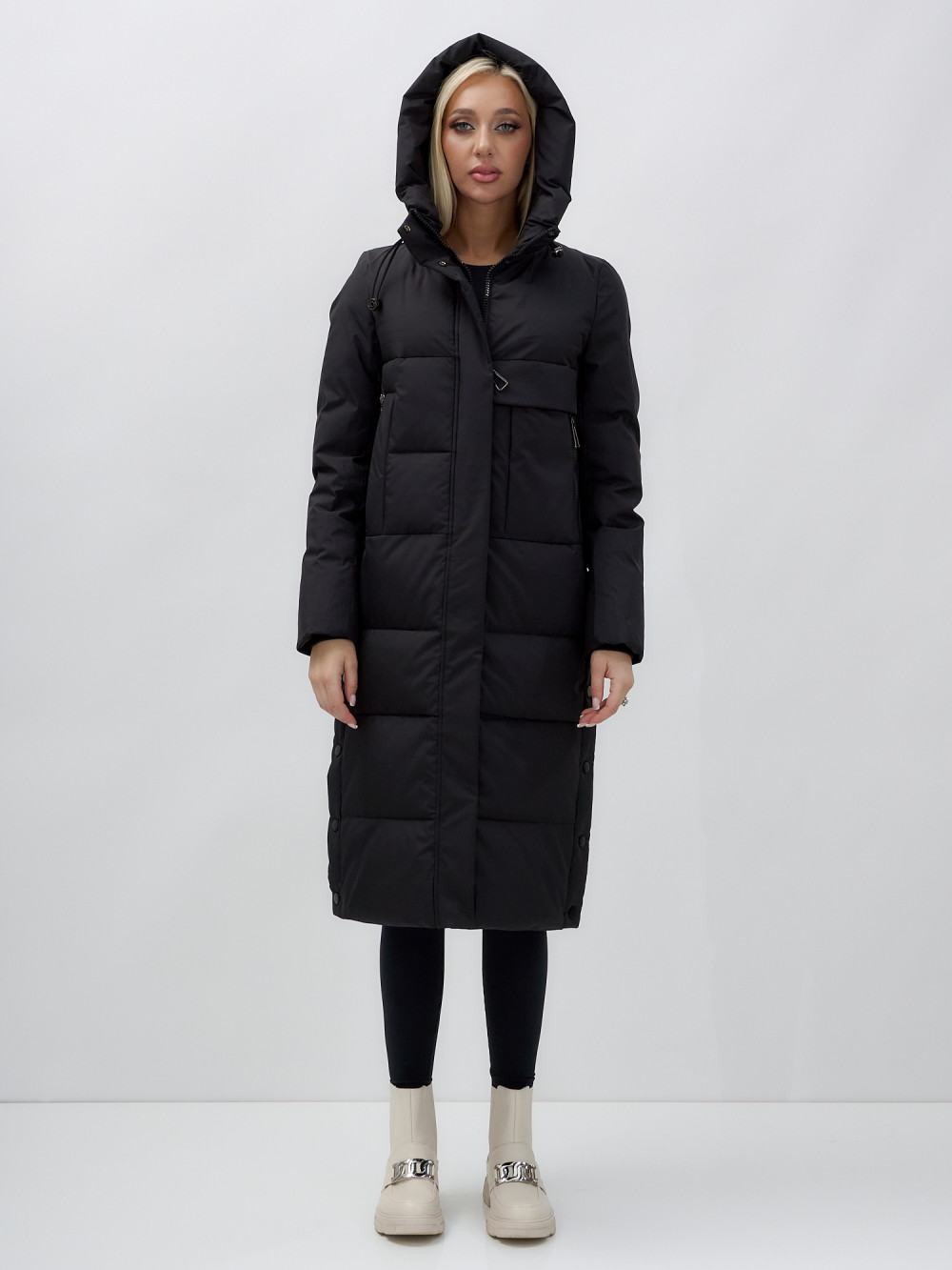Пальто утепленное стеганное зимнее с капюшоном женское черного цвета 9628Ch — MTFORCE