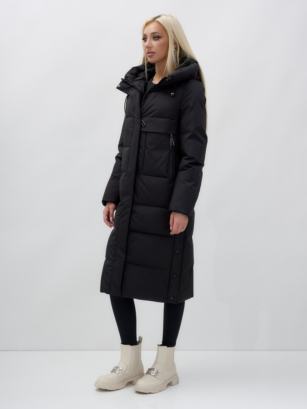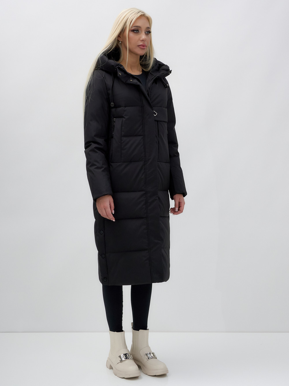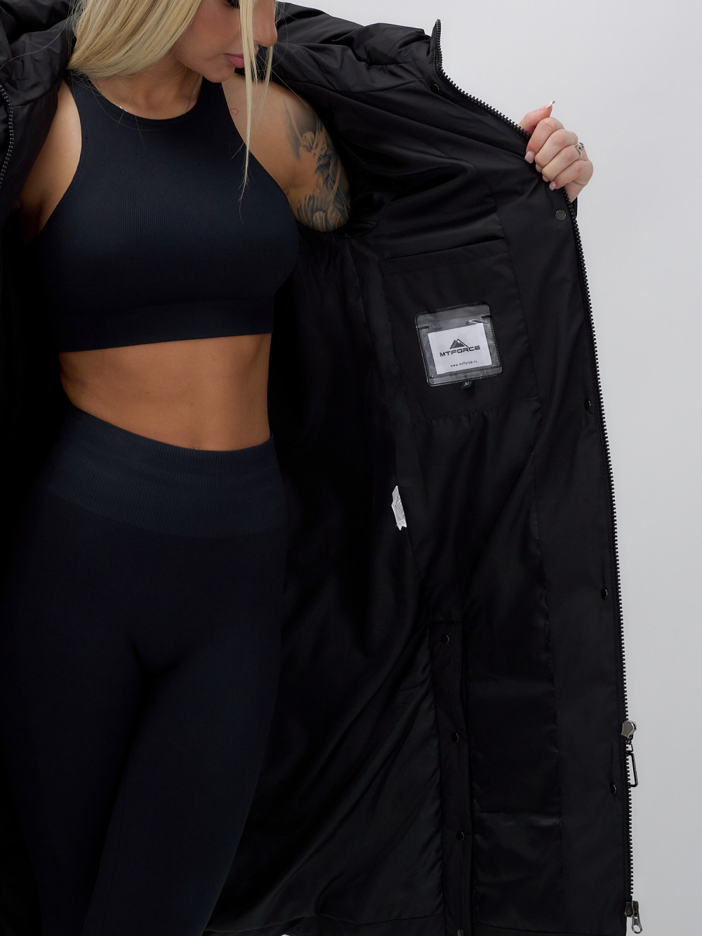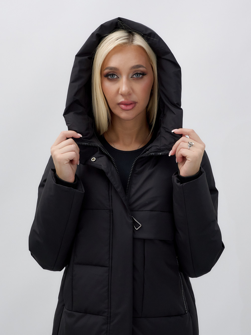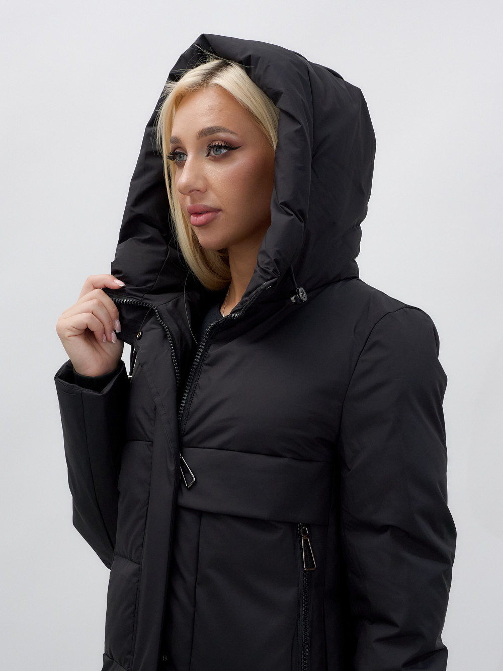 Пальто утепленное стеганное зимнее с капюшоном женское черного цвета 9628Ch — MTFORCE