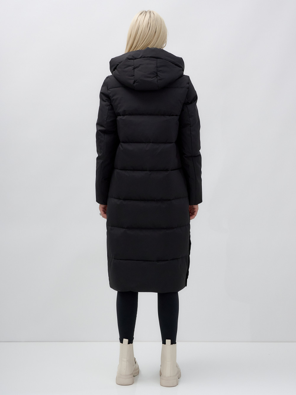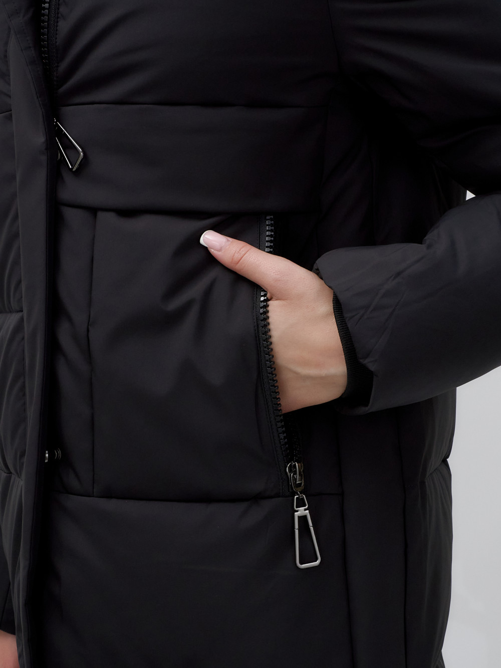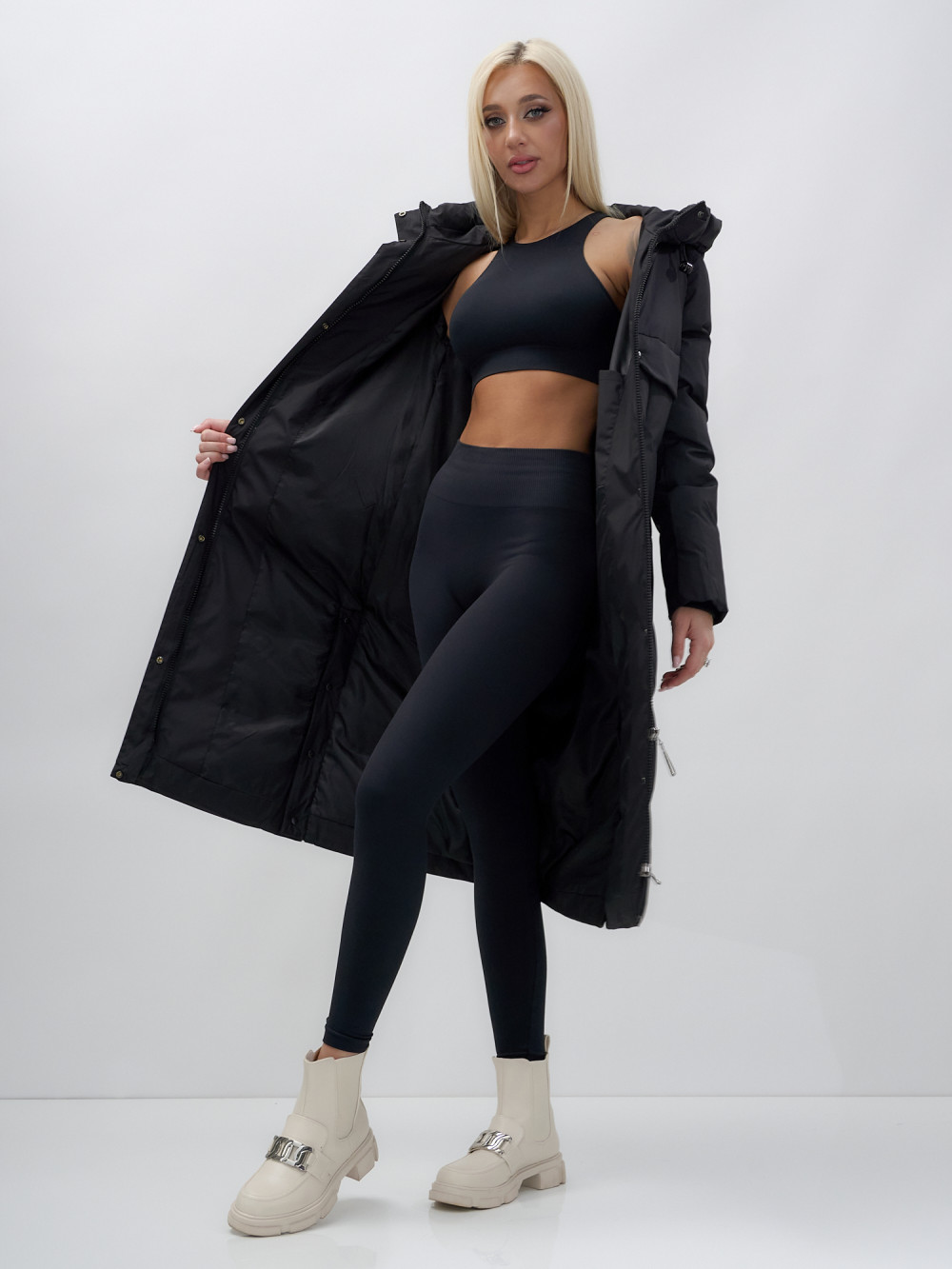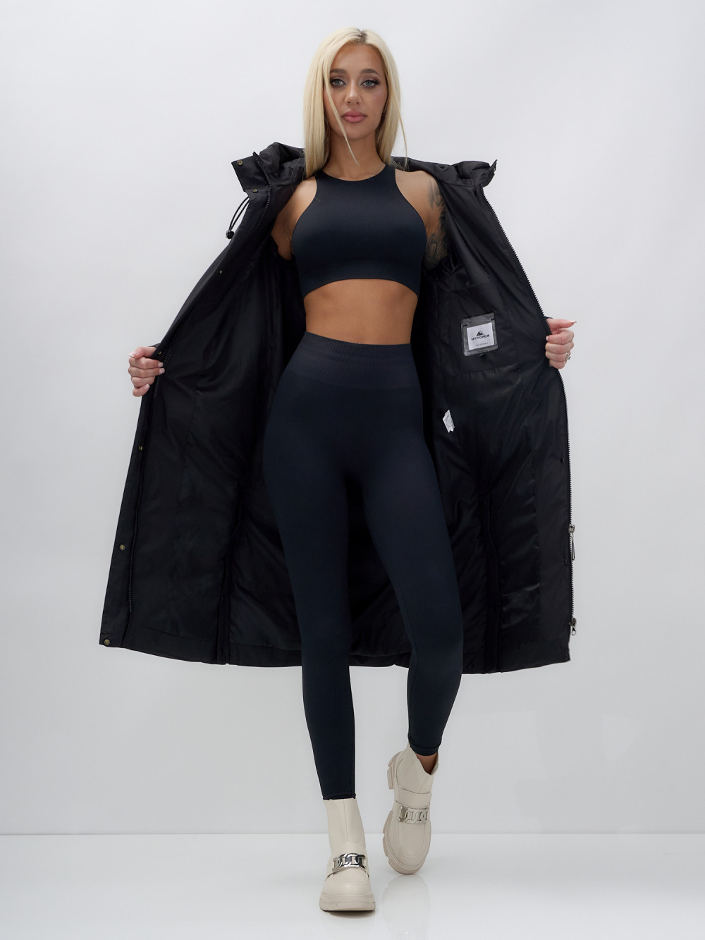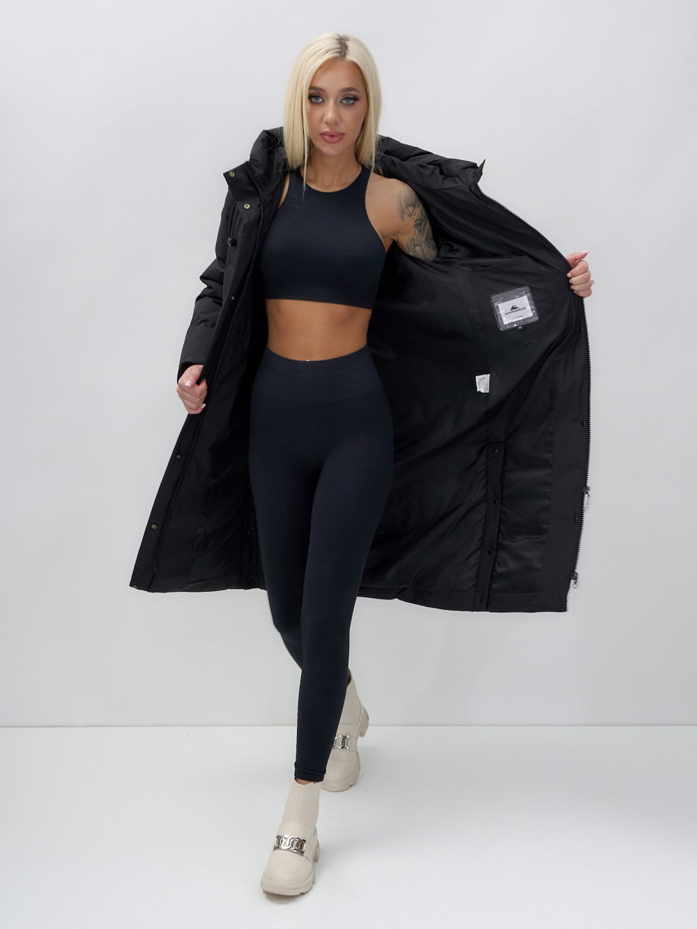 Пальто утепленное стеганное зимнее с капюшоном женское черного цвета 9628Ch — MTFORCE