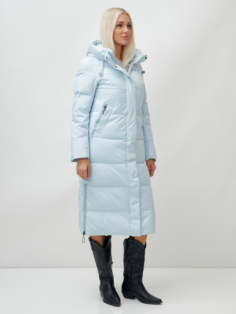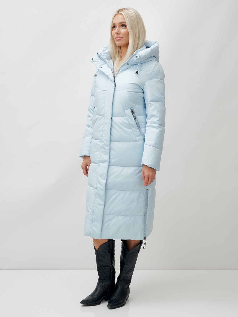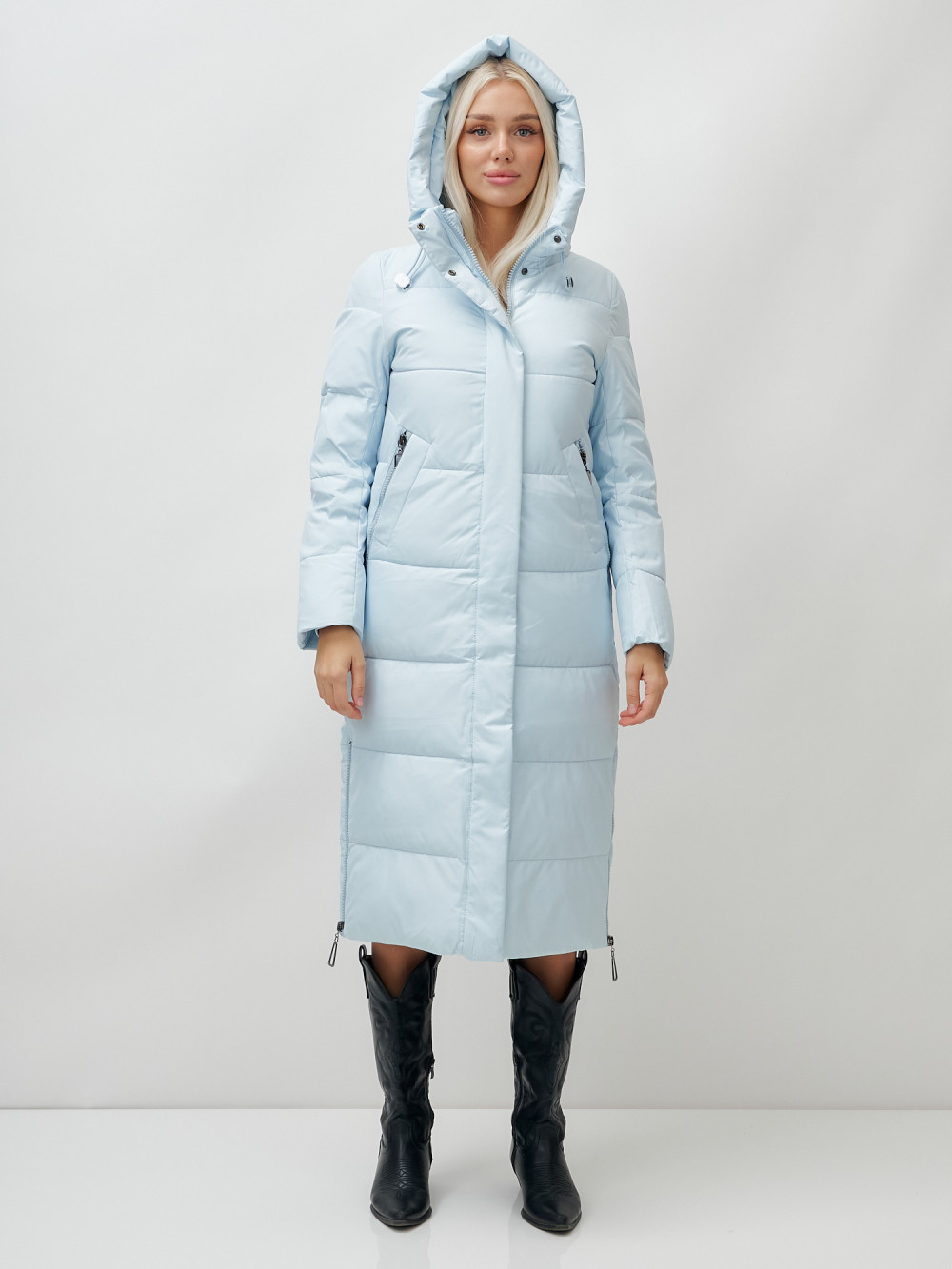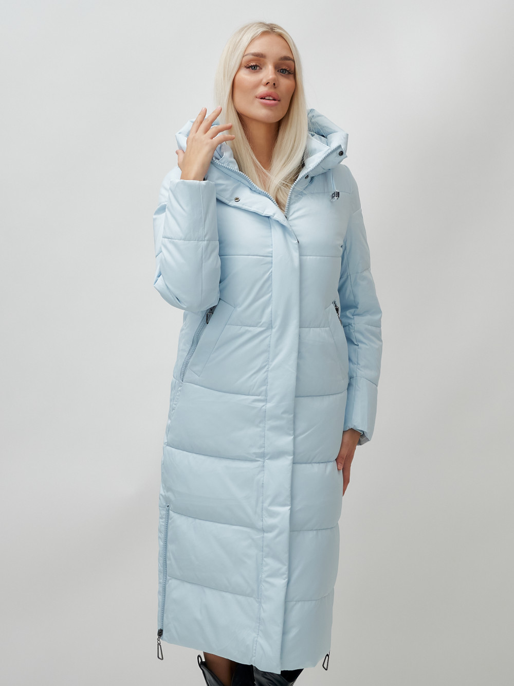 Пальто утепленное стеганное зимнее с капюшоном женское голубого цвета 9607Gl — MTFORCE