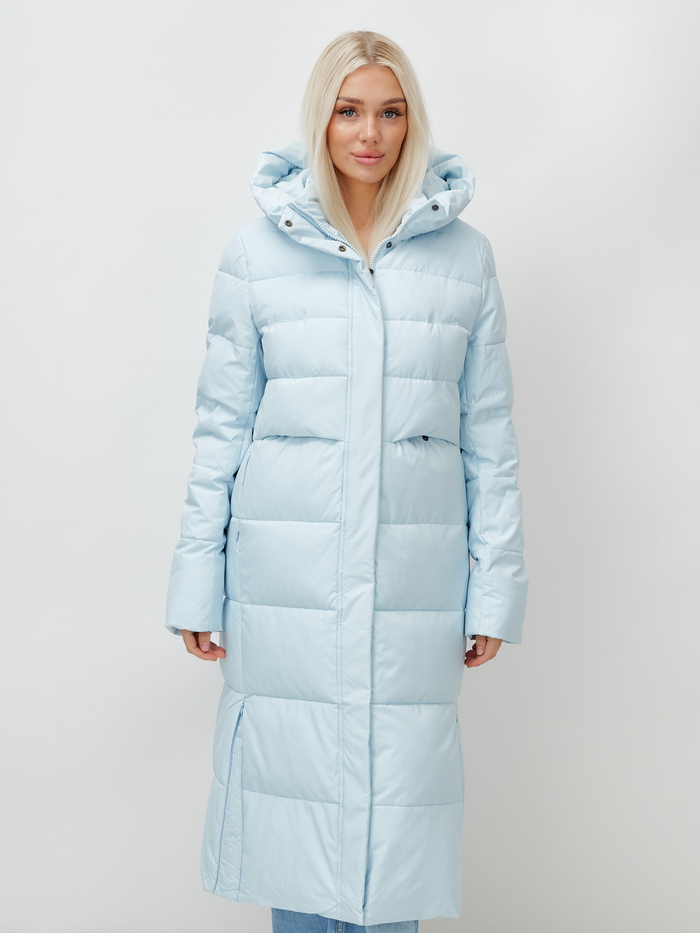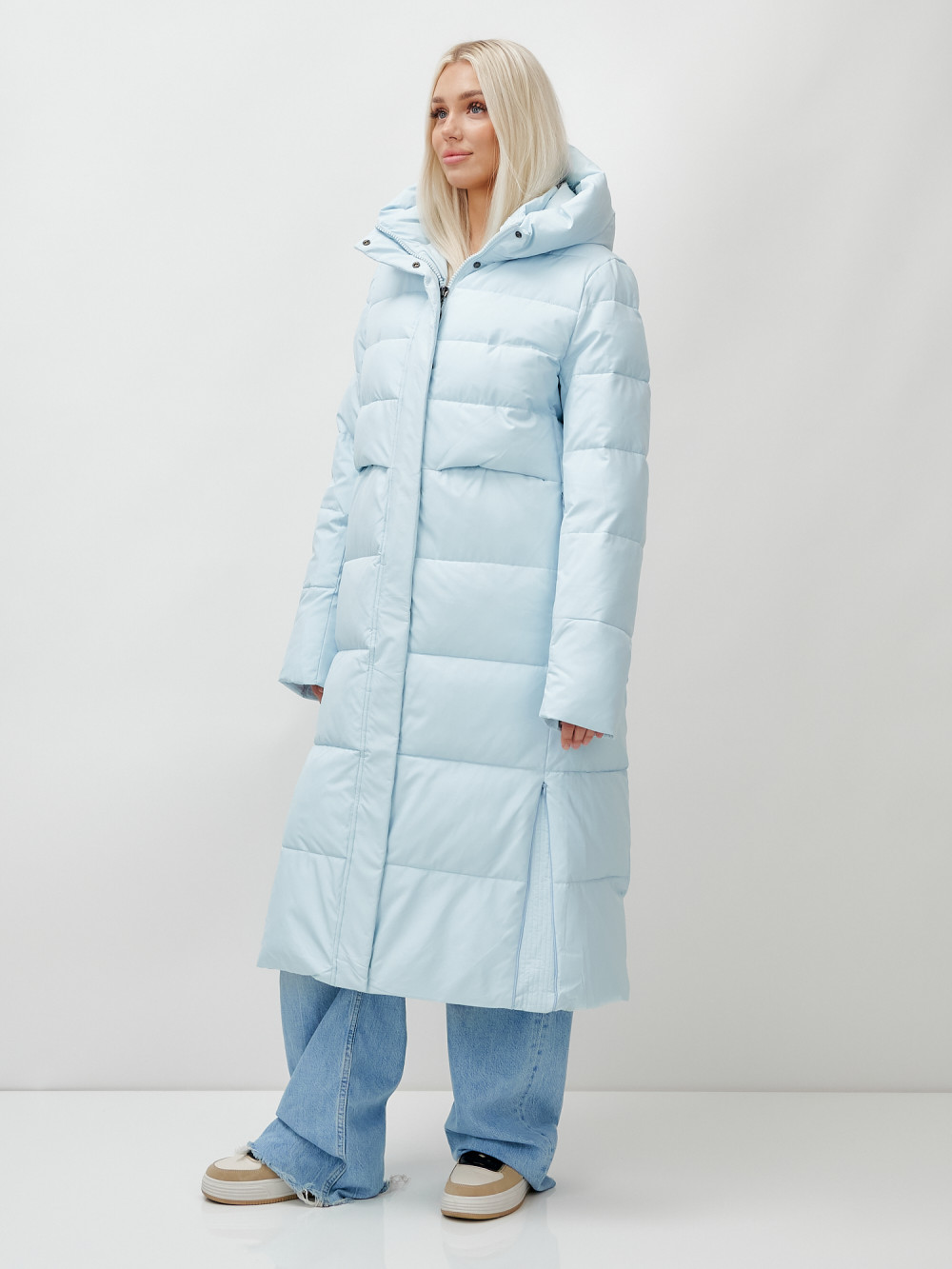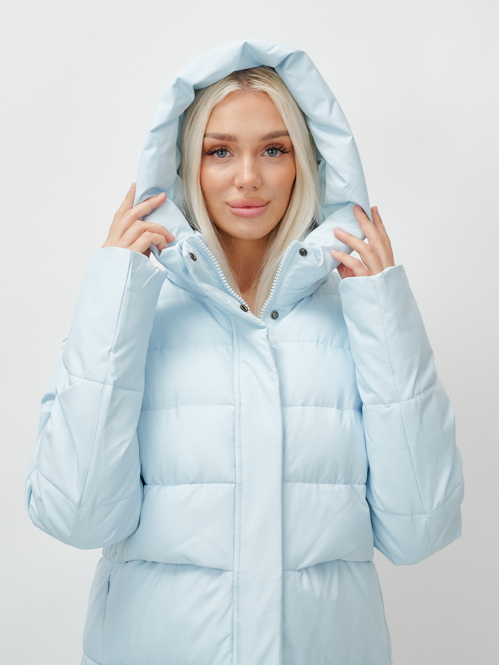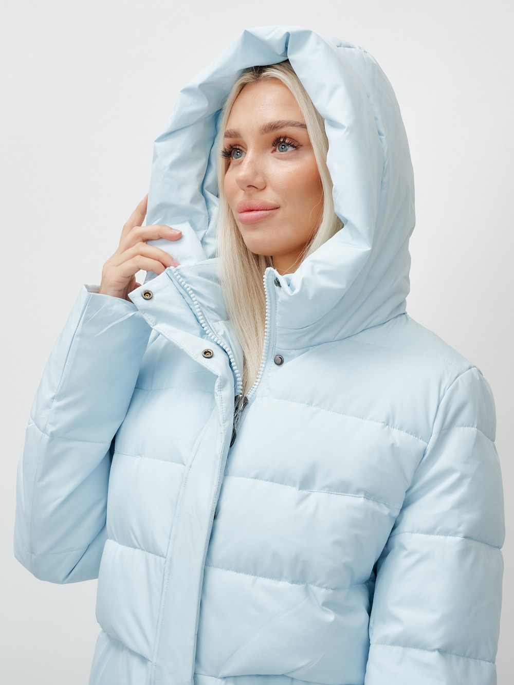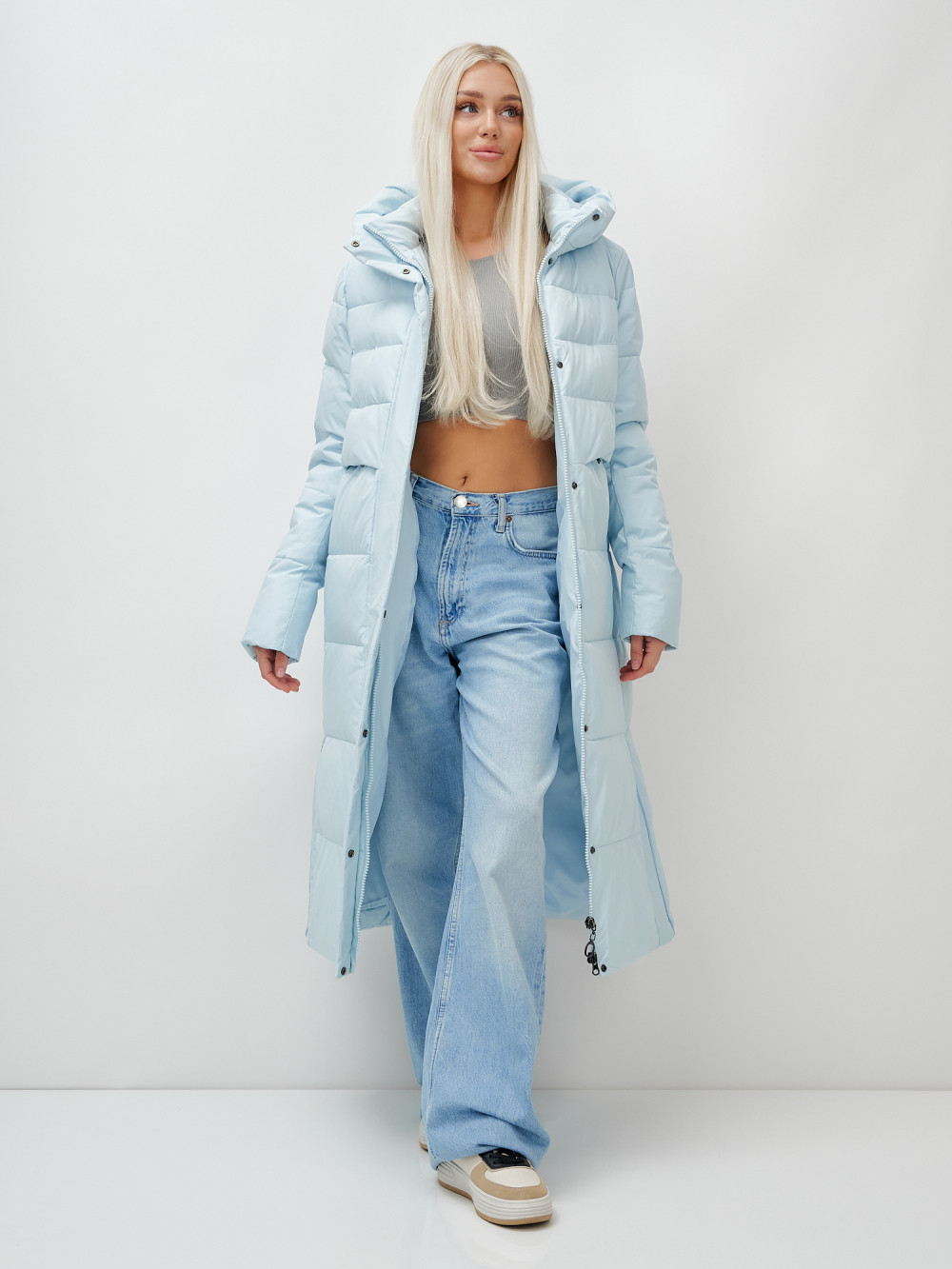 Пальто утепленное стеганное зимнее с капюшоном женское голубого цвета 9620Gl — MTFORCE
