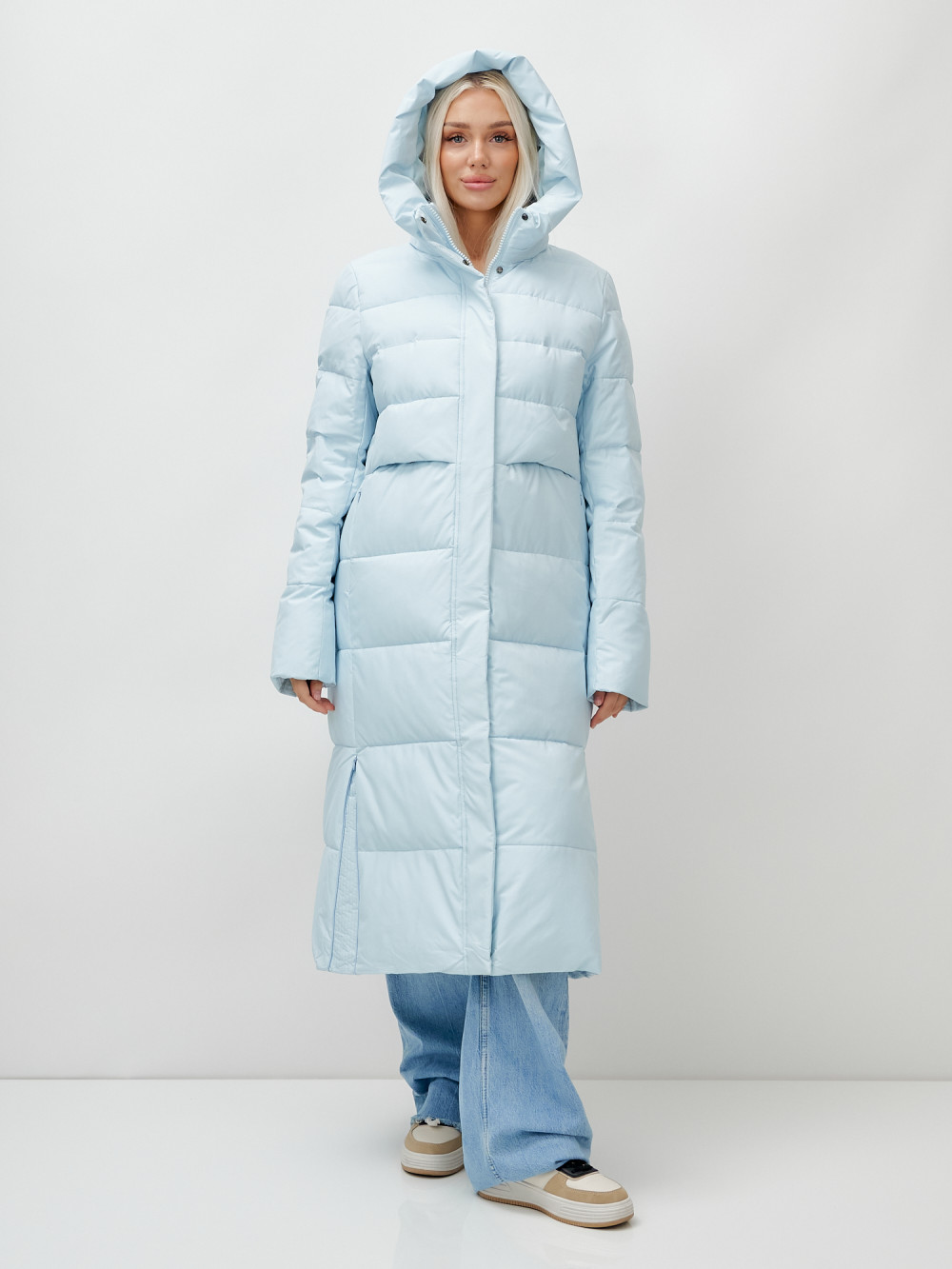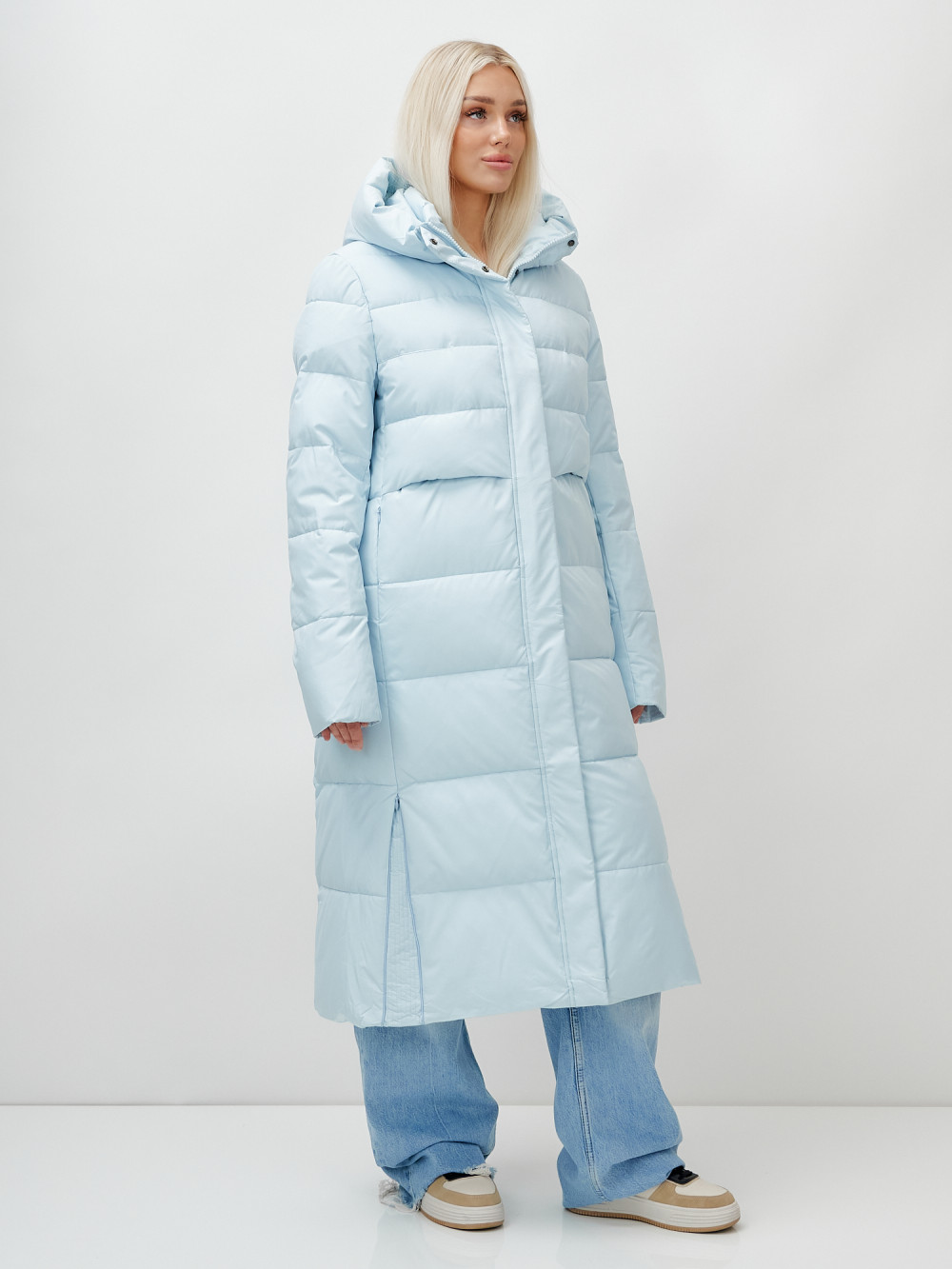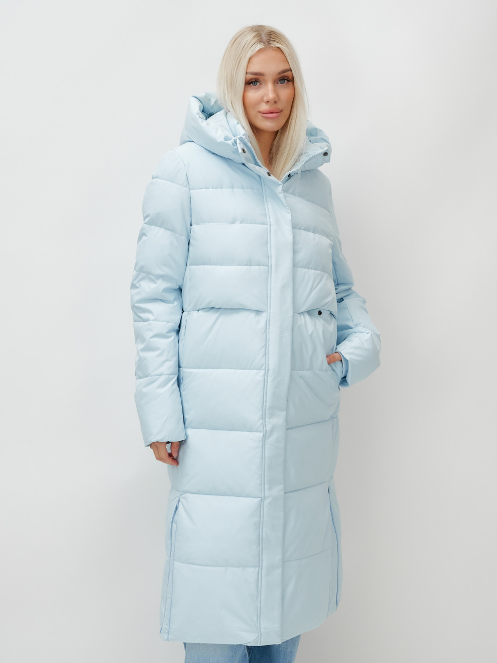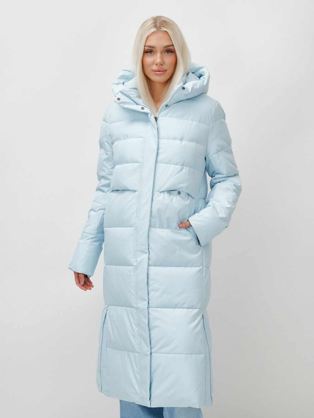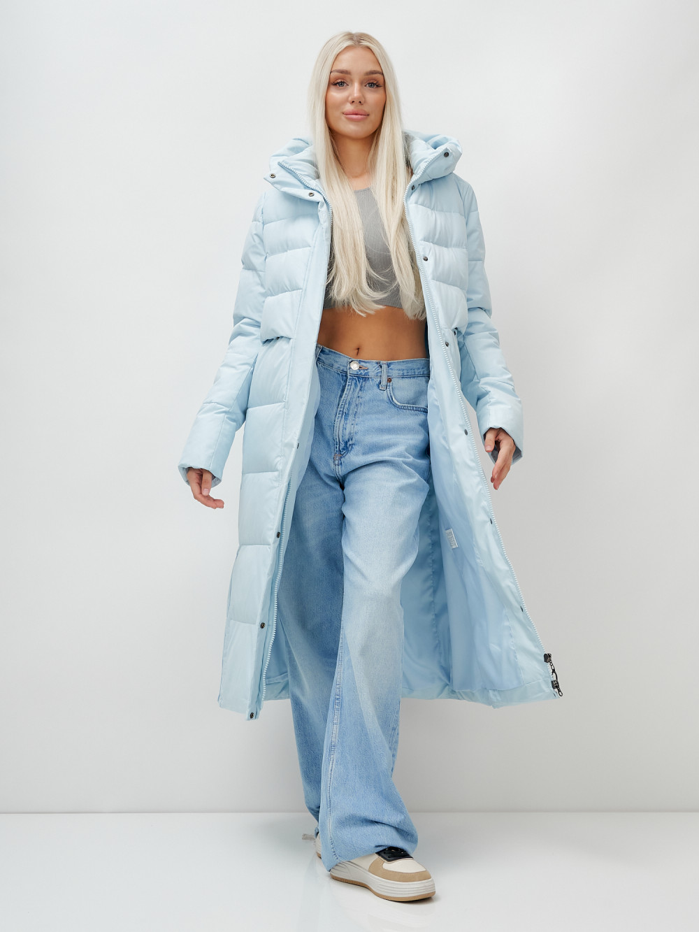 Пальто утепленное стеганное зимнее с капюшоном женское голубого цвета 9620Gl — MTFORCE